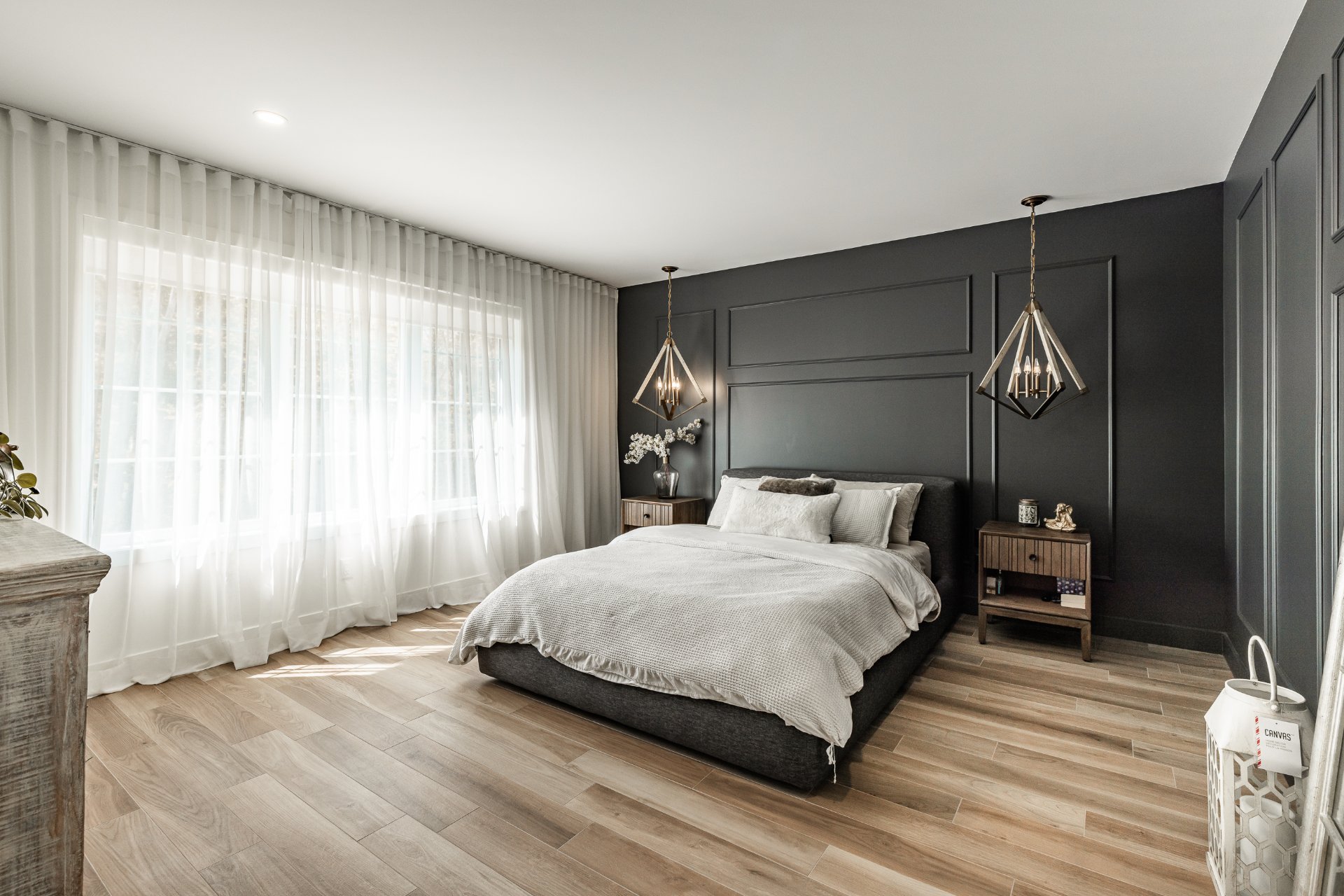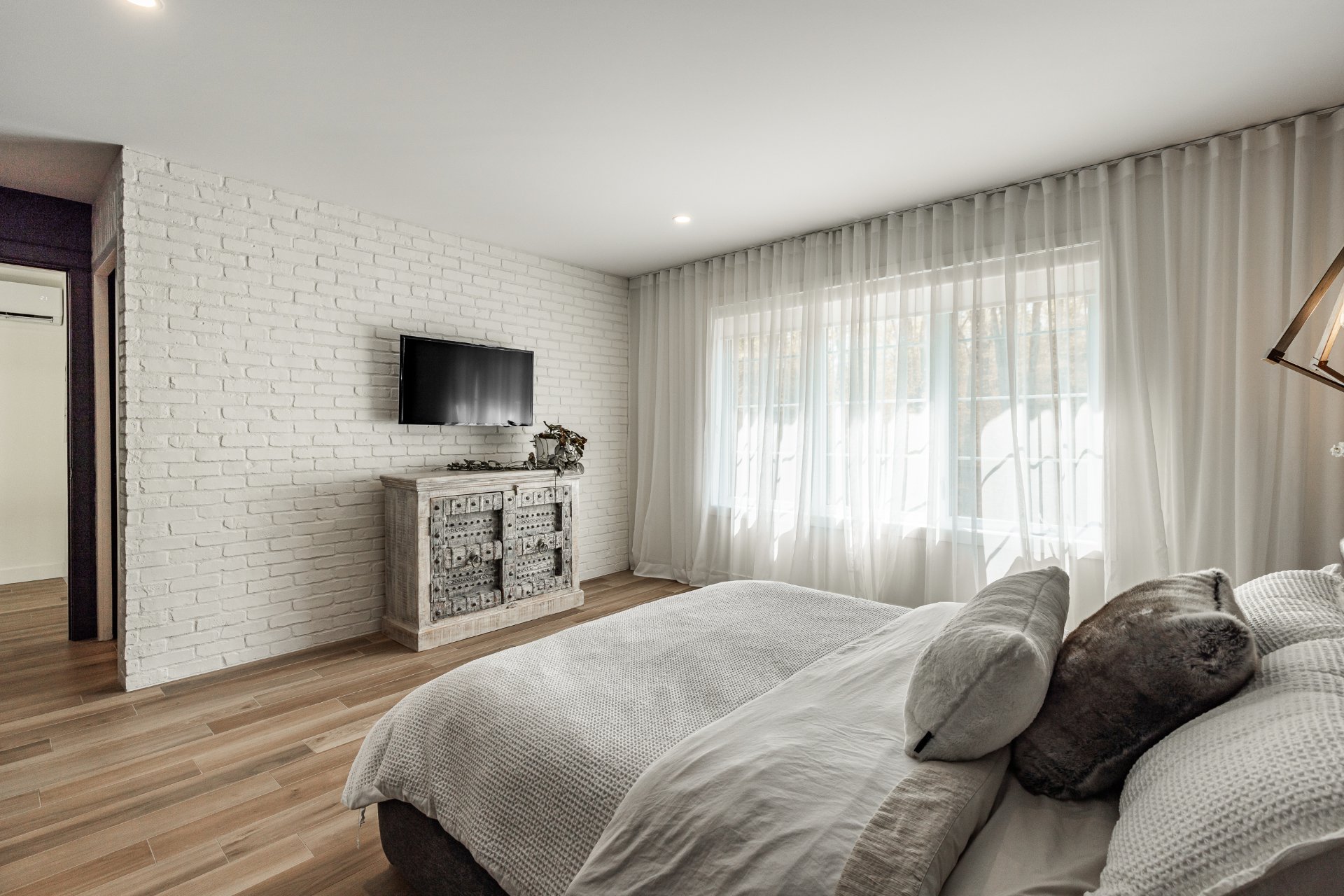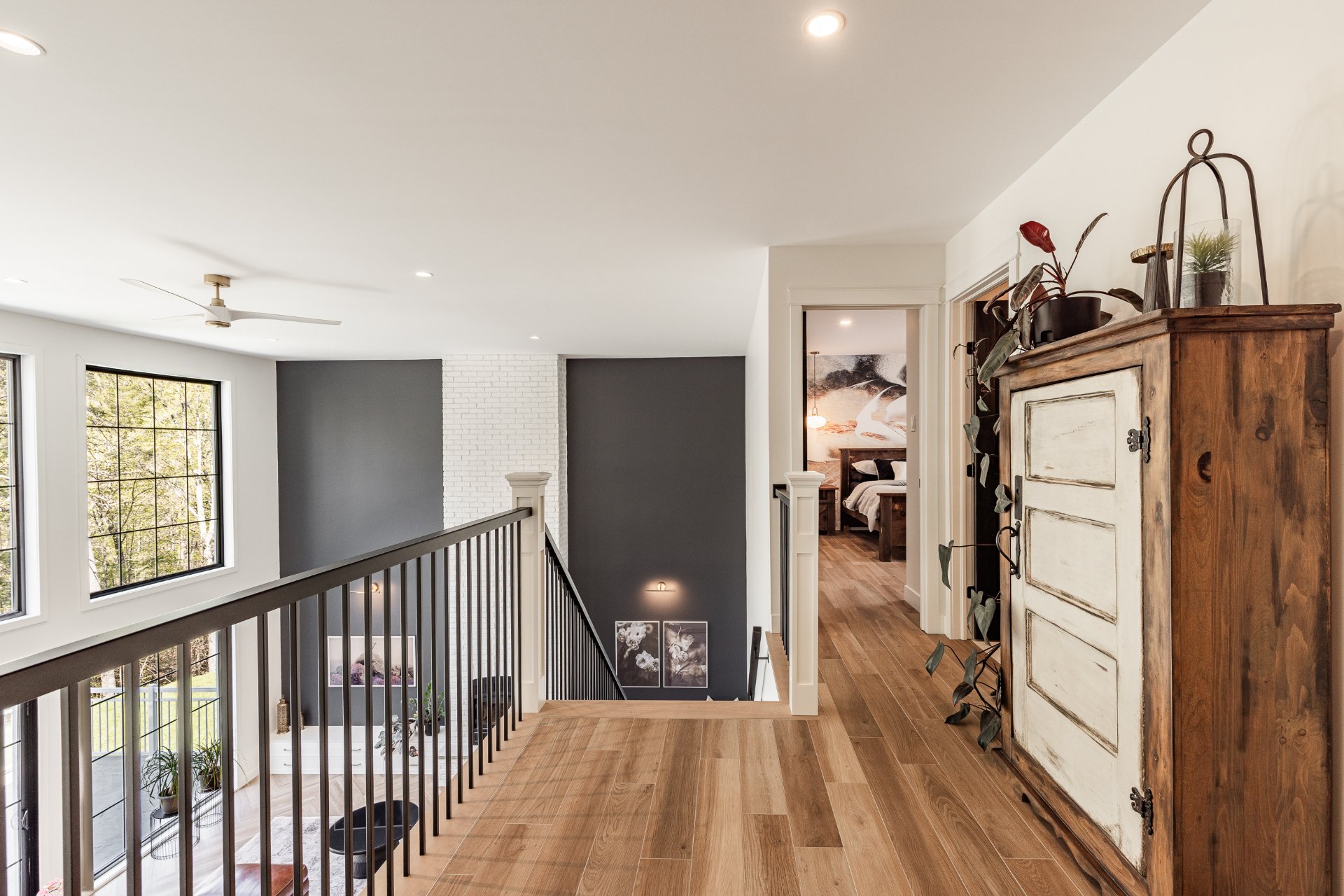 À l'étage, une mezzanine surplombe le salon et dessert deux chambres, dont la somptueuse suite principale avec grand walk-in et salle de bain attenante. Une deuxième chambre adjacente à une salle de bain additionnelle ainsi qu'une salle de lavage complètent ce niveau.