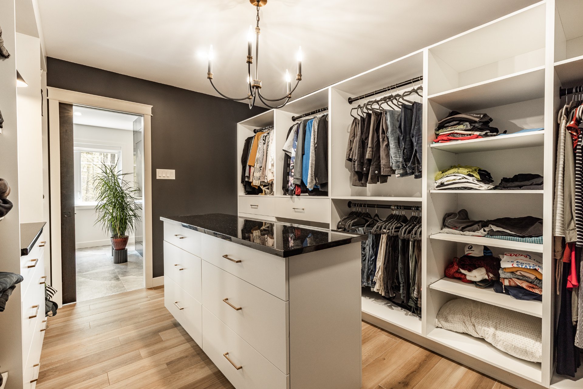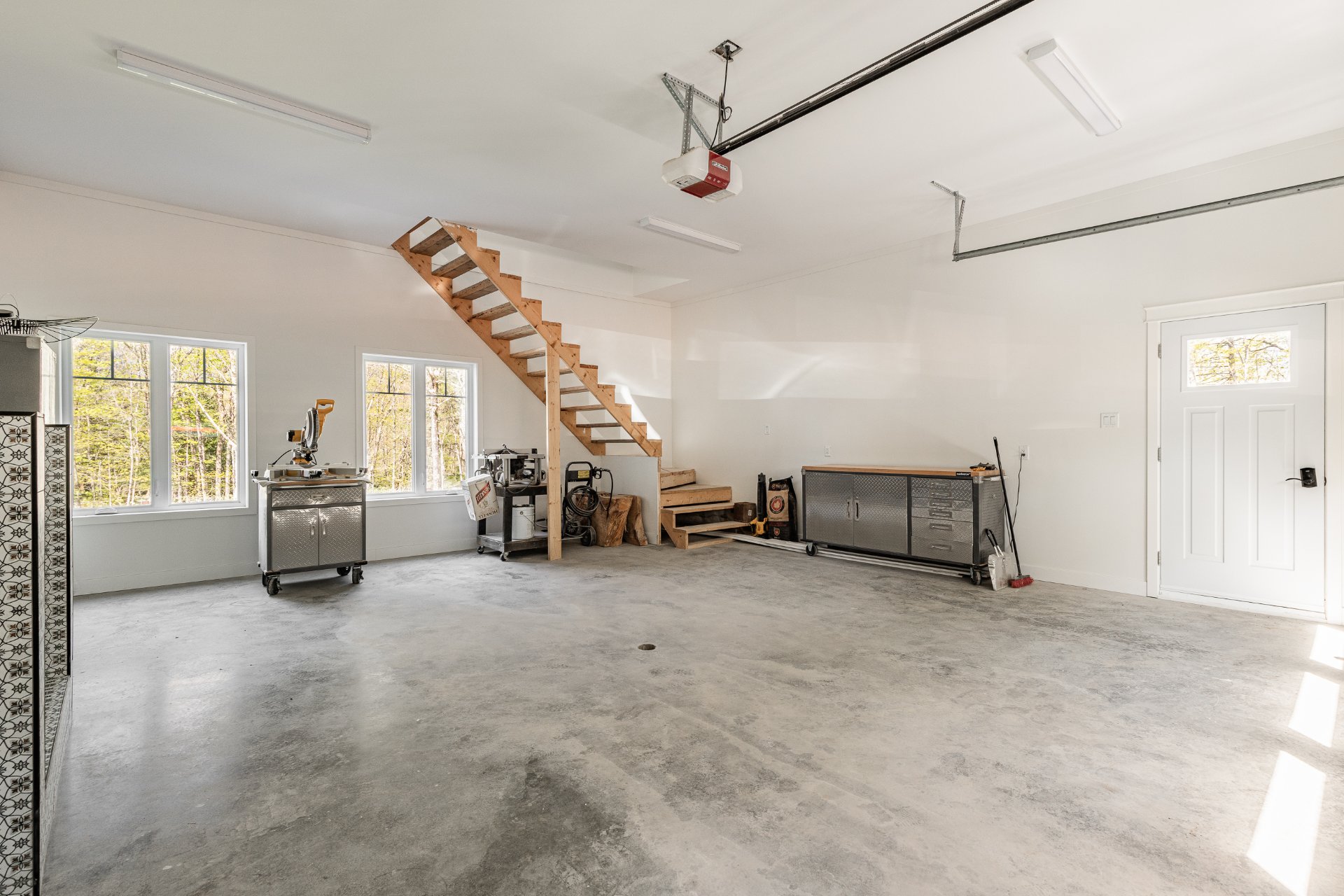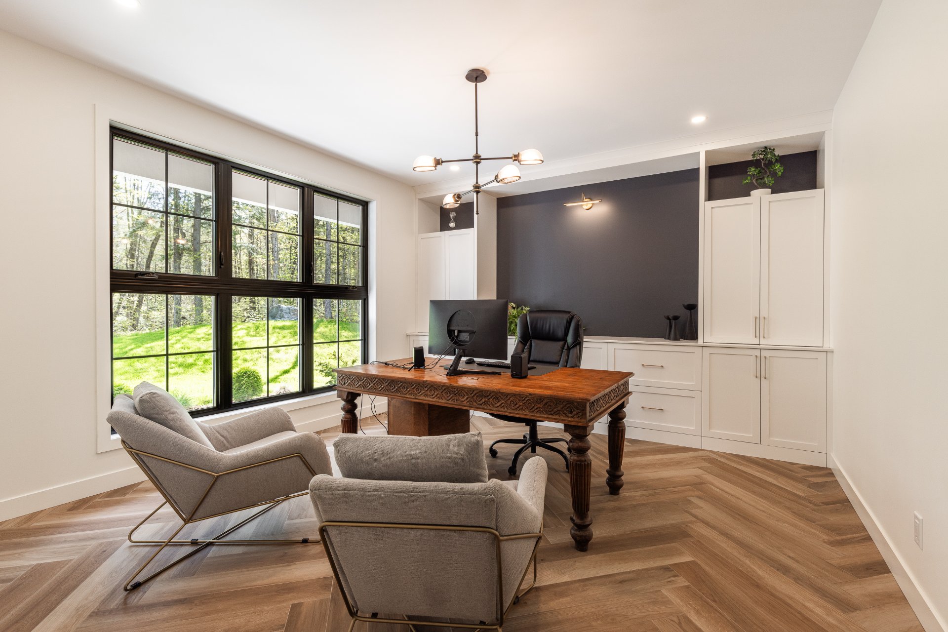 Un pratique mudroom à l'entrée, ainsi que deux espaces bureau, dont un avec mobilier intégré au rez-de-chaussée et un autre à l'étage, au-dessus du garage.