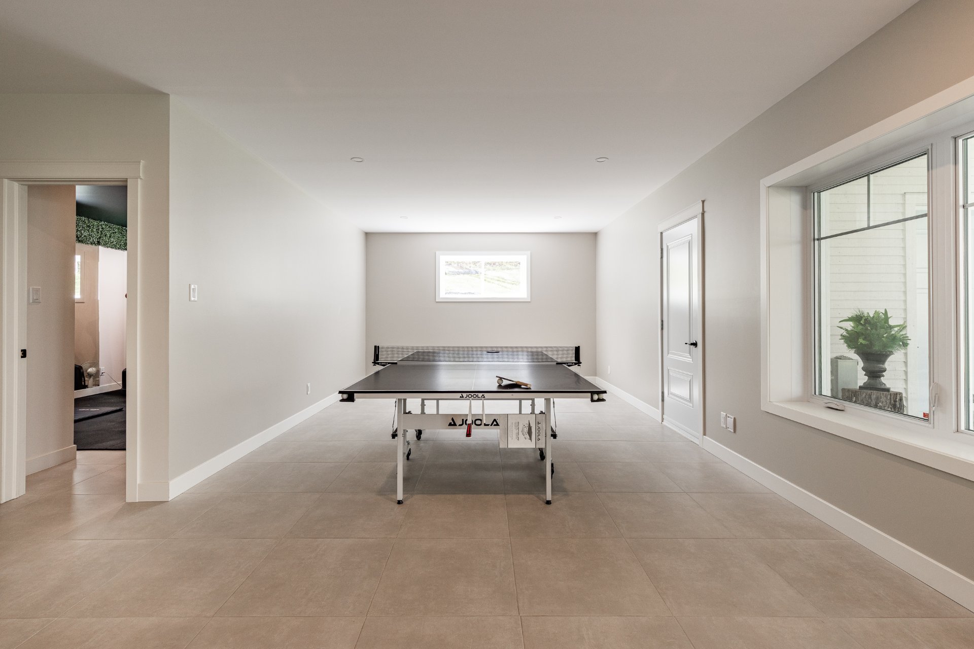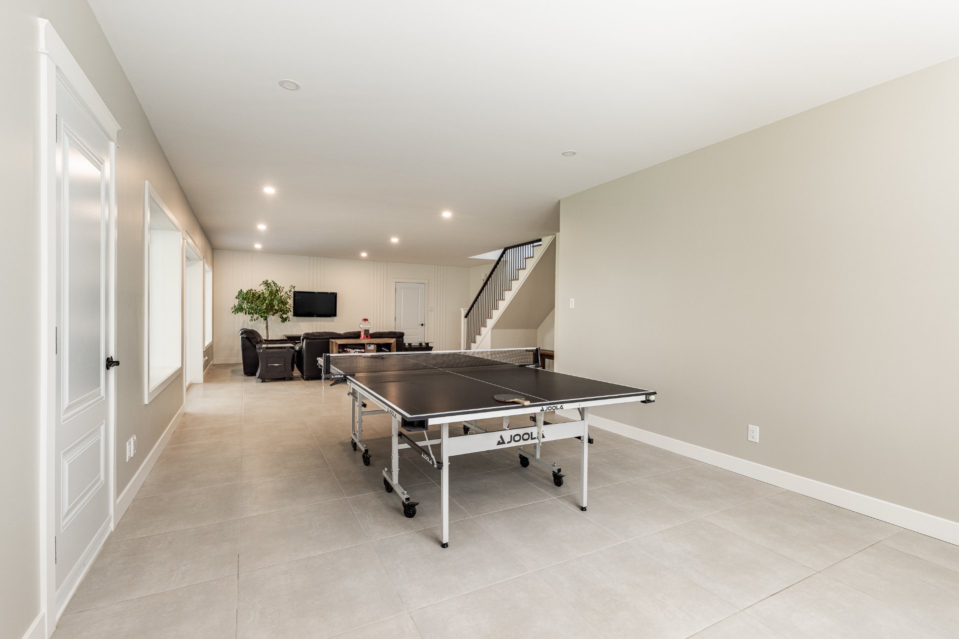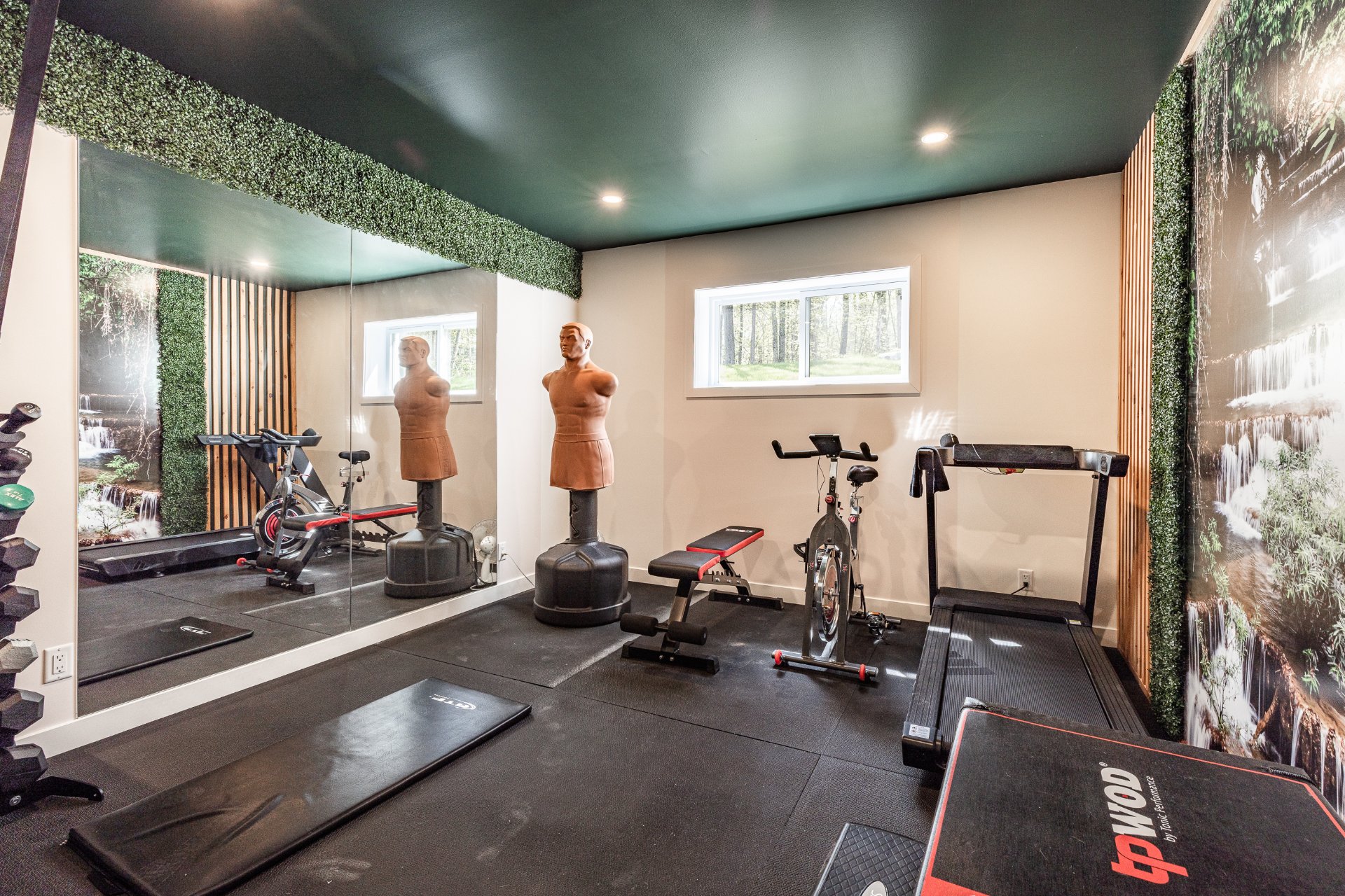 Le sous-sol en rez-de-jardin offre une vaste salle familiale baignée de lumière naturelle grâce à une porte-patio et de grandes fenêtres, donnant sur une terrasse muni d'un spa. On retrouve aussi un espace gym, une troisième chambre annexée elle aussi à une salle de bain complète des plus luxueuse. Plusieurs espaces de rangement complètent cet étage.