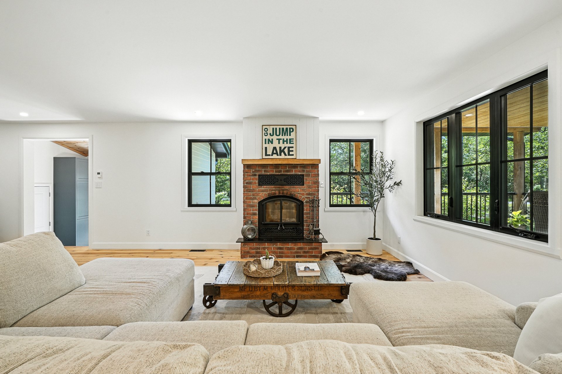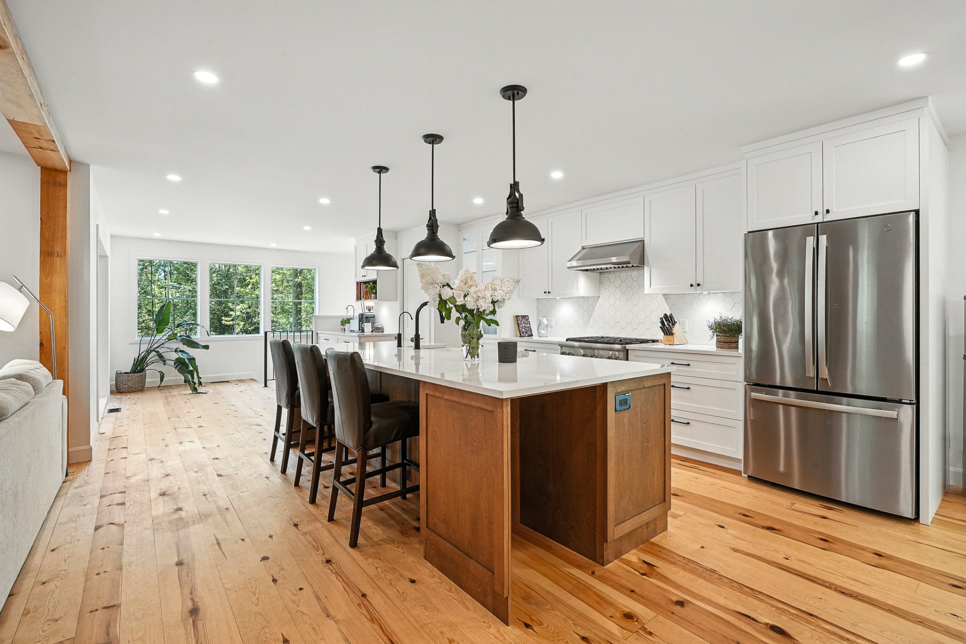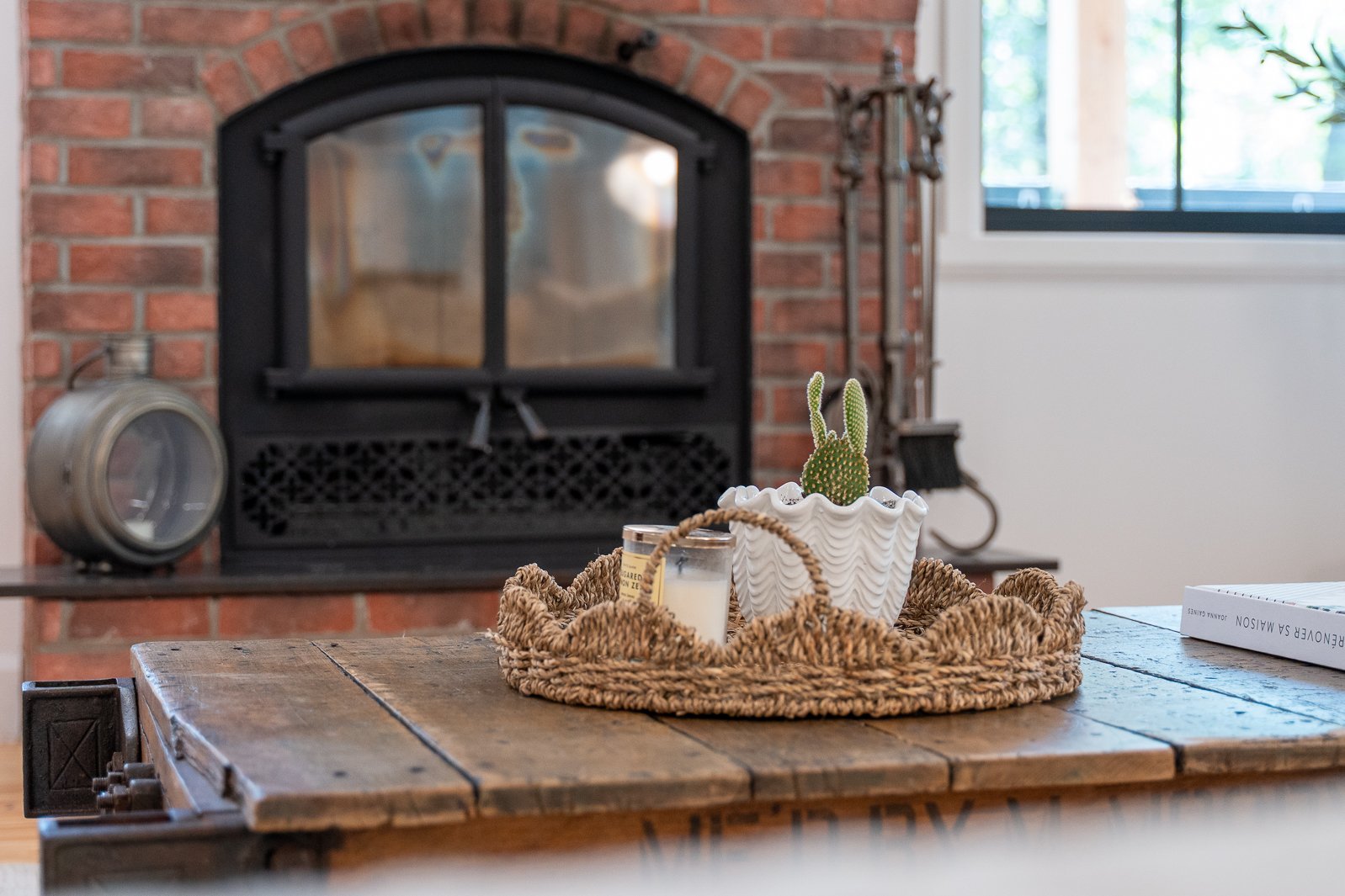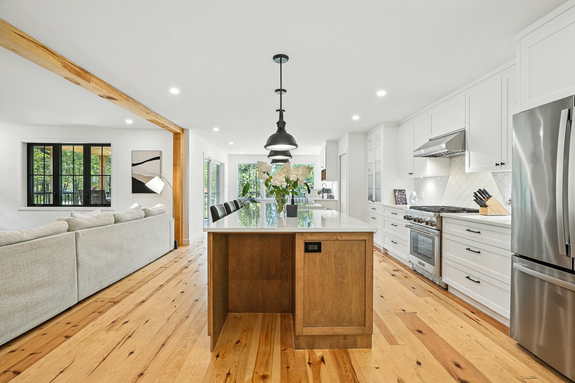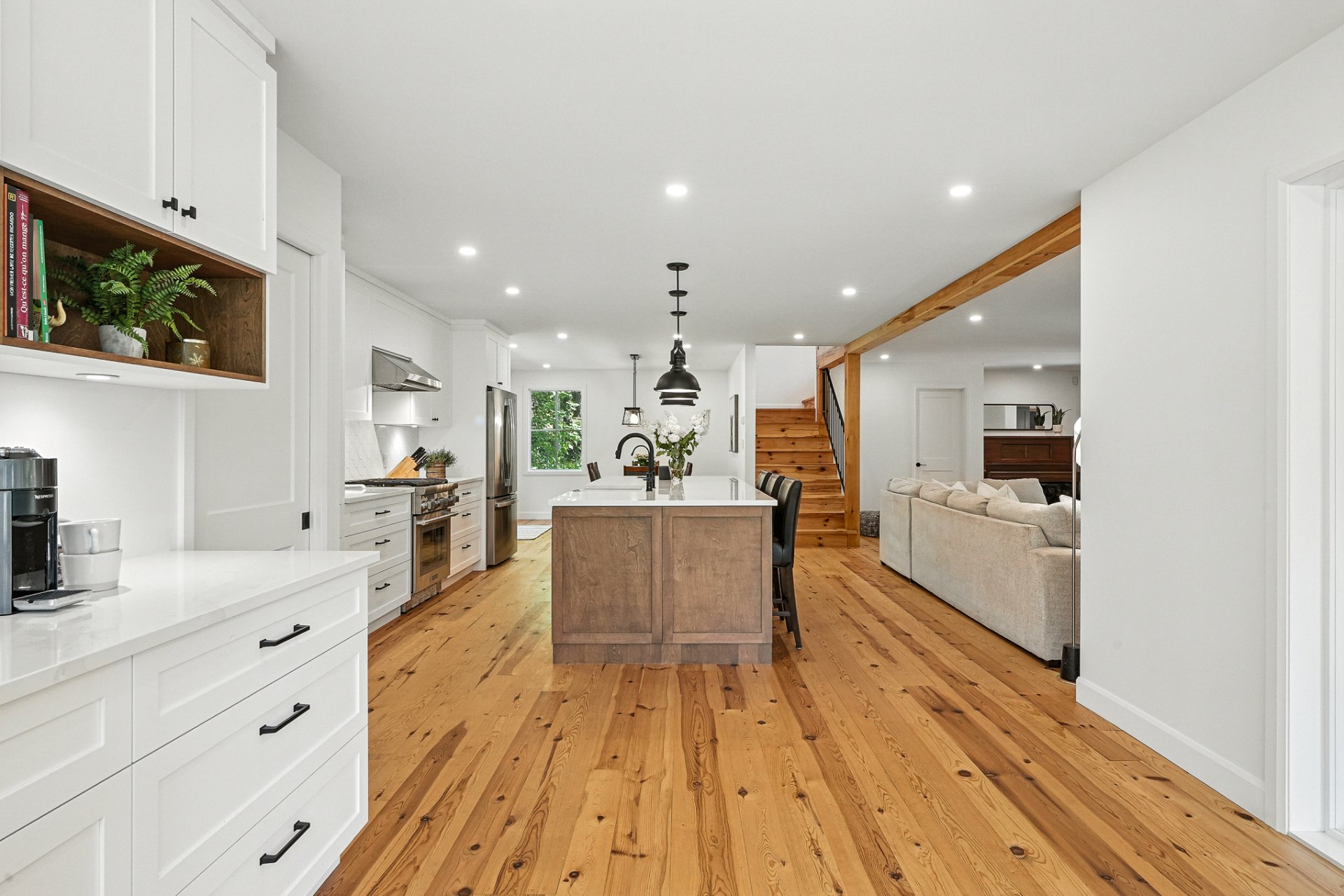 Le rez-de-chaussée s'organise autour d'un vaste espace de vie agrémenté d'un foyer au bois et de hauts plafonds (9 pieds), créant une de vie volumineuse mais qui demeure chaleureuse. La cuisine se distingue par un imposant ¸îlot central, de nombreuses armoires, de jolis comptoirs en quartz et un garde-manger style walk-in dissimulé. Elle est agrémentée d'électroménagers haut de gamme, ce qui plaira aux amoureux de gastronomie.