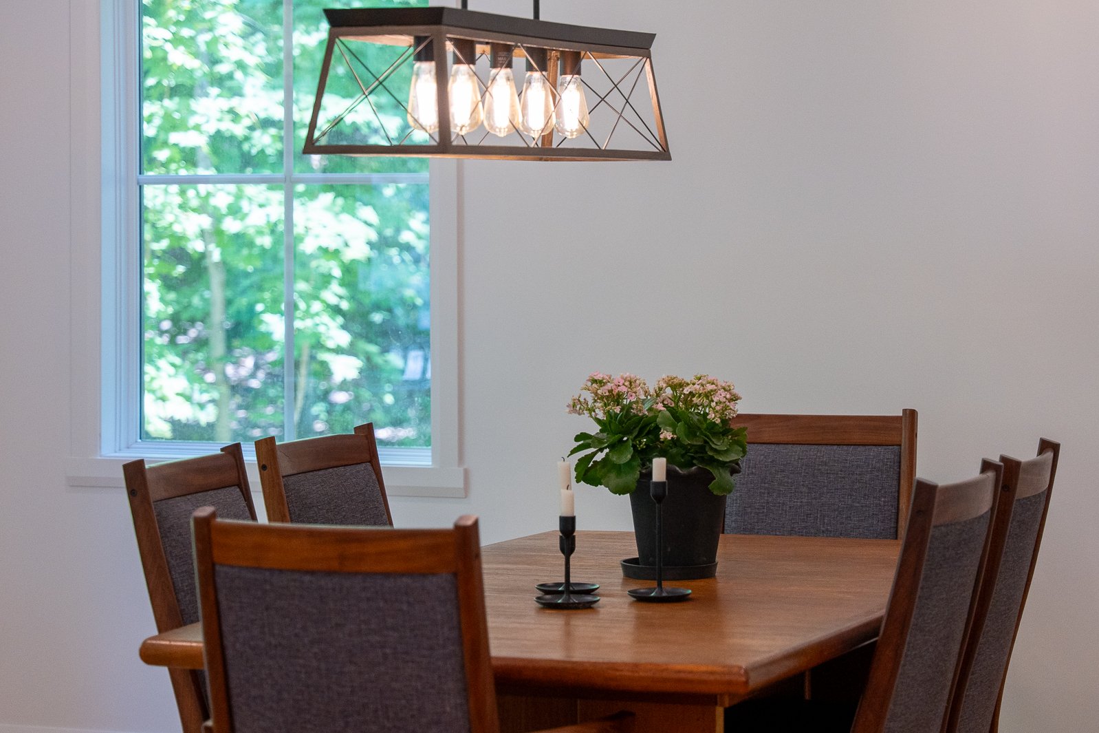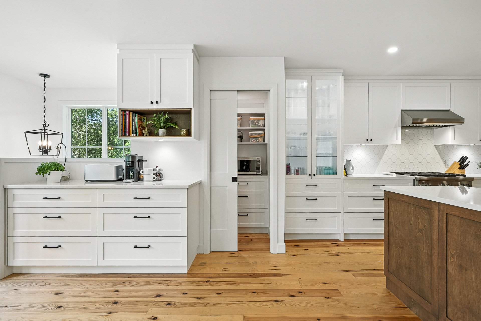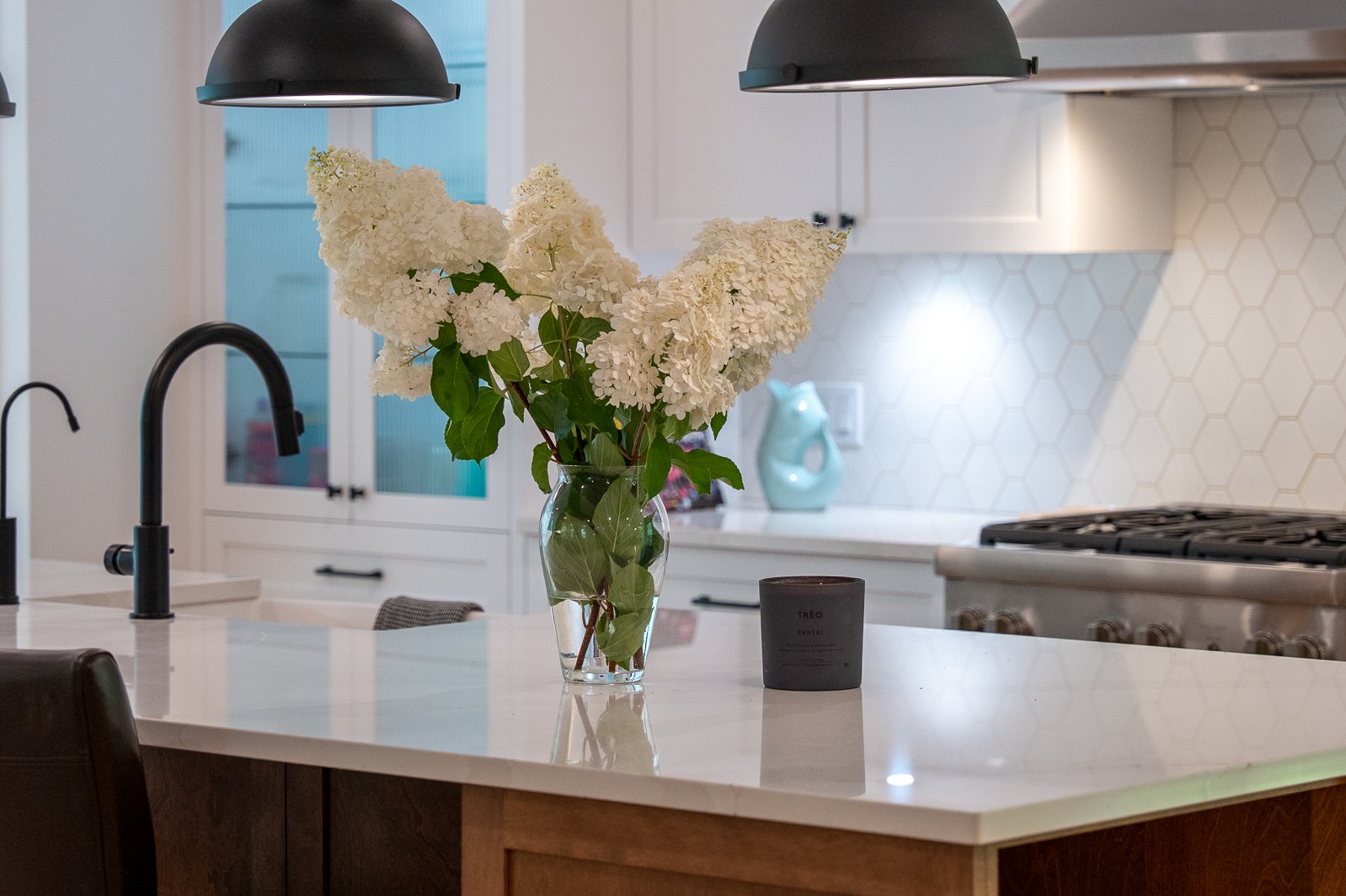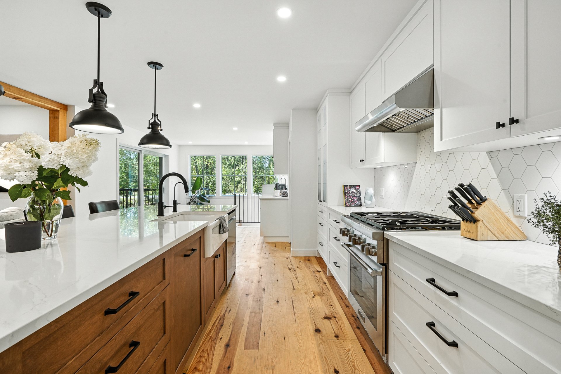 Le rez-de-chaussée s'organise autour d'un vaste espace de vie agrémenté d'un foyer au bois et de hauts plafonds (9 pieds), créant une de vie volumineuse mais qui demeure chaleureuse. La cuisine se distingue par un imposant ¸îlot central, de nombreuses armoires, de jolis comptoirs en quartz et un garde-manger style walk-in dissimulé. Elle est agrémentée d'électroménagers haut de gamme, ce qui plaira aux amoureux de gastronomie.