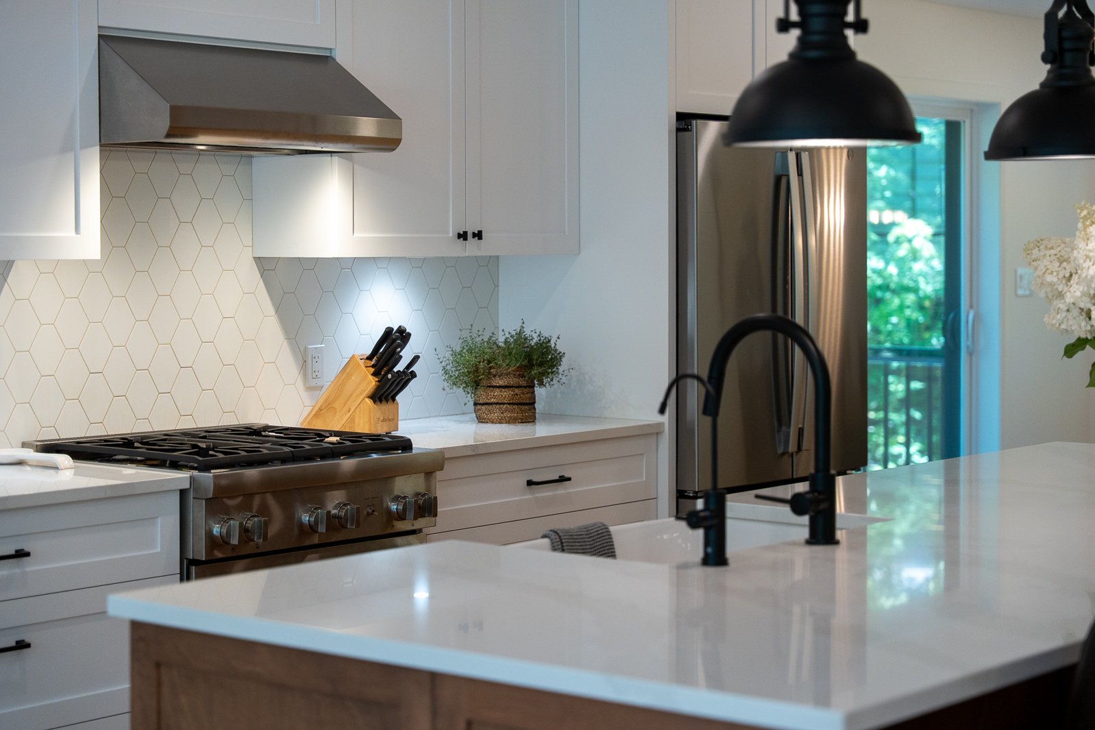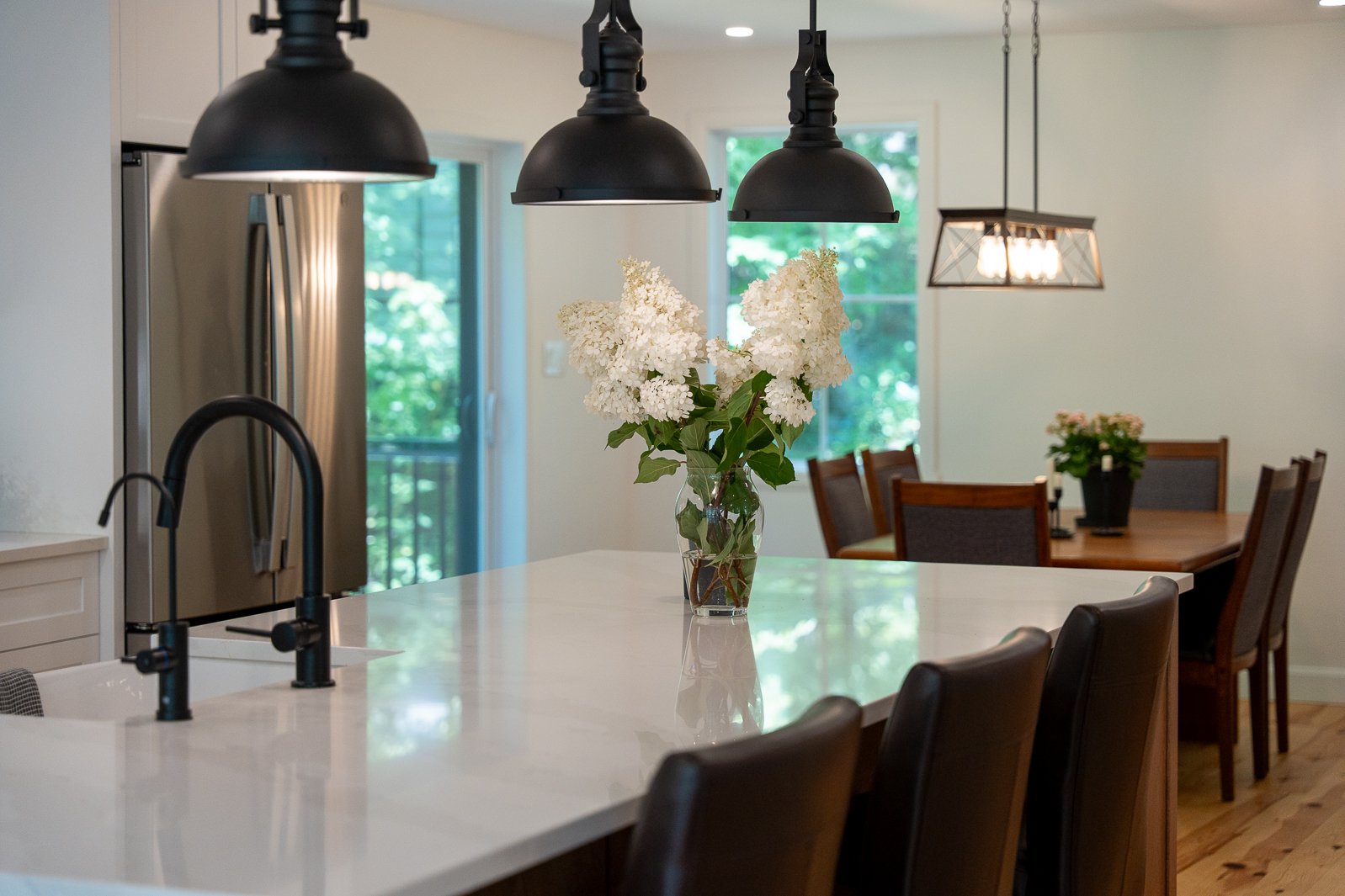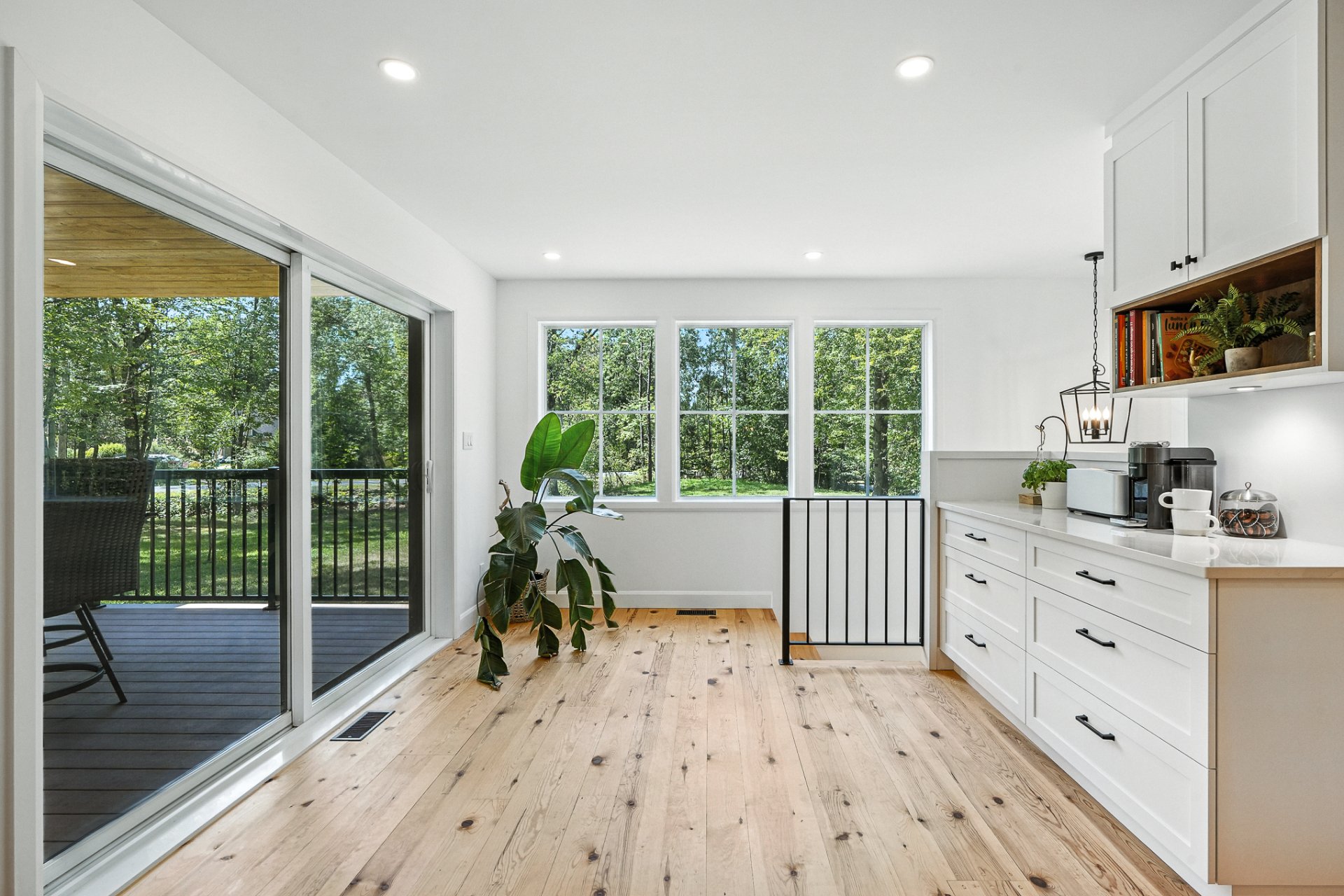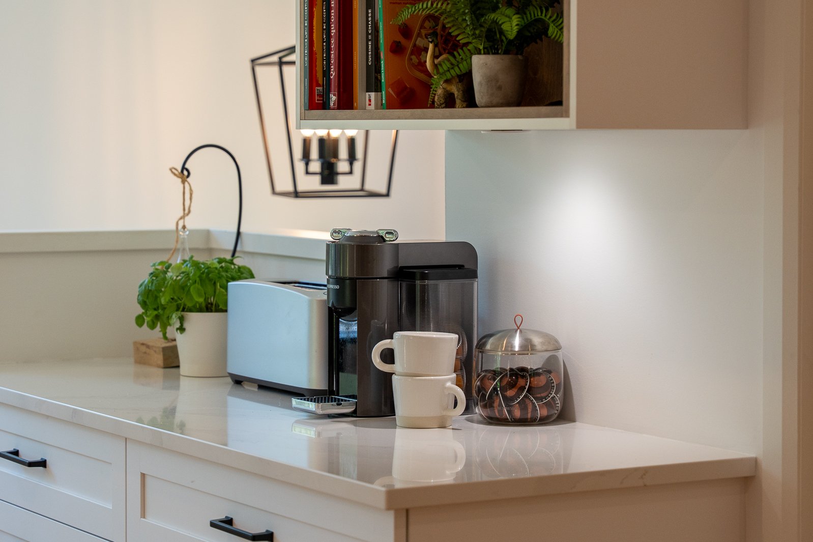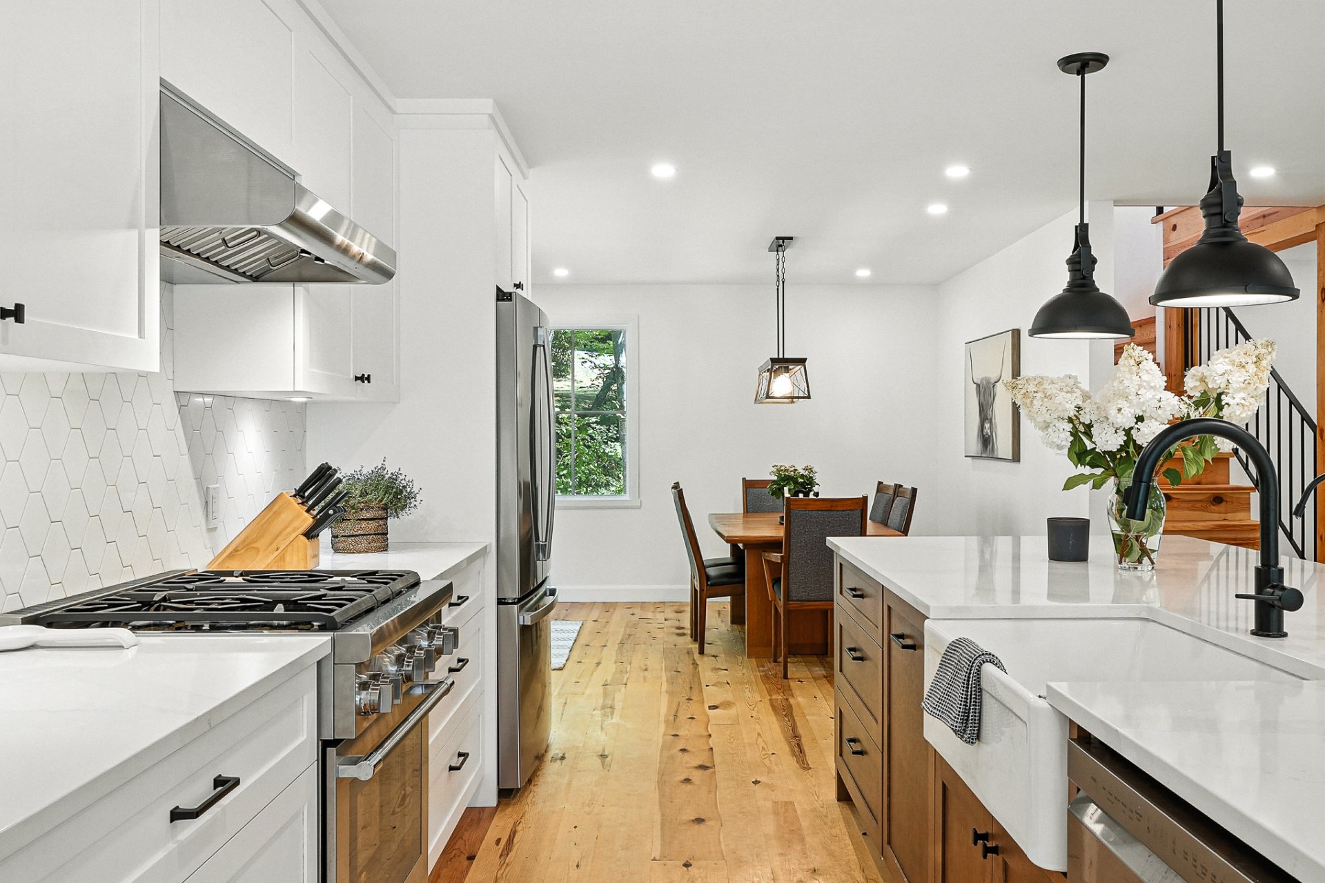 Le rez-de-chaussée s'organise autour d'un vaste espace de vie agrémenté d'un foyer au bois et de hauts plafonds (9 pieds), créant une de vie volumineuse mais qui demeure chaleureuse. La cuisine se distingue par un imposant ¸îlot central, de nombreuses armoires, de jolis comptoirs en quartz et un garde-manger style walk-in dissimulé. Elle est agrémentée d'électroménagers haut de gamme, ce qui plaira aux amoureux de gastronomie.