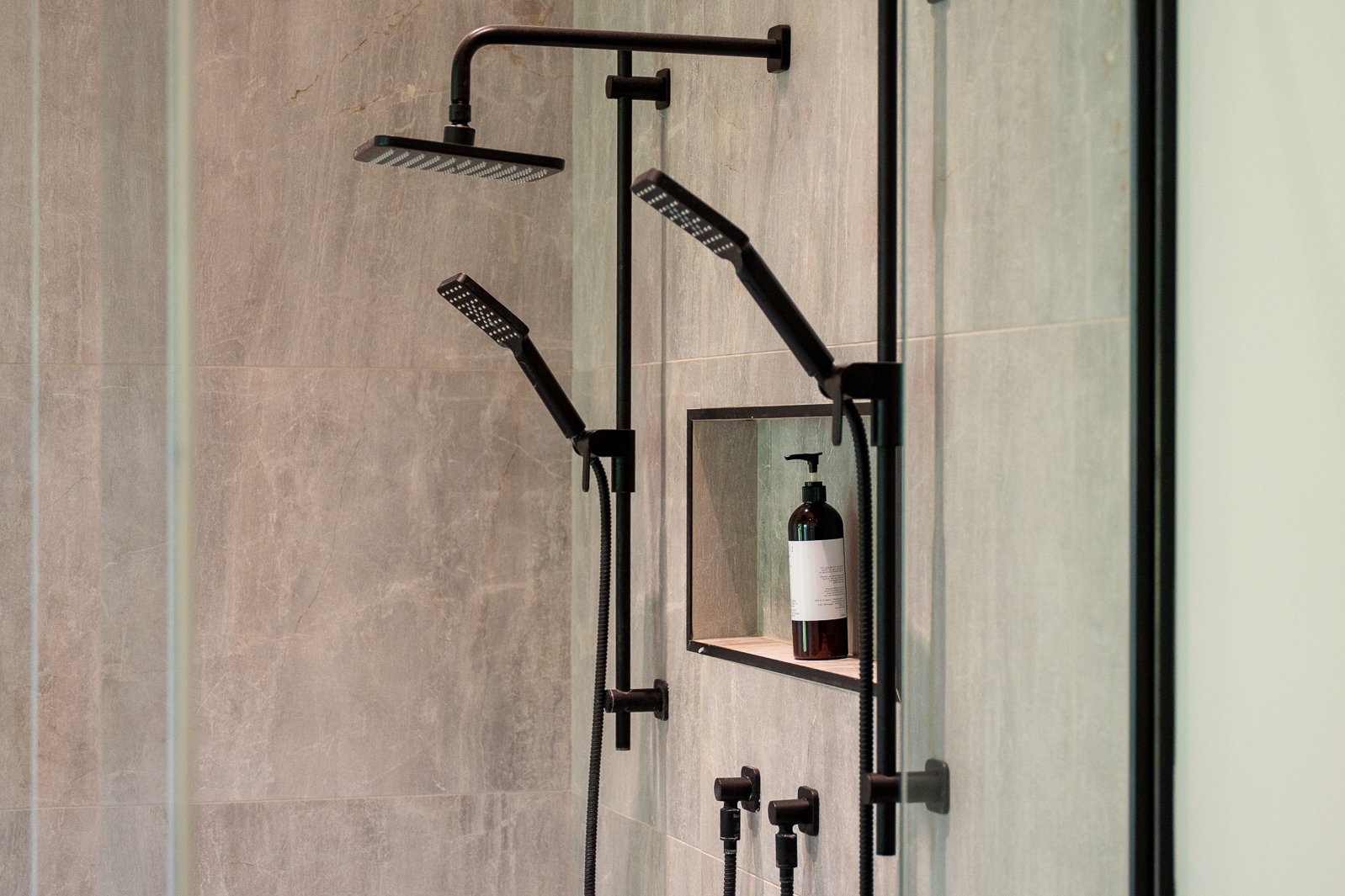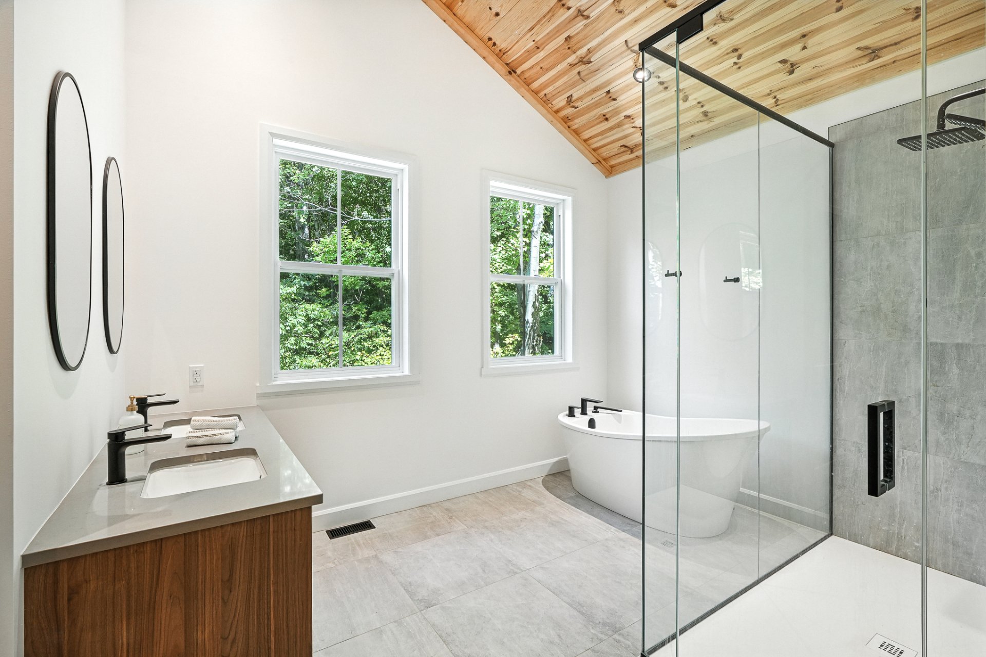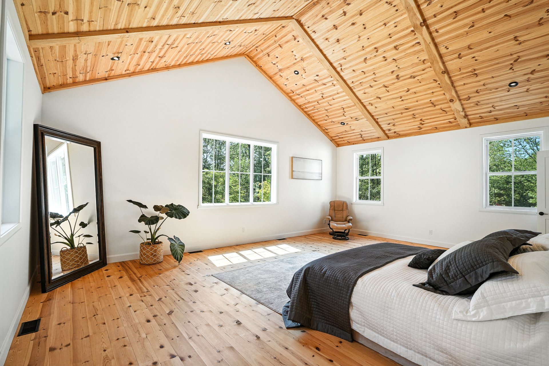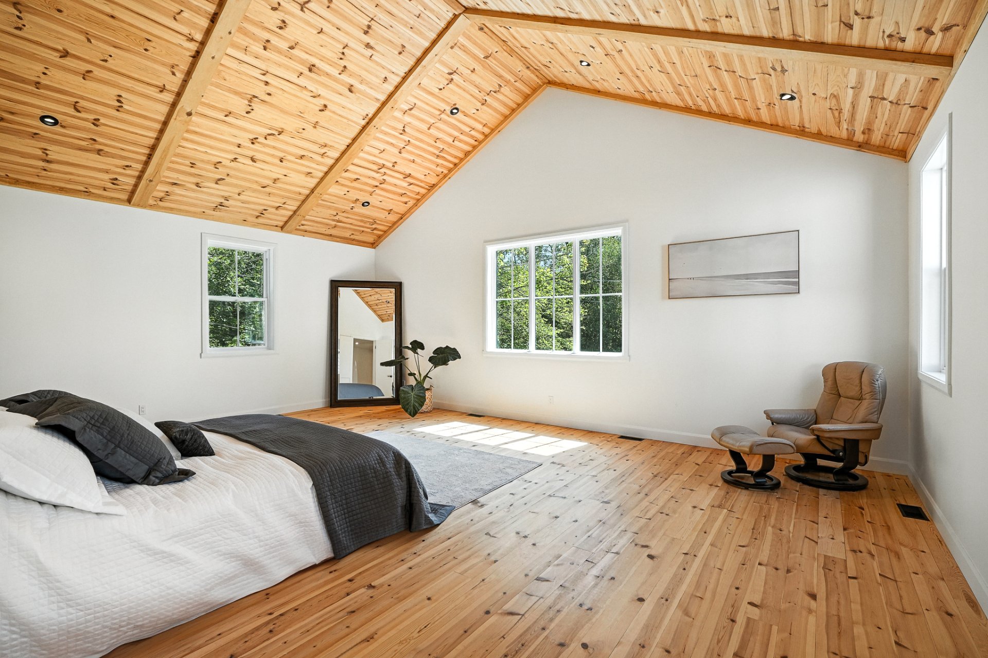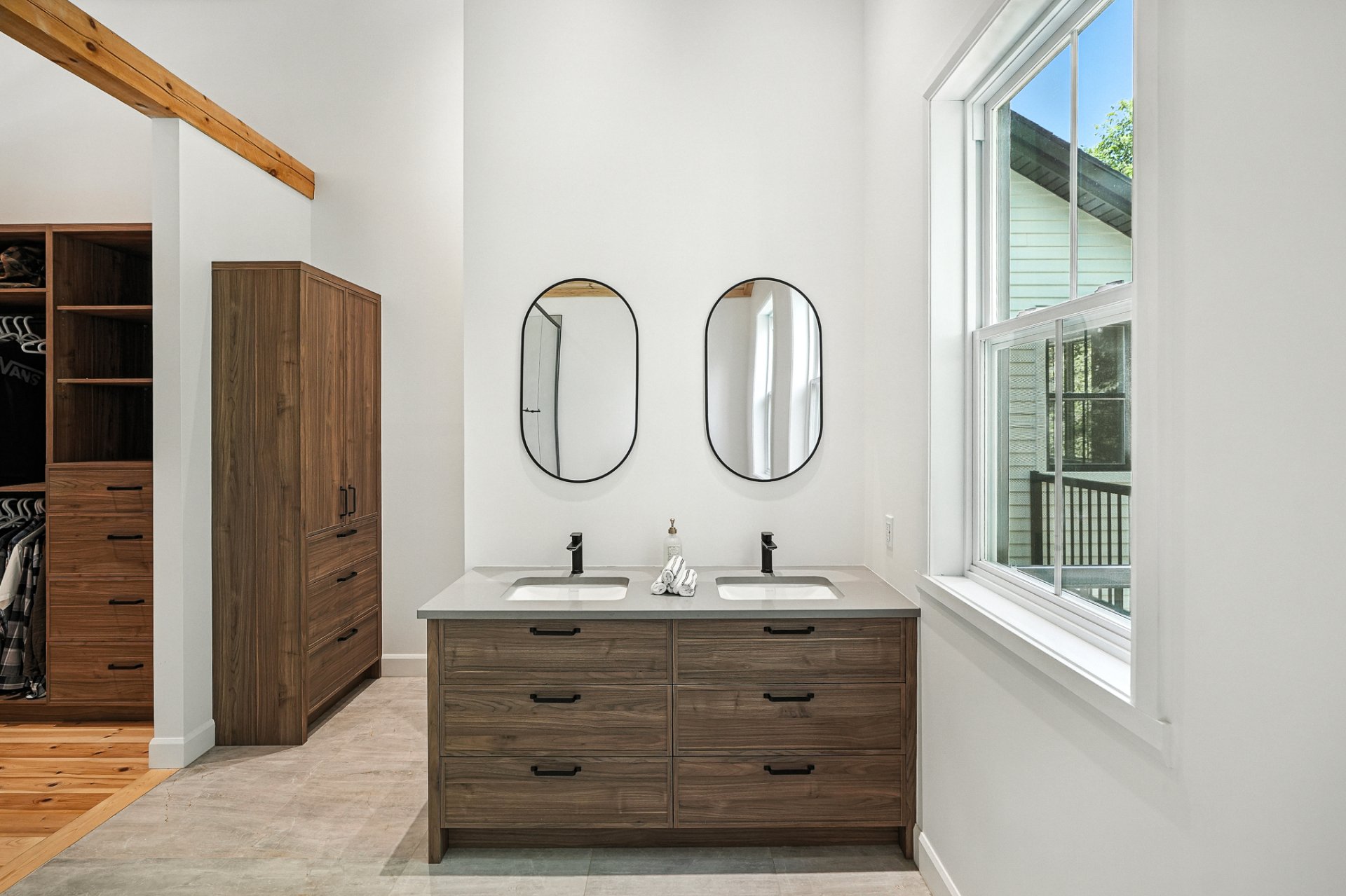 À l'étage, la suite principale séduit par son plafond cathédrale de 15 pieds, sa penderie aménagée et sa salle de bain attenante dotée de robinetteries design, d'un plancher chauffant et d'une baignoire autoportante.