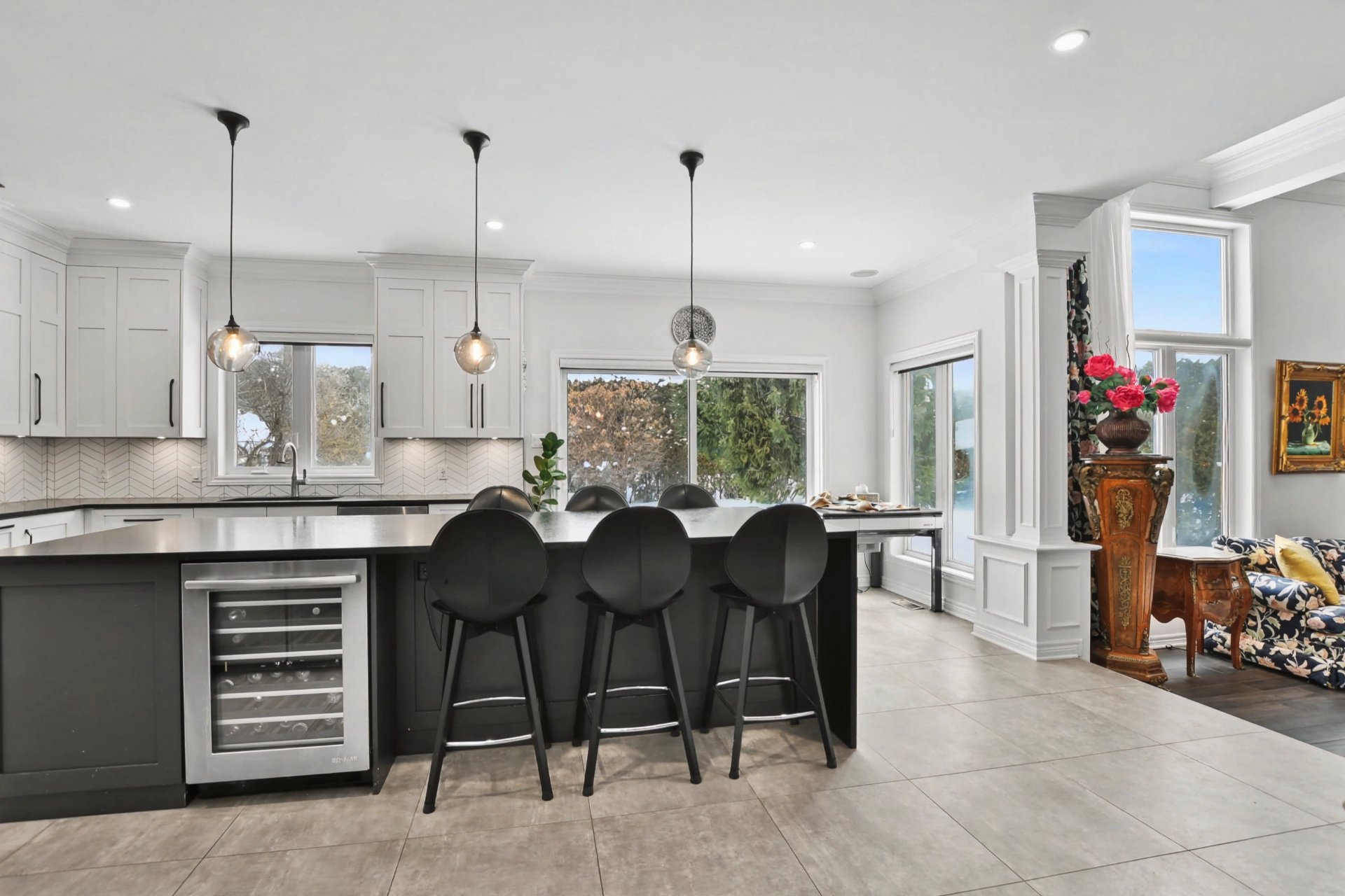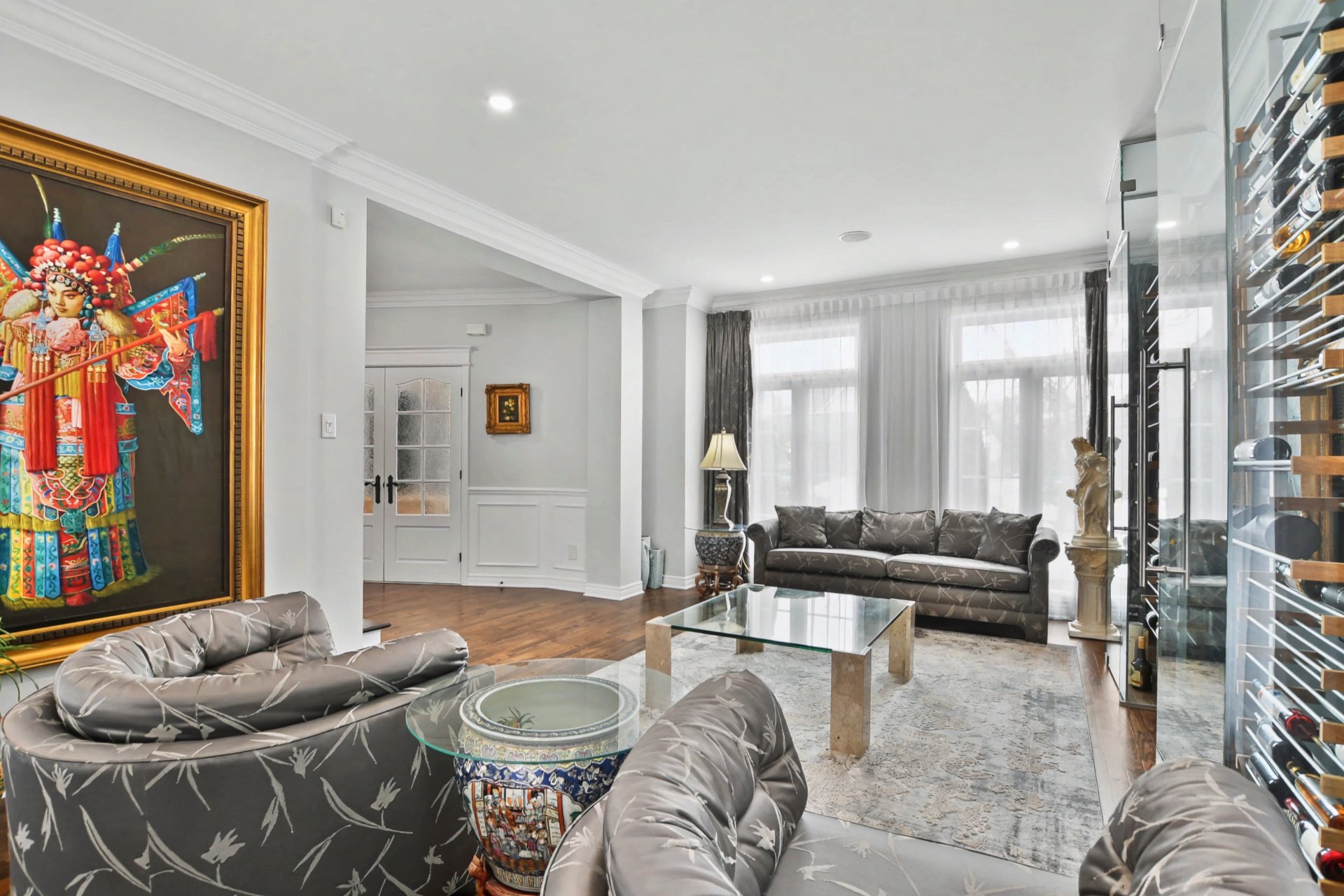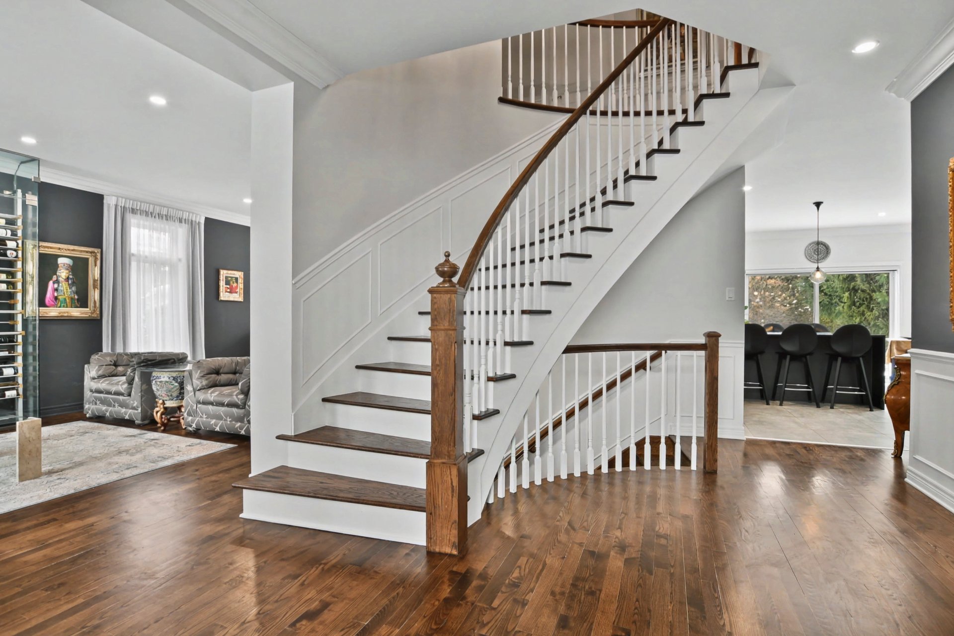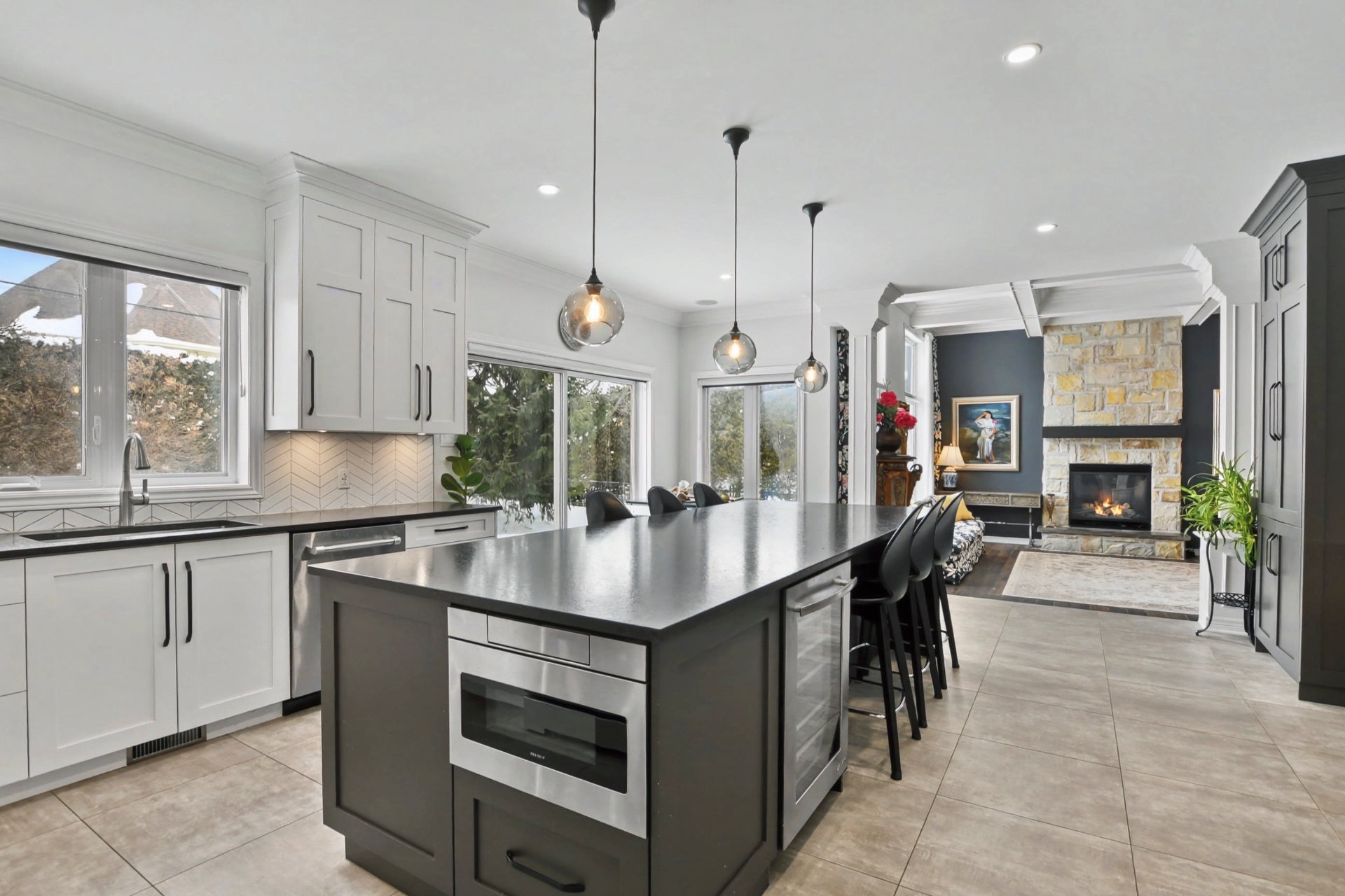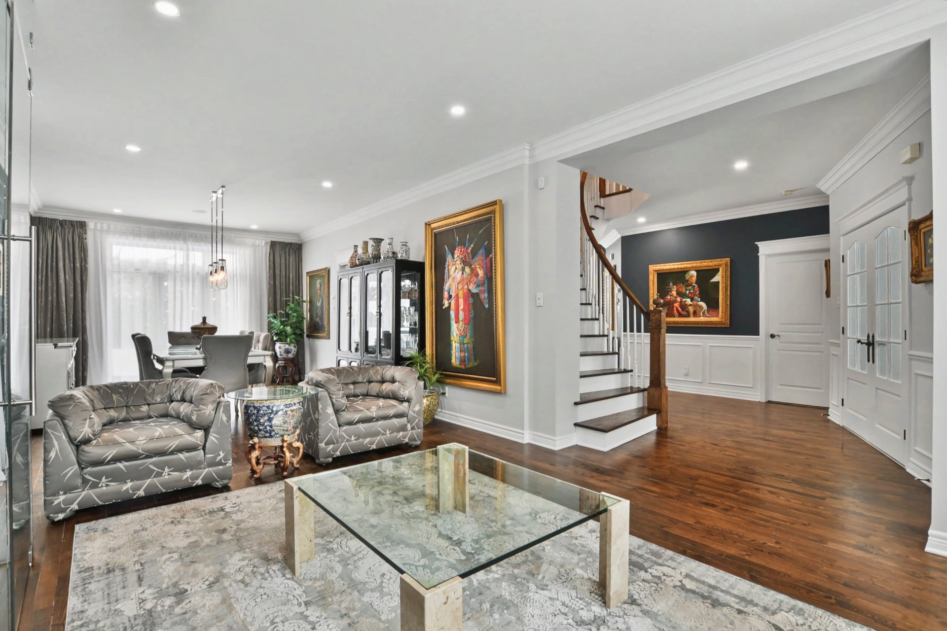 Hall d'entrée accueillant ouvrant sur des aires de vie impressionnantes. Superbe salle familiale avec plafond de 12 pieds, fenestration abondante et foyer au gaz avec manteau de pierre. Cuisine rénovée à aire ouverte sur la salle familiale, dotée d'un immense îlot central, de comptoirs de granite, de nombreux rangements et d'électroménagers de calibre professionnel, dont une cuisinière au gaz de 48 po -- parfaite pour recevoir. Salle à manger adjacente. Deuxième salon avec cellier double intégré (non motorisé). Espaces de vie chaleureux et parfaitement équilibrés.