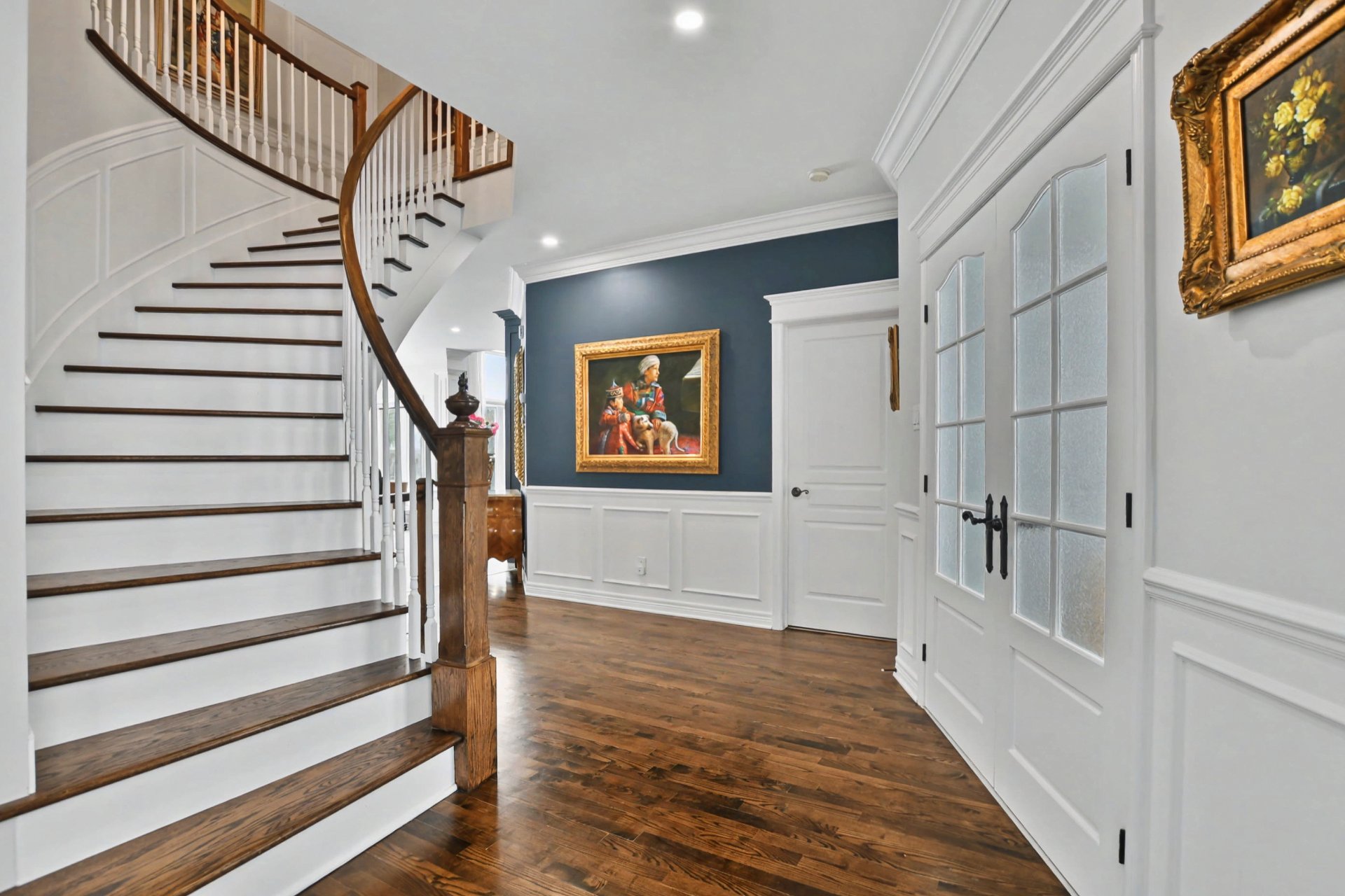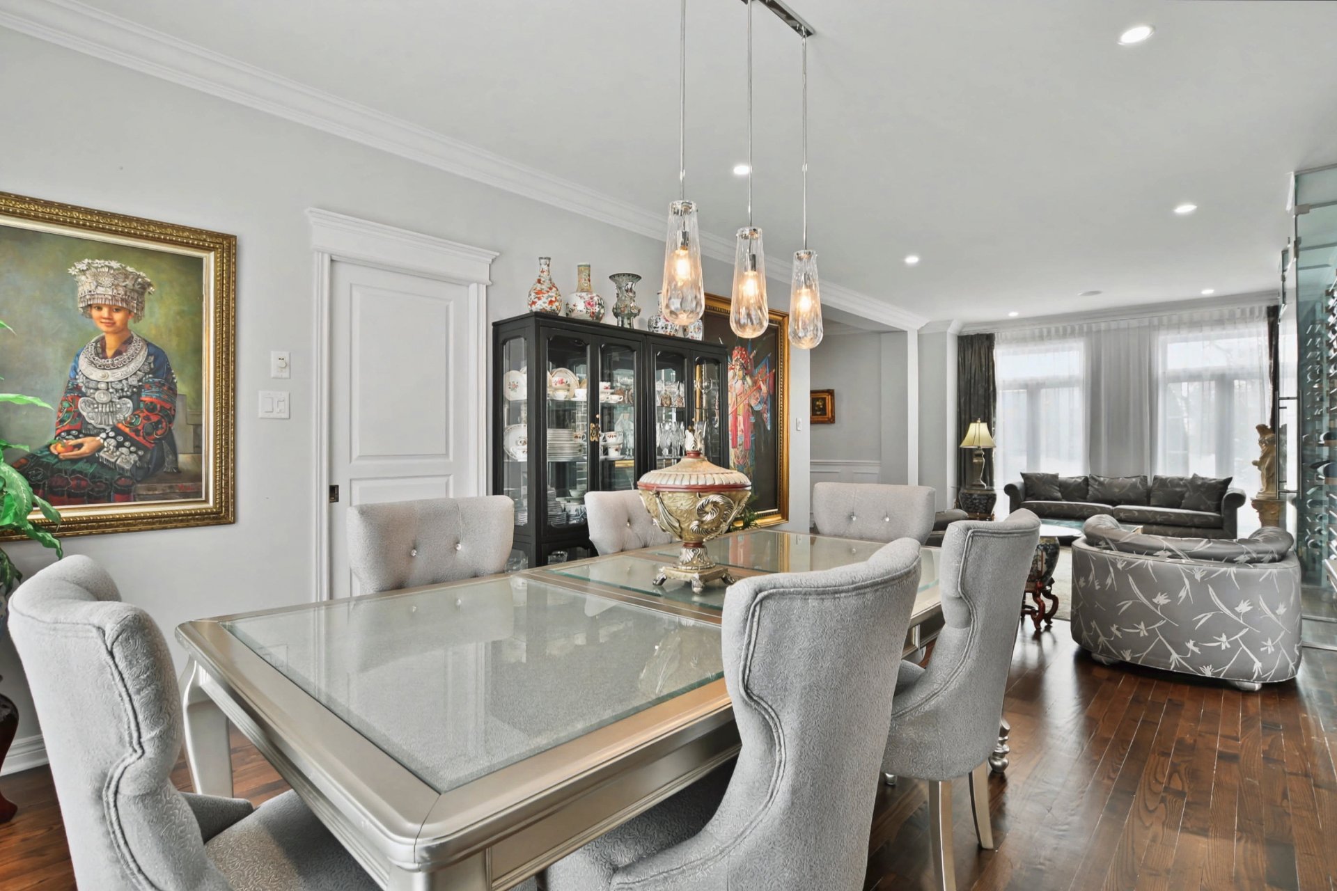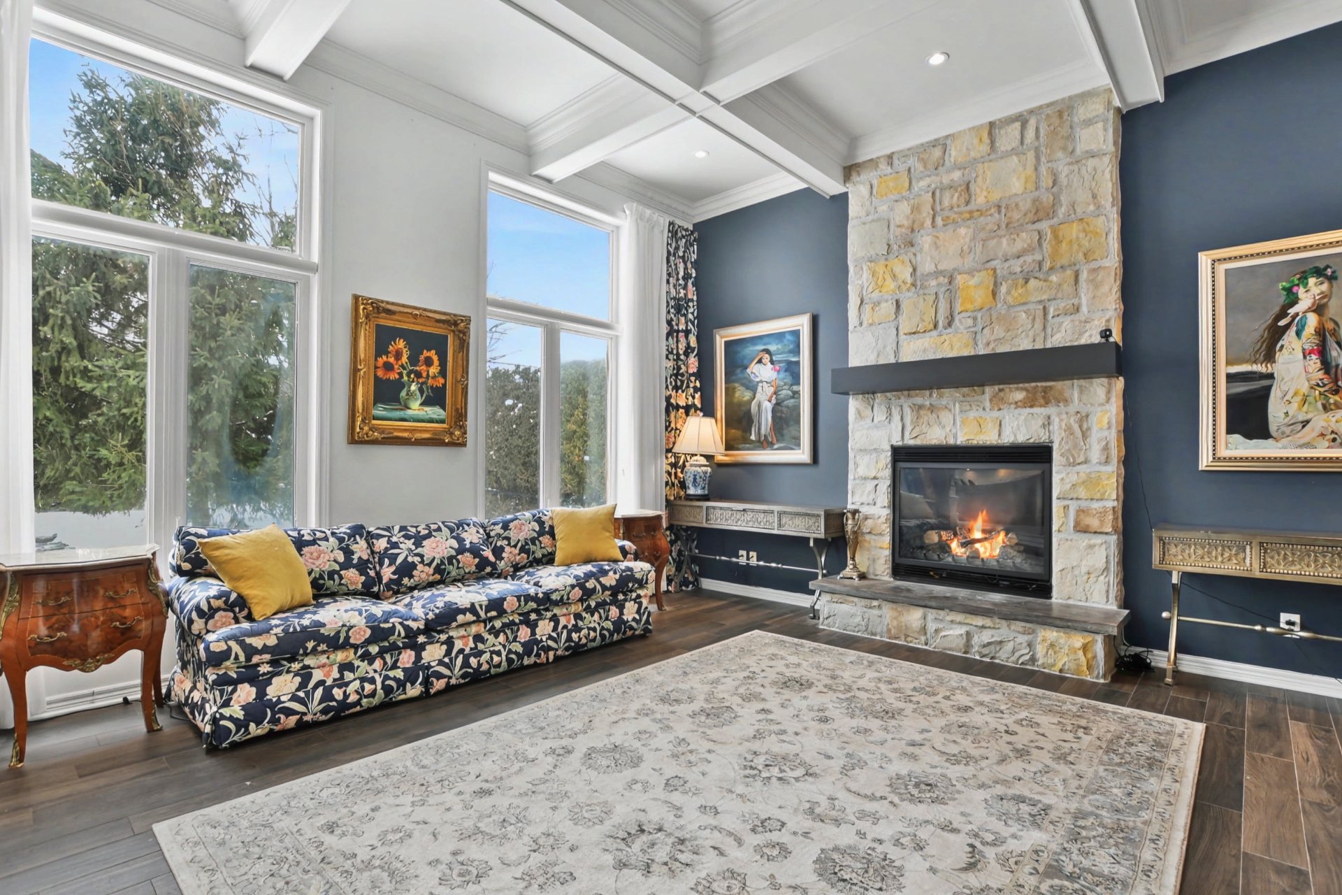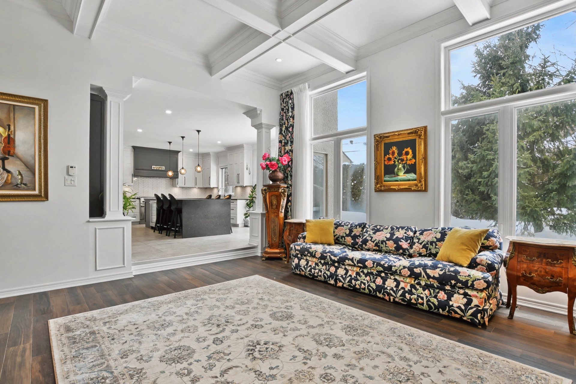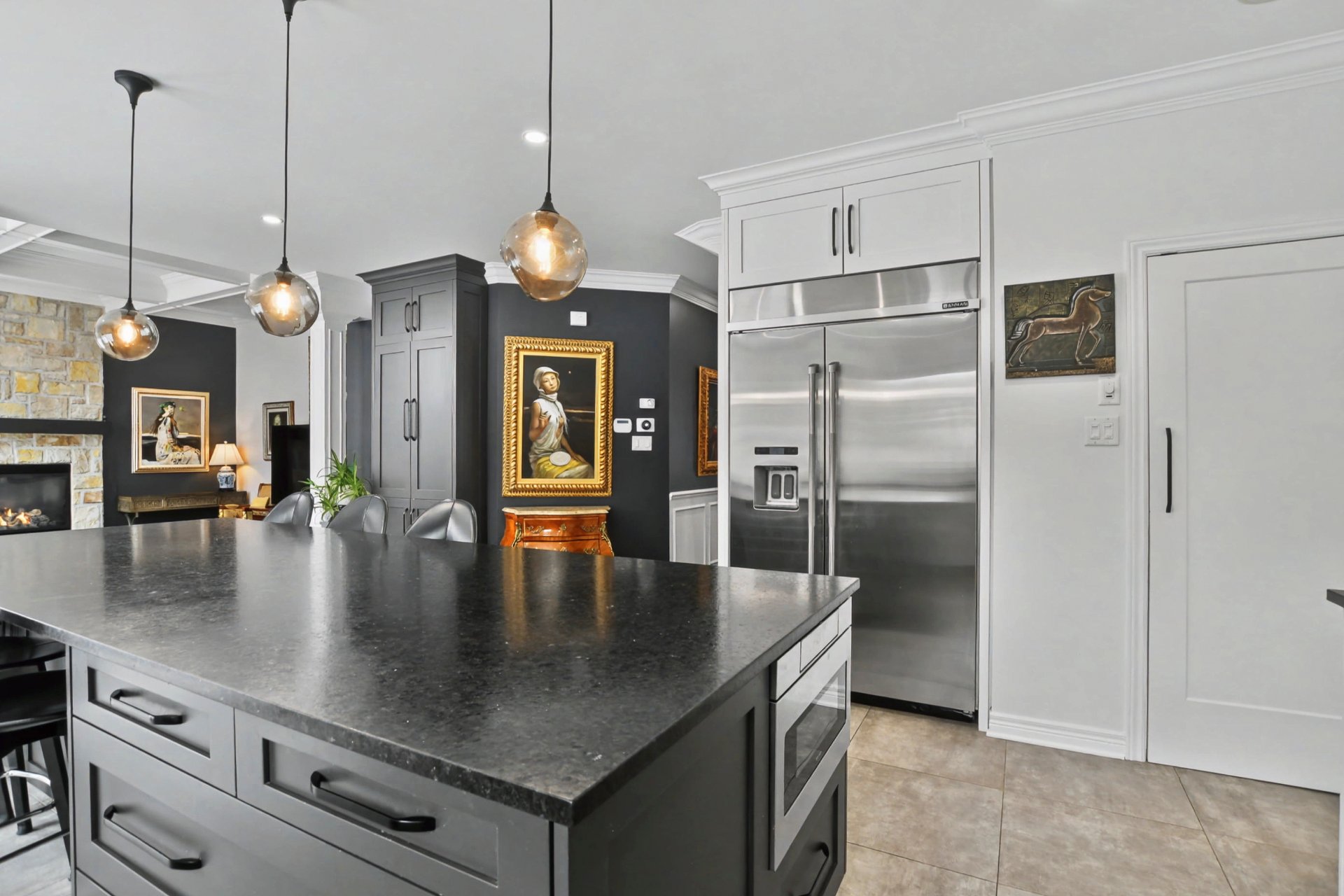 Hall d'entrée accueillant ouvrant sur des aires de vie impressionnantes. Superbe salle familiale avec plafond de 12 pieds, fenestration abondante et foyer au gaz avec manteau de pierre. Cuisine rénovée à aire ouverte sur la salle familiale, dotée d'un immense îlot central, de comptoirs de granite, de nombreux rangements et d'électroménagers de calibre professionnel, dont une cuisinière au gaz de 48 po -- parfaite pour recevoir. Salle à manger adjacente. Deuxième salon avec cellier double intégré (non motorisé). Espaces de vie chaleureux et parfaitement équilibrés.