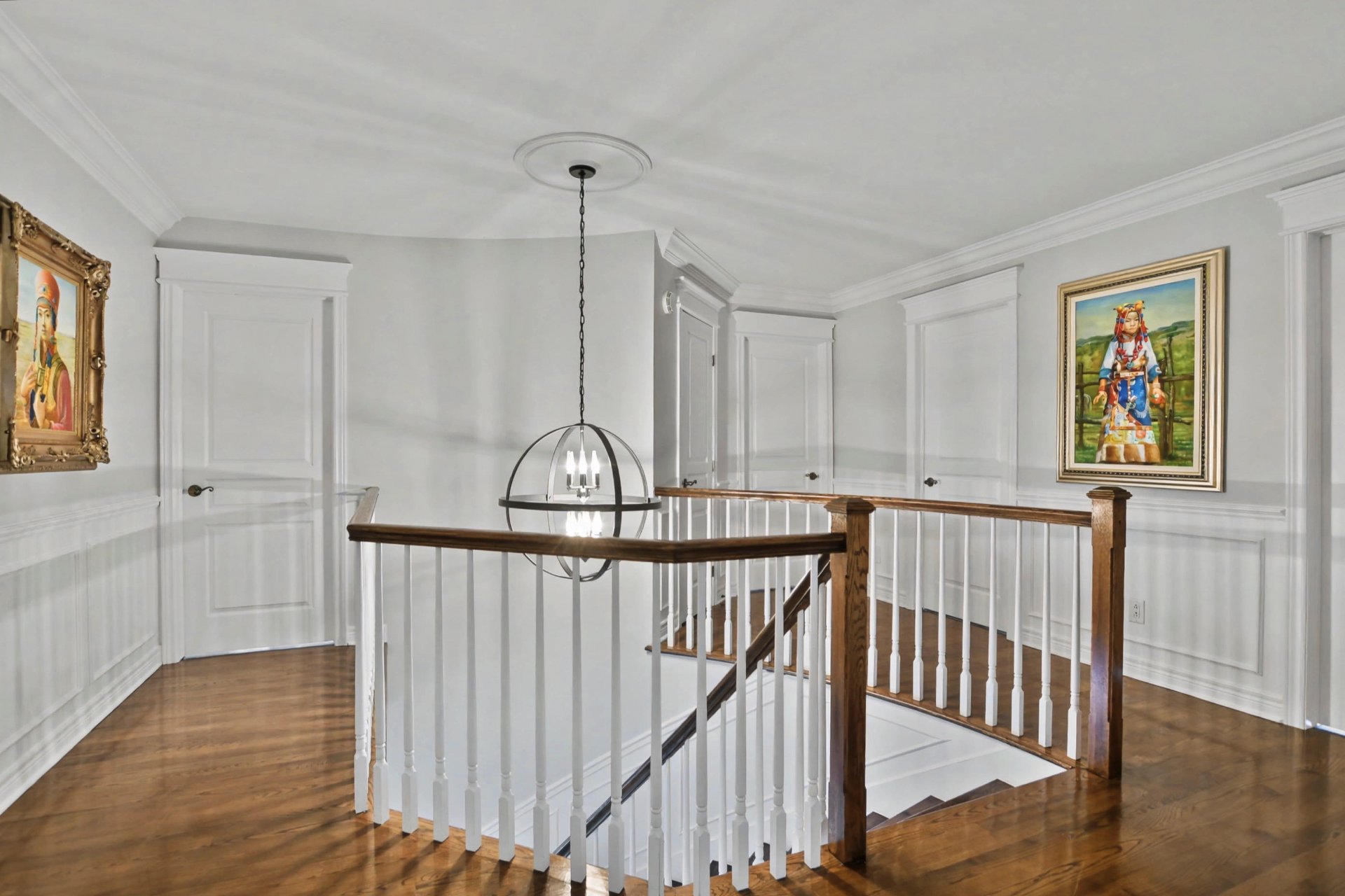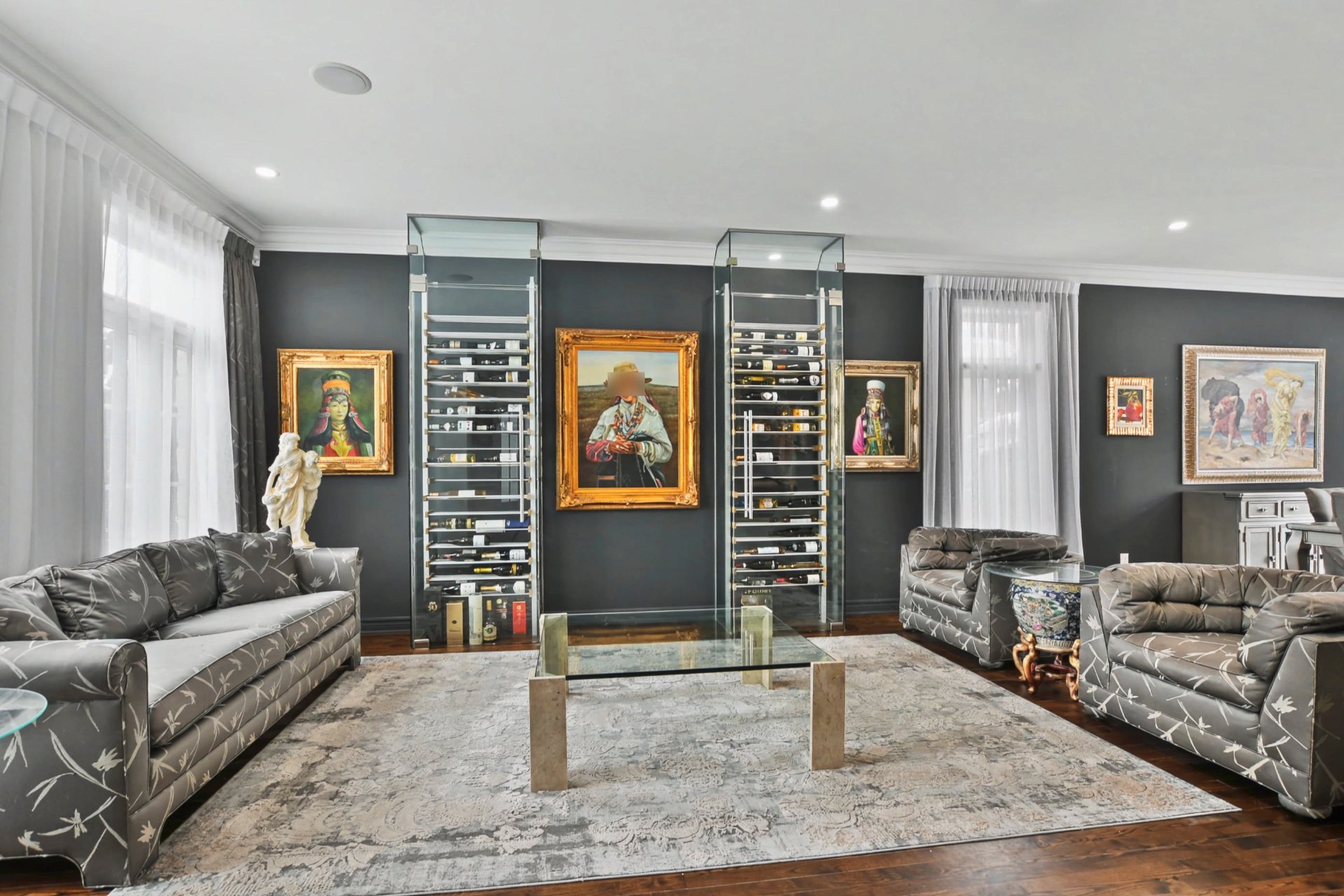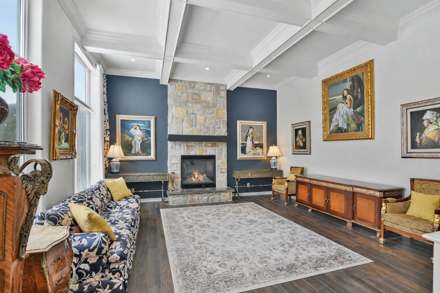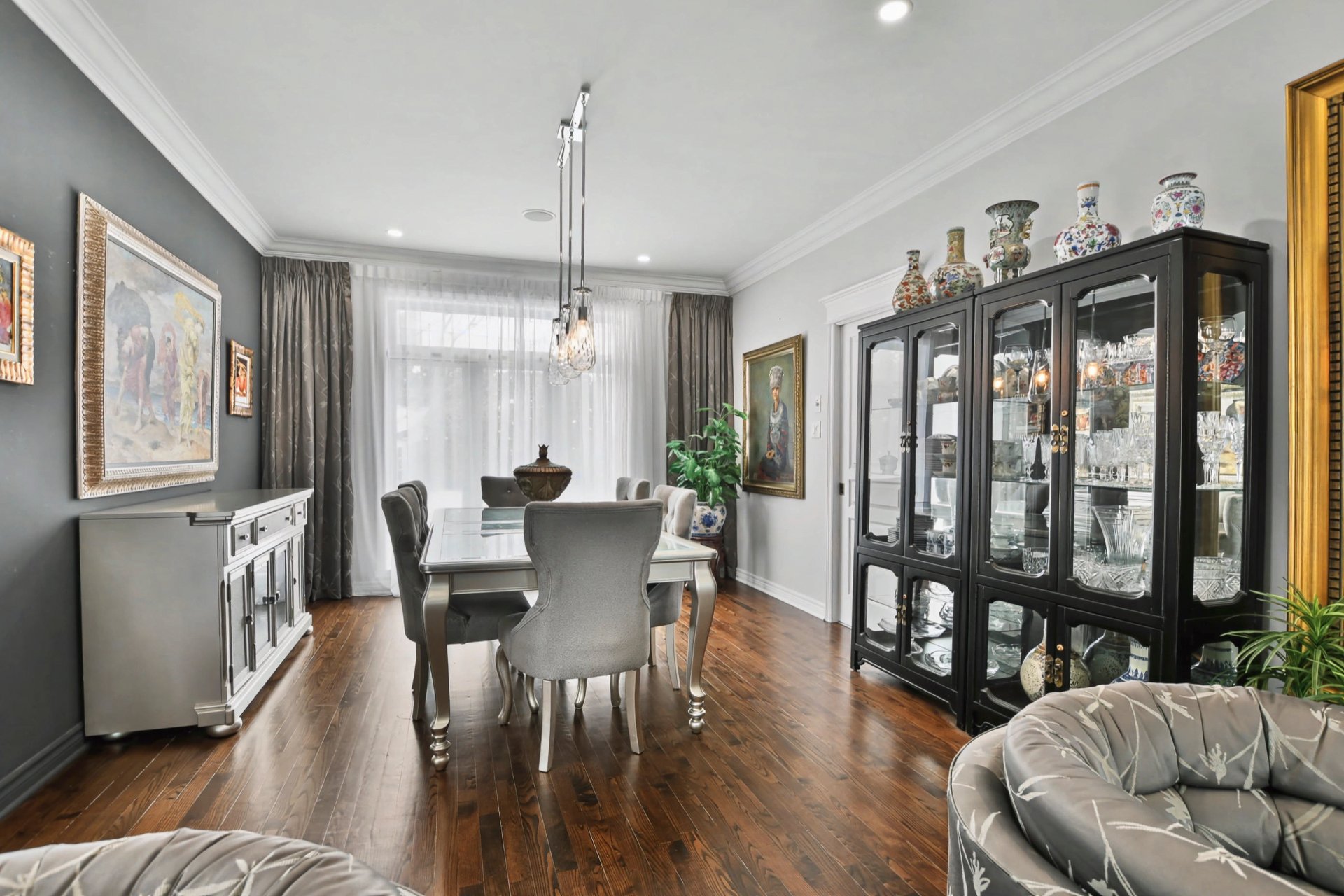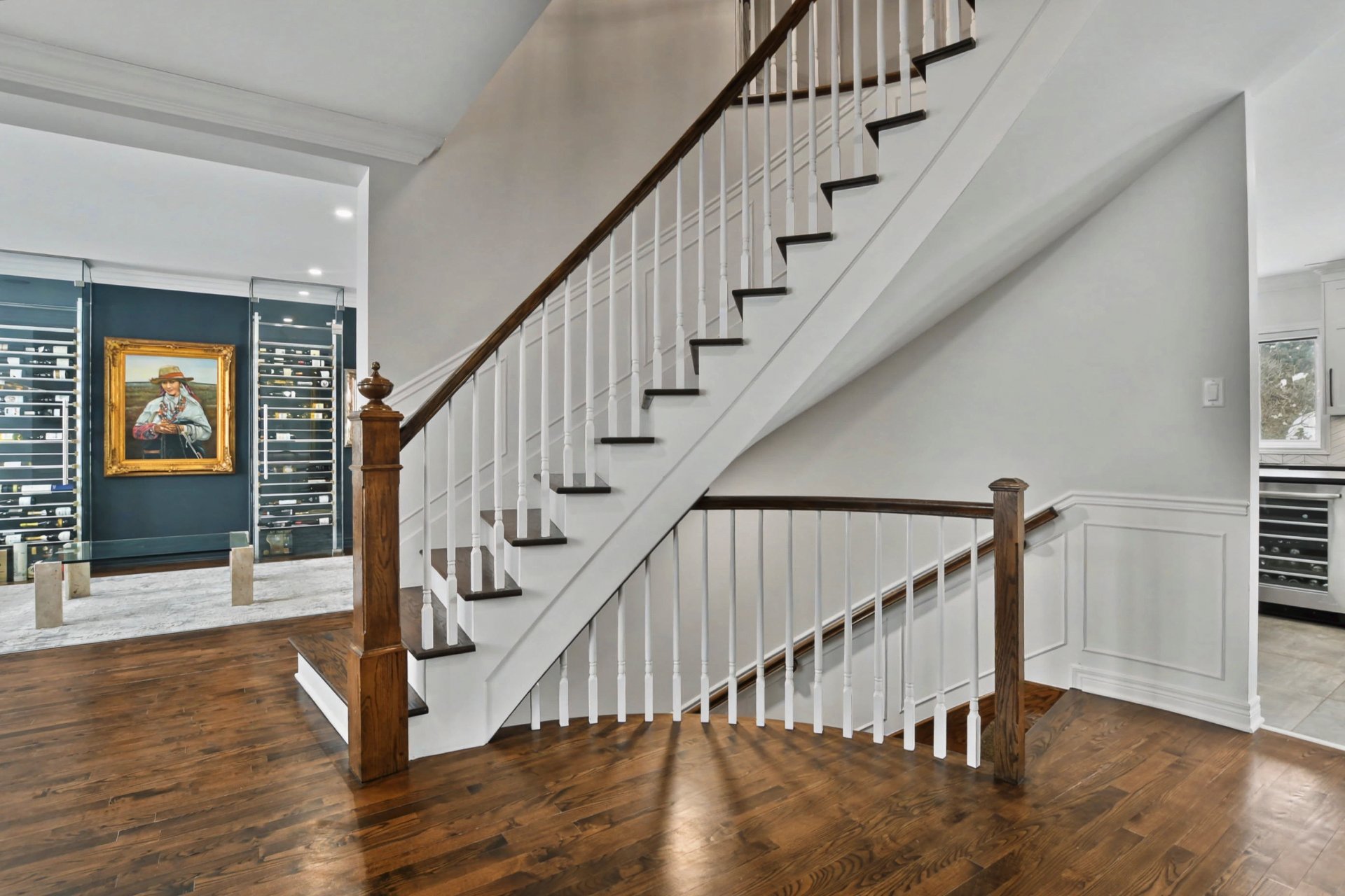 Hall d'entrée accueillant ouvrant sur des aires de vie impressionnantes. Superbe salle familiale avec plafond de 12 pieds, fenestration abondante et foyer au gaz avec manteau de pierre. Cuisine rénovée à aire ouverte sur la salle familiale, dotée d'un immense îlot central, de comptoirs de granite, de nombreux rangements et d'électroménagers de calibre professionnel, dont une cuisinière au gaz de 48 po -- parfaite pour recevoir. Salle à manger adjacente. Deuxième salon avec cellier double intégré (non motorisé). Espaces de vie chaleureux et parfaitement équilibrés.