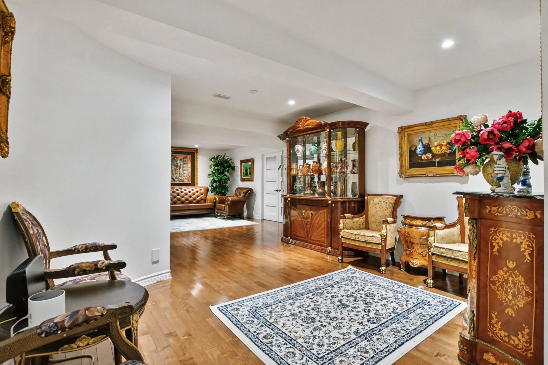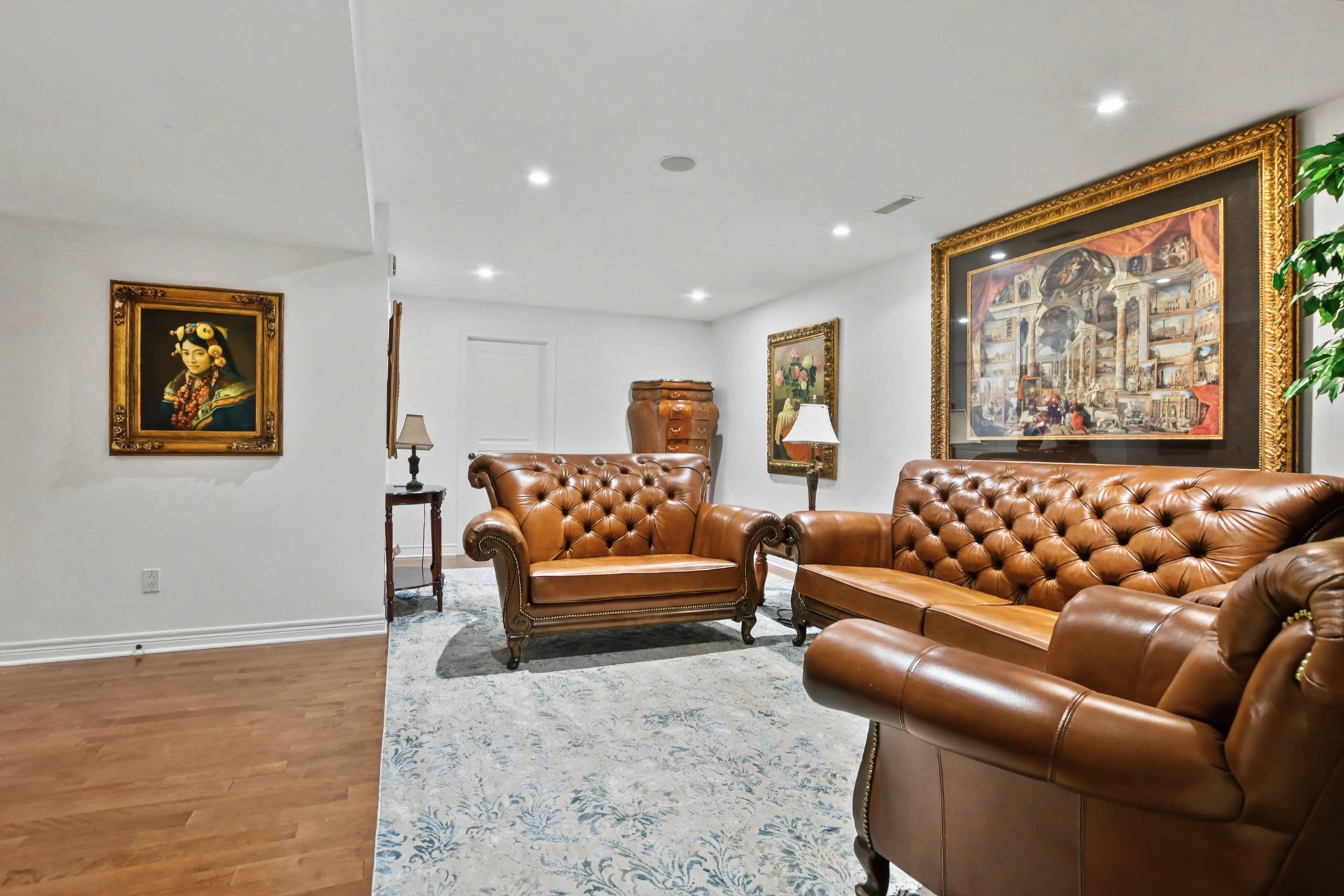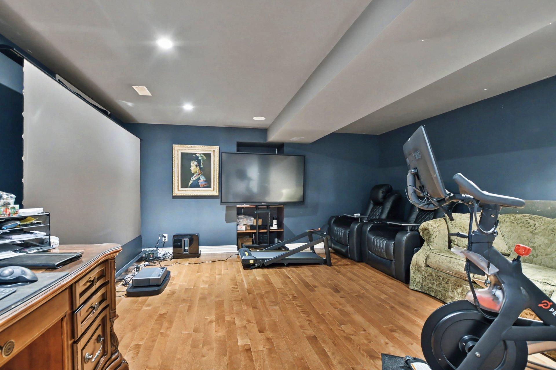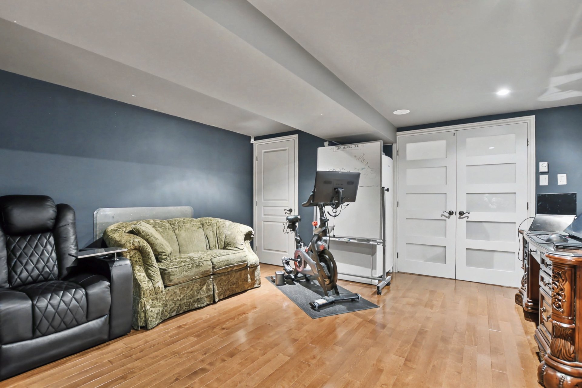 Sous-sol aménagé offrant une grande polyvalence : salle familiale, bureau, espace d'entraînement ou possibilité d'y aménager une ou deux chambres supplémentaires selon les besoins, plancher de bois.