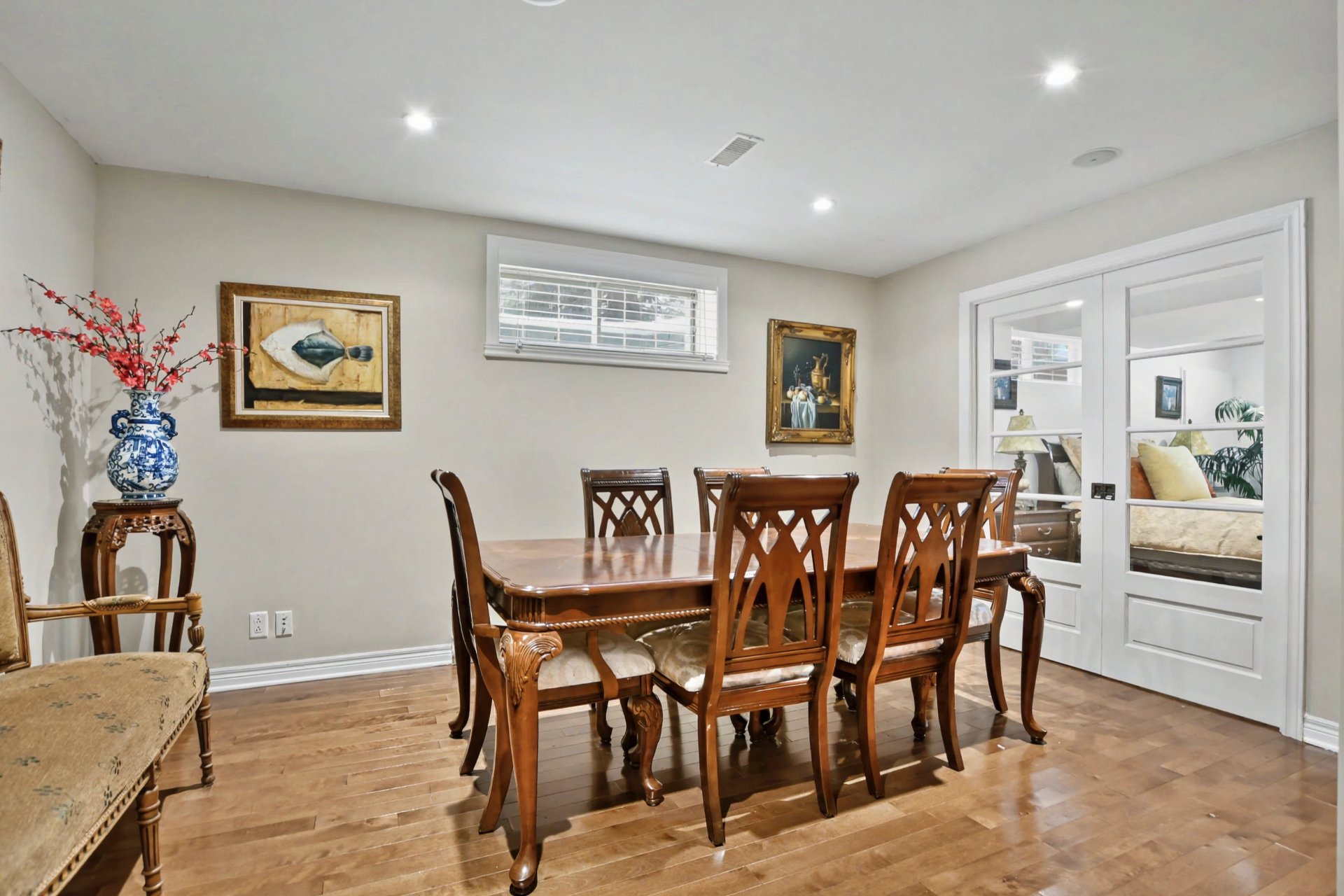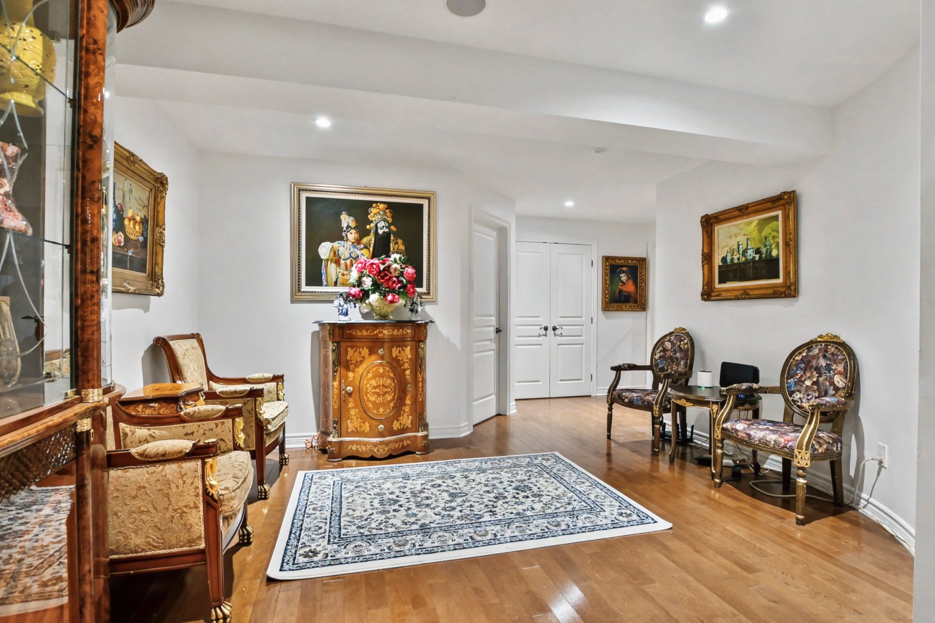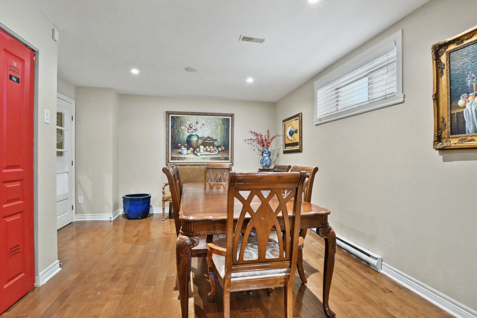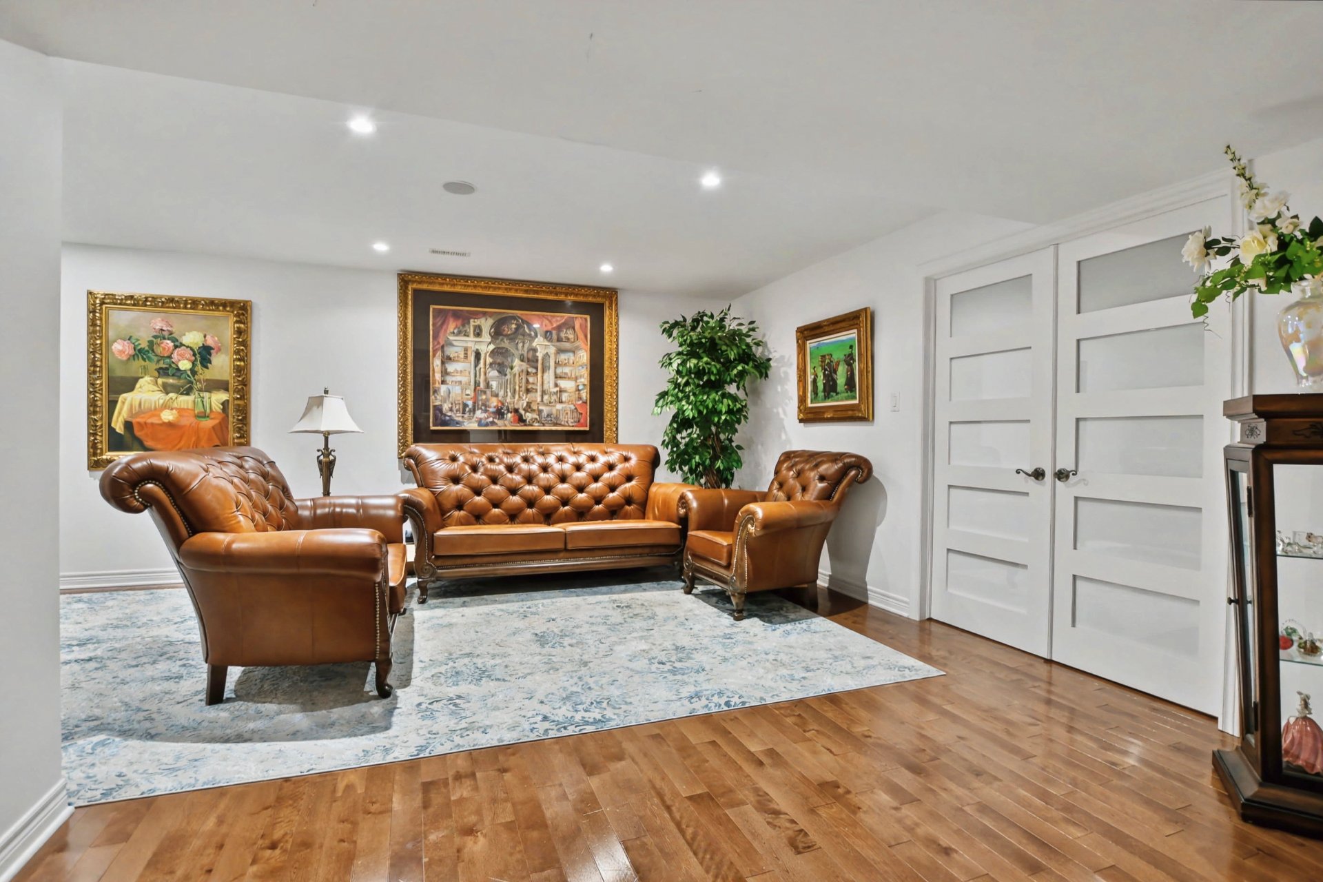 Sous-sol aménagé offrant une grande polyvalence : salle familiale, bureau, espace d'entraînement ou possibilité d'y aménager une ou deux chambres supplémentaires selon les besoins, plancher de bois.