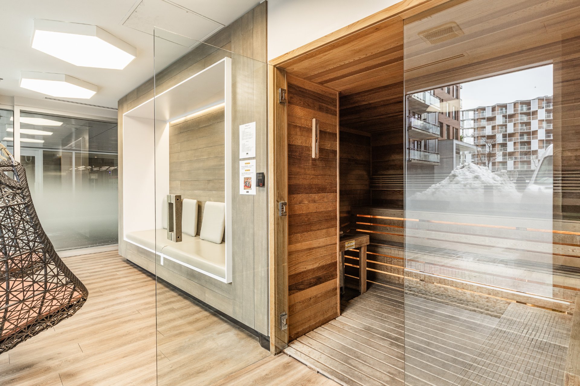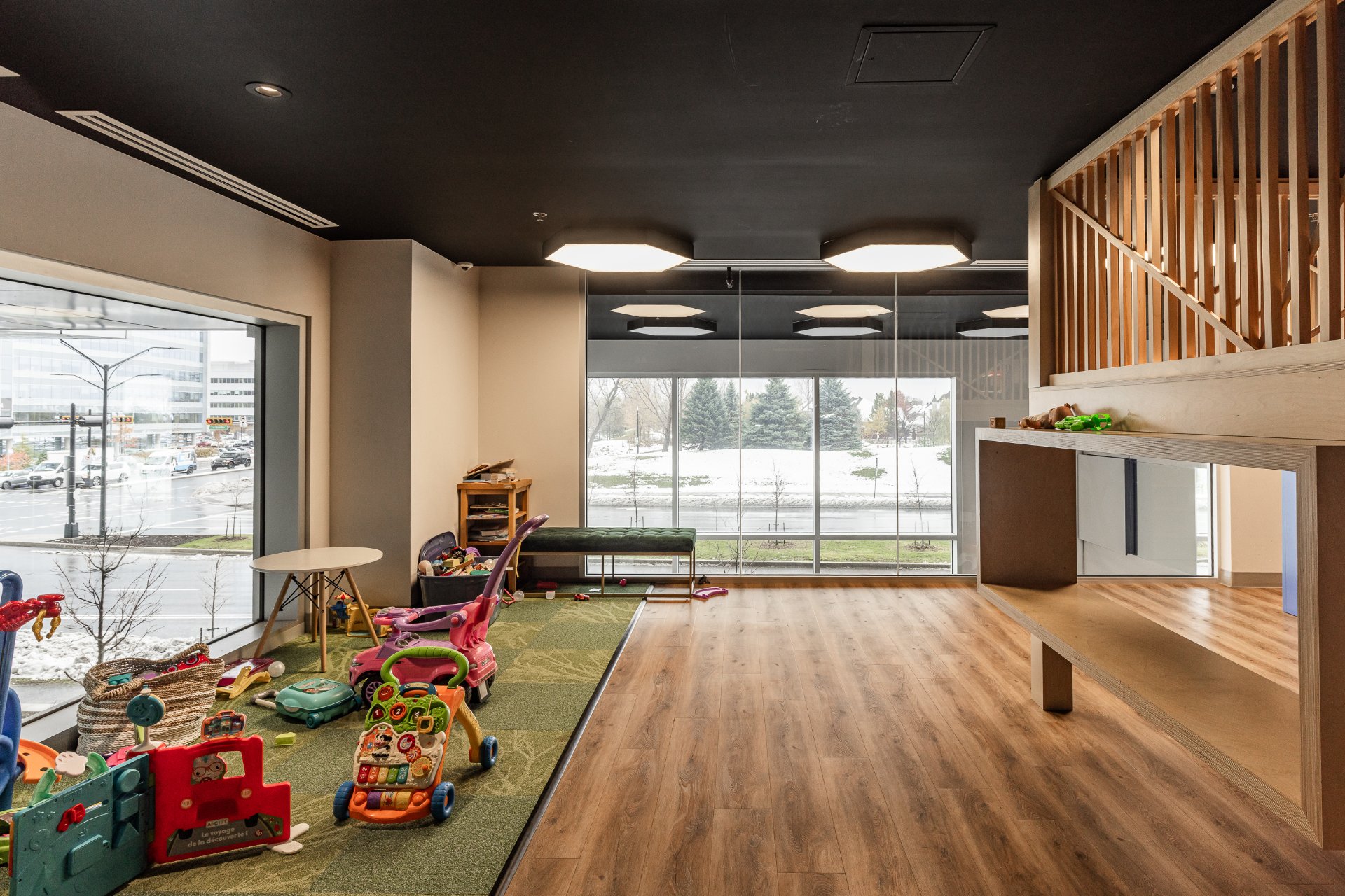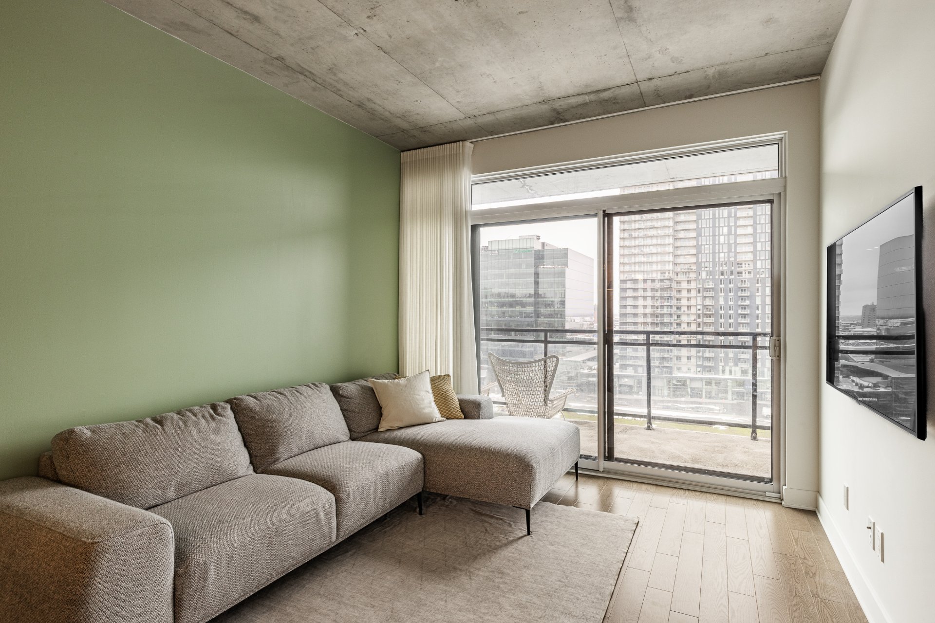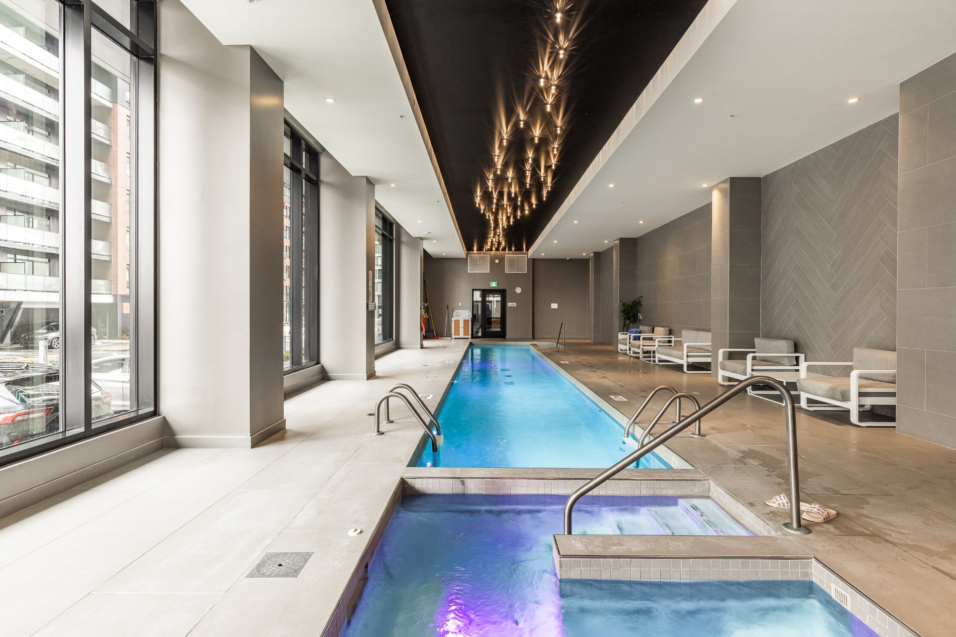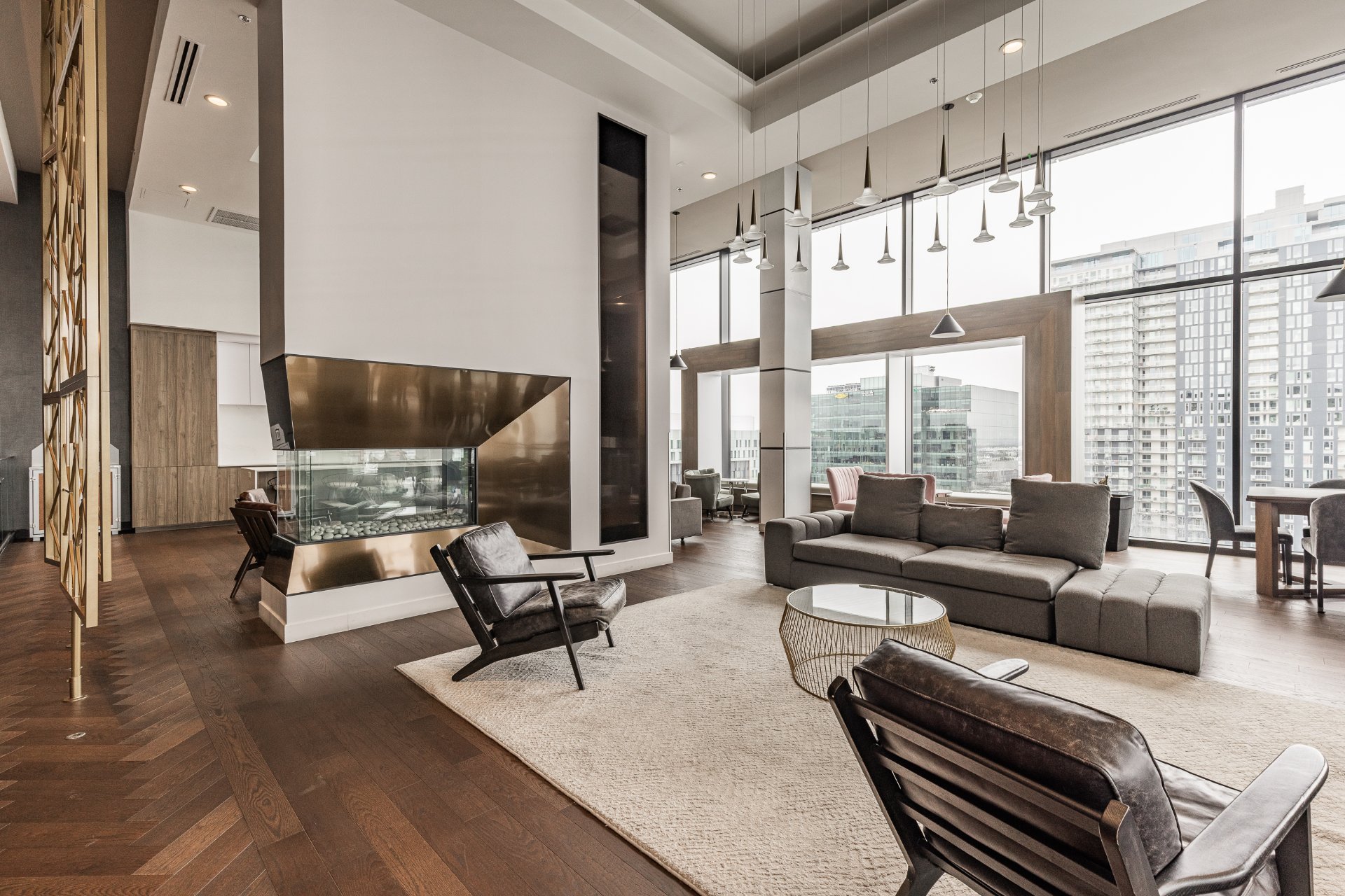 L'immeuble offre une panoplie d'espaces communs dignes des plus grands hôtels : sky-lounge, piscine sur le toit, terrasse, sauna, piscine intérieure, gym, et un accès souterrain direct au REM, permettant de rejoindre le centre-ville -- et bientôt l'aéroport -- sans jamais mettre le pied à l'extérieur.