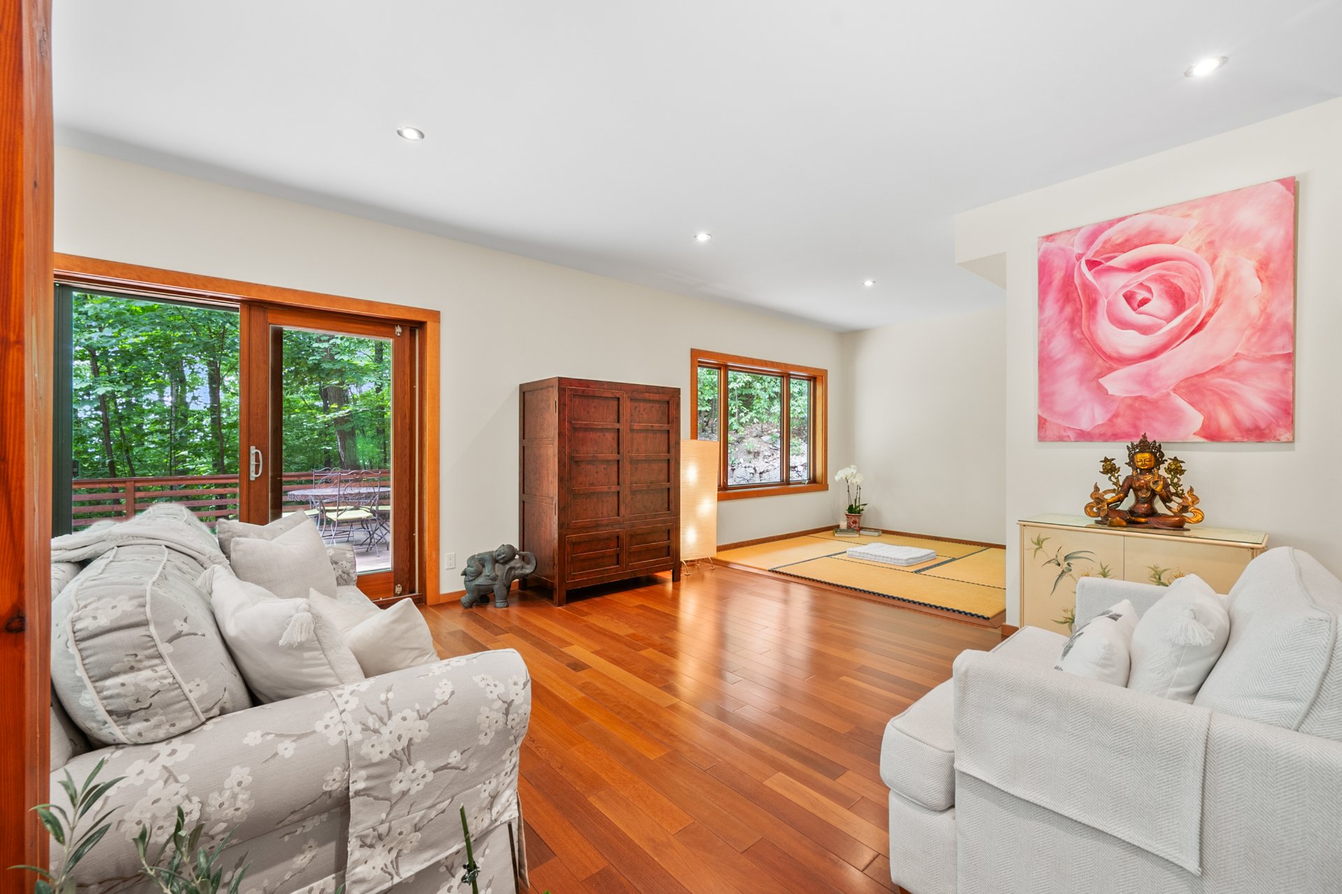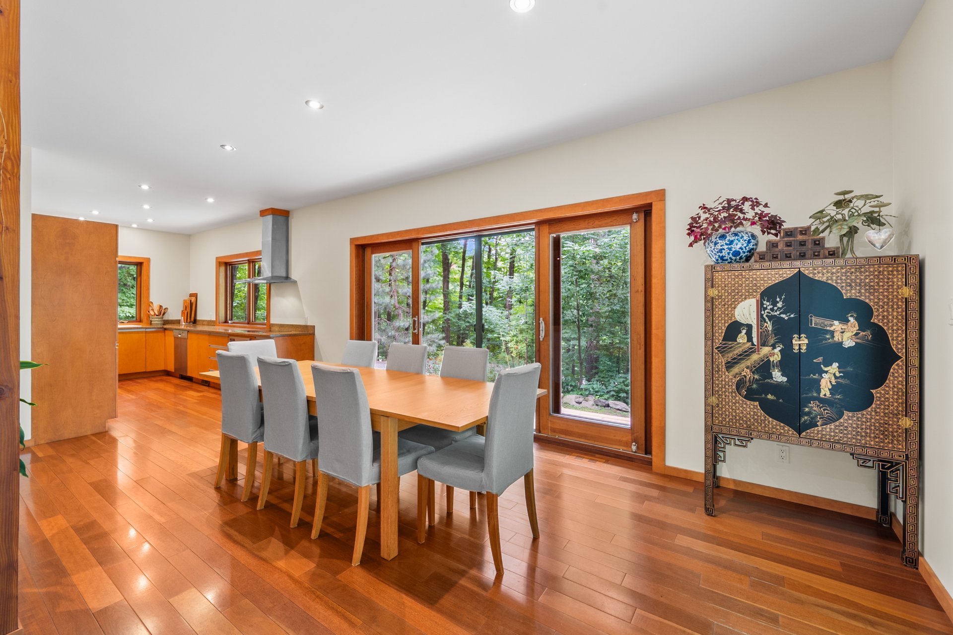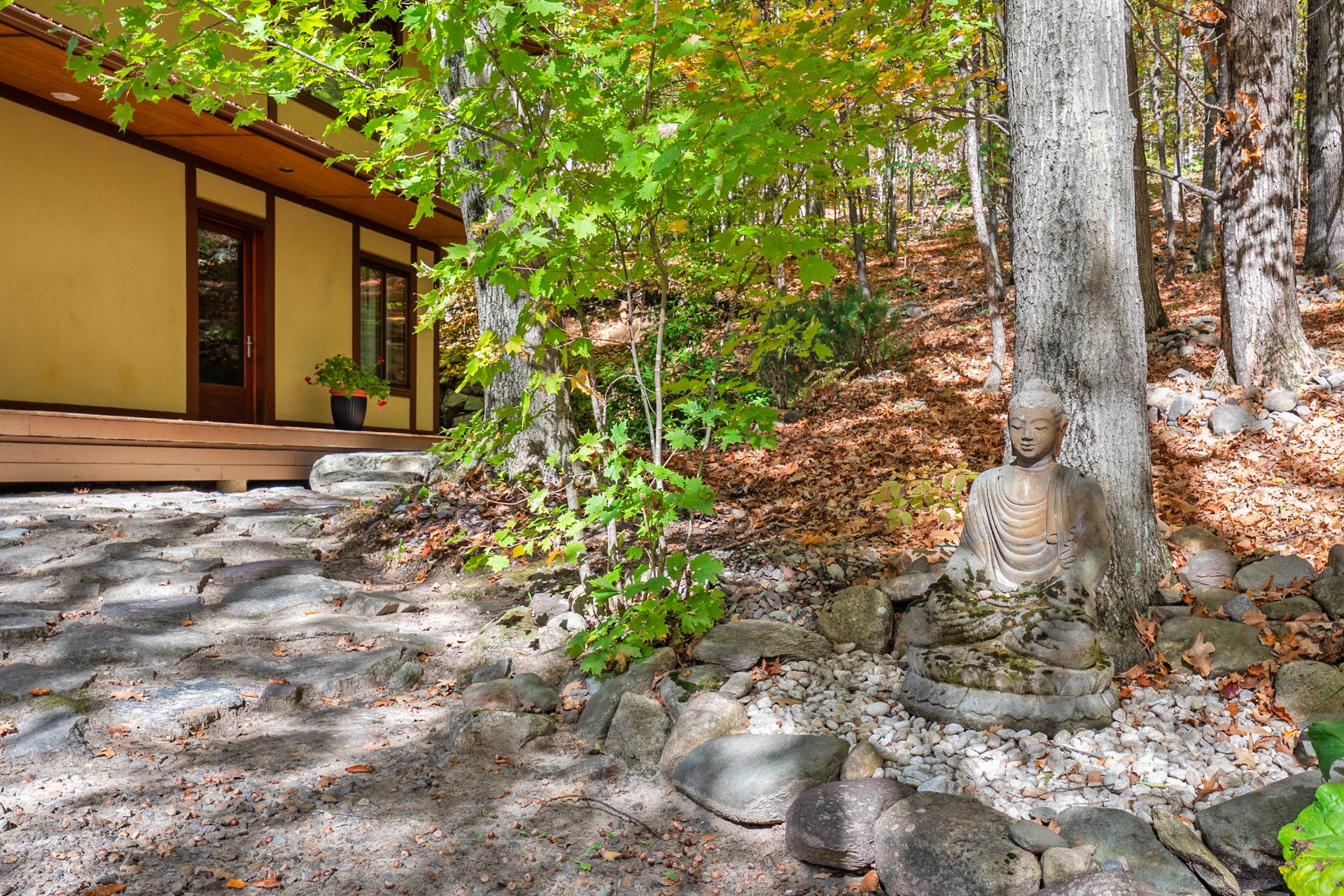 Nichée au coeur d'un majestueux boisé d'arbres matures et centenaires, cette résidence unique d'inspiration japonaise, marie avec finesse design contemporain et éléments traditionnels.