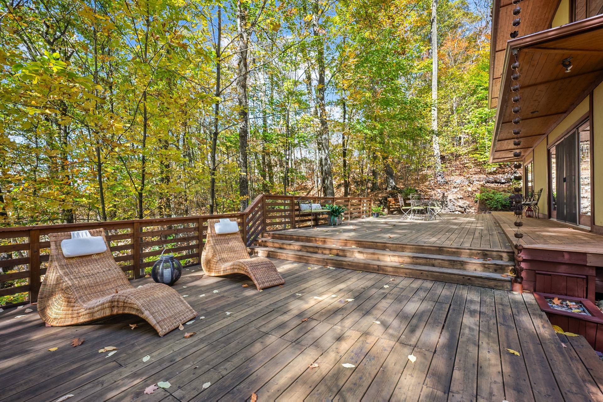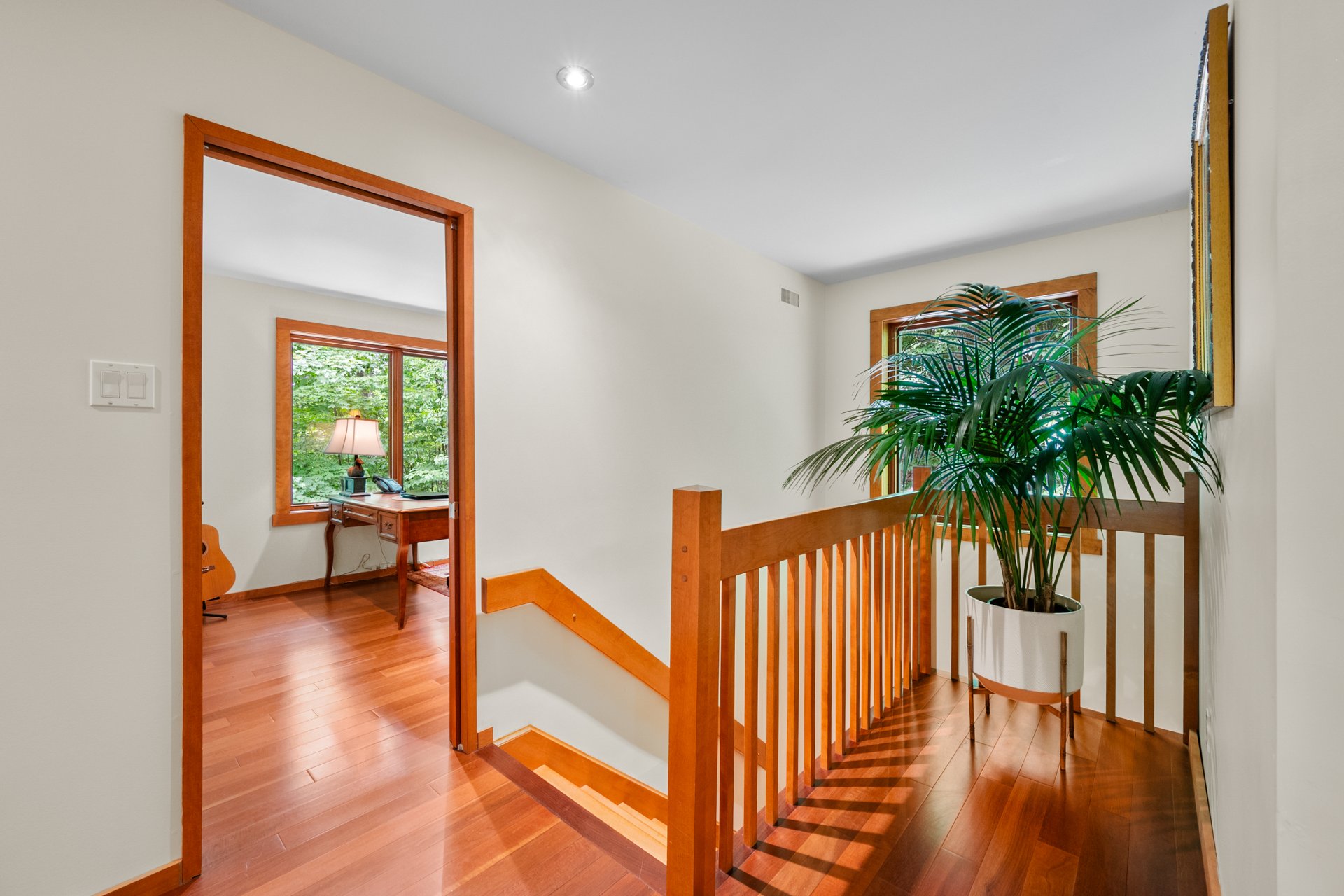 À l'étage, les trois chambres à coucher, le bureau et la salle de bains offrent une vue spectaculaire sur la canopée et les paysages environnants.