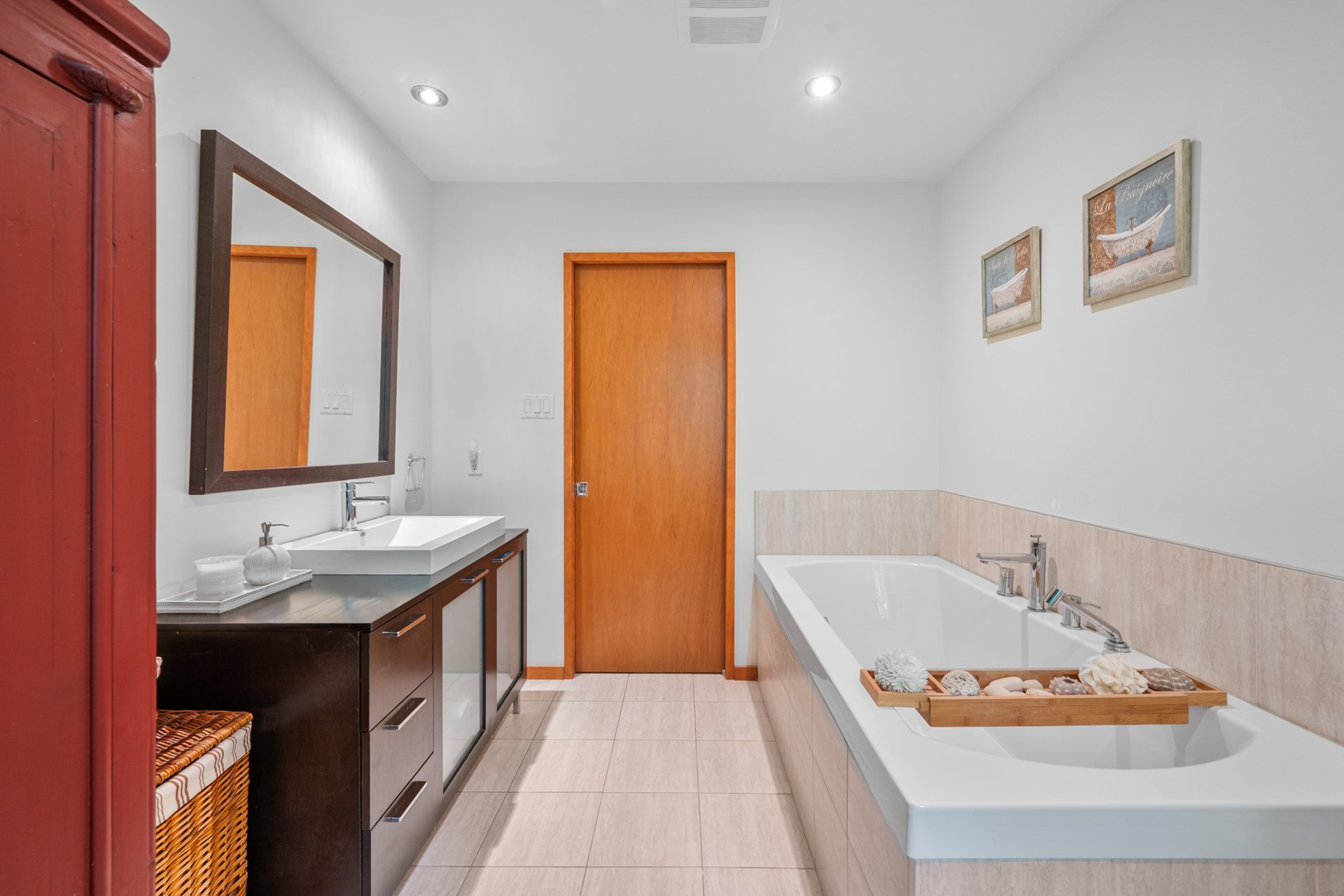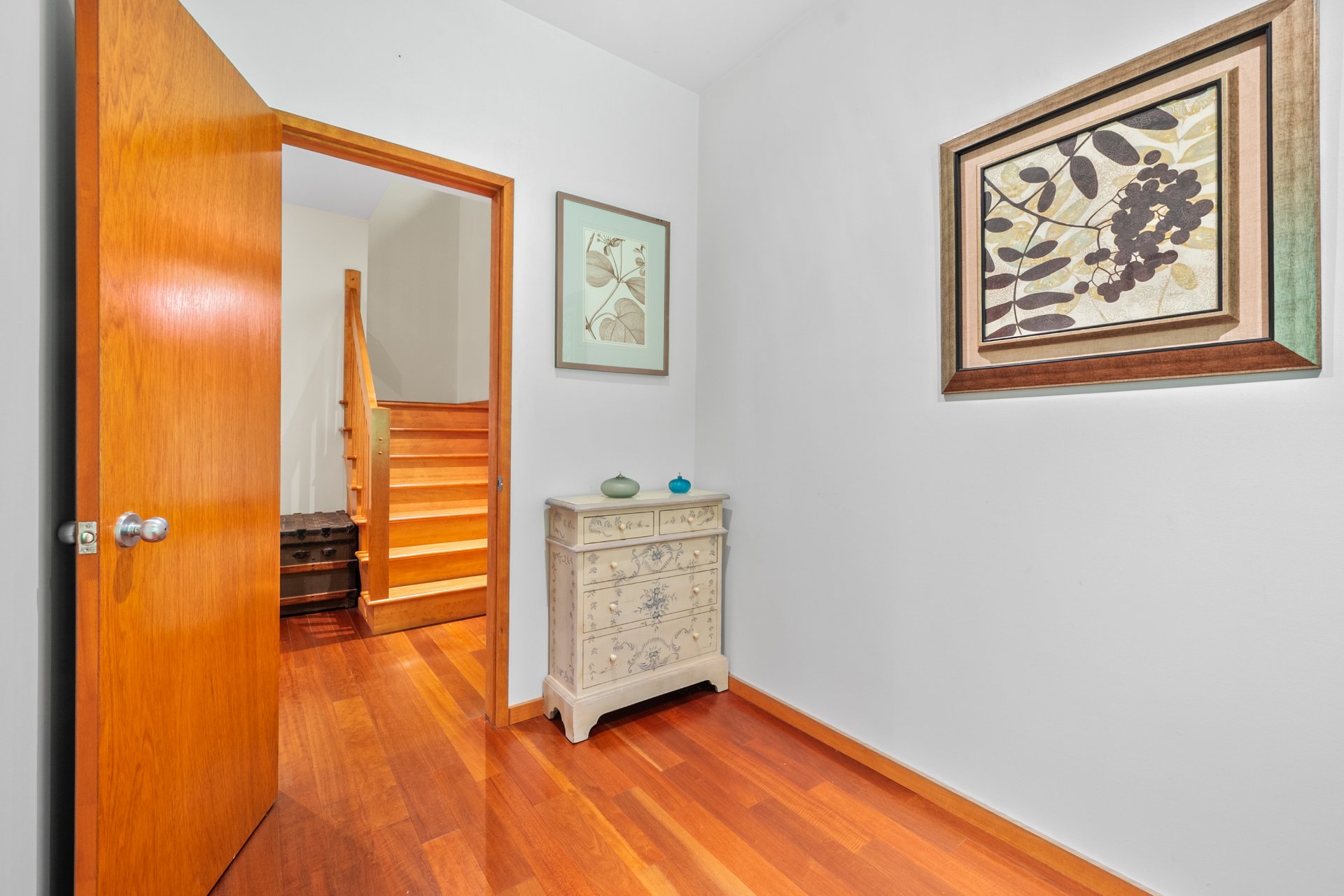 L'entrée est marquée par une porte en cèdre d'Italie, dotée de serrures multipoints françaises, qui annonce d'emblée le ton haut de gamme de la propriété. Le rez-de-chaussée, aux plafonds de 9 pieds, et l'étage, aux plafonds de 8 pieds, offrent une belle sensation d'espace et de fluidité. Boiseries en merisier, planchers en bois exotique du Brésil, fenêtres et portes-patio en cèdre rouge de la Colombie-Britannique, avec vitrage double ou triple : chaque élément a été soigneusement choisi pour allier esthétisme et performance thermique.