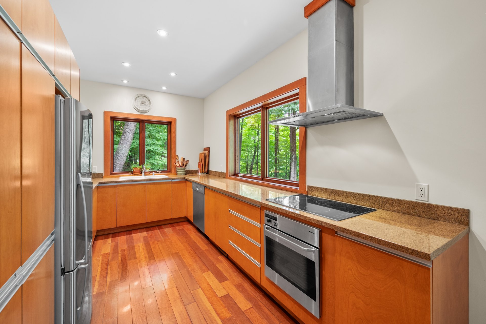La cuisine, à la fois chaleureuse et fonctionnelle, se distingue par ses armoires en bois franc. Le salon s'ouvre sur une galerie en cèdre qui embrasse trois façades de la maison, prolongée par une grande terrasse invitant à la contemplation.