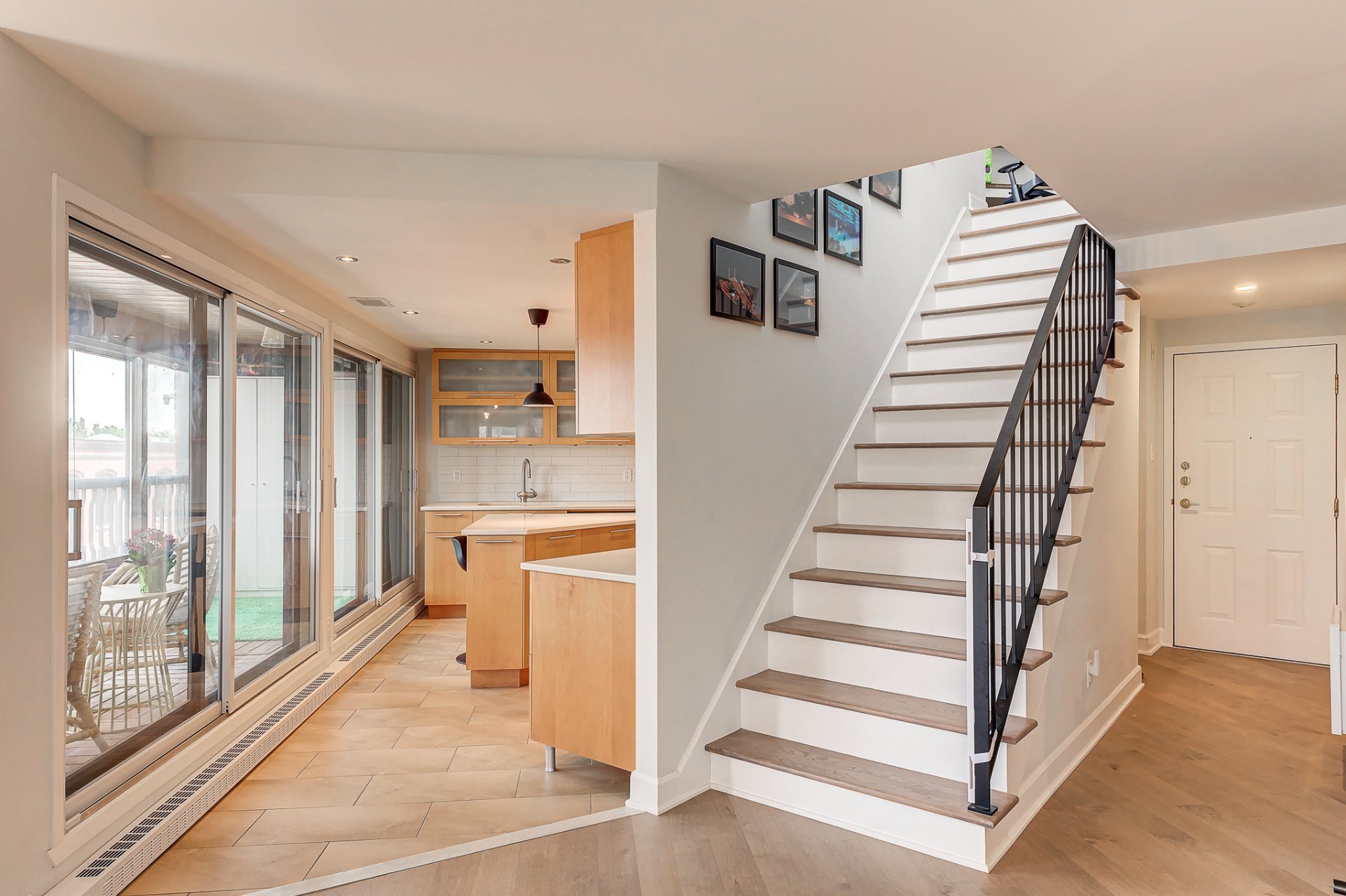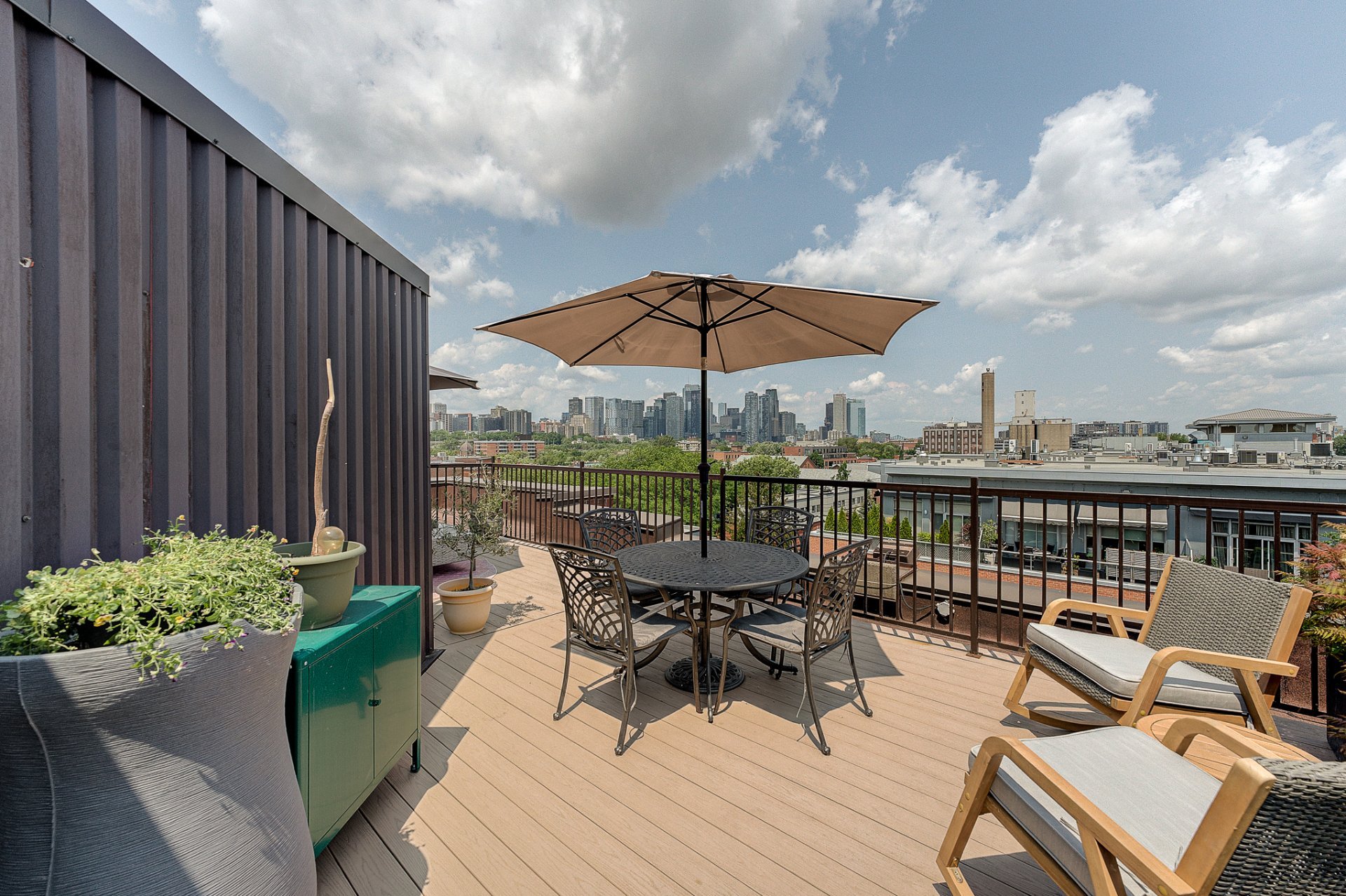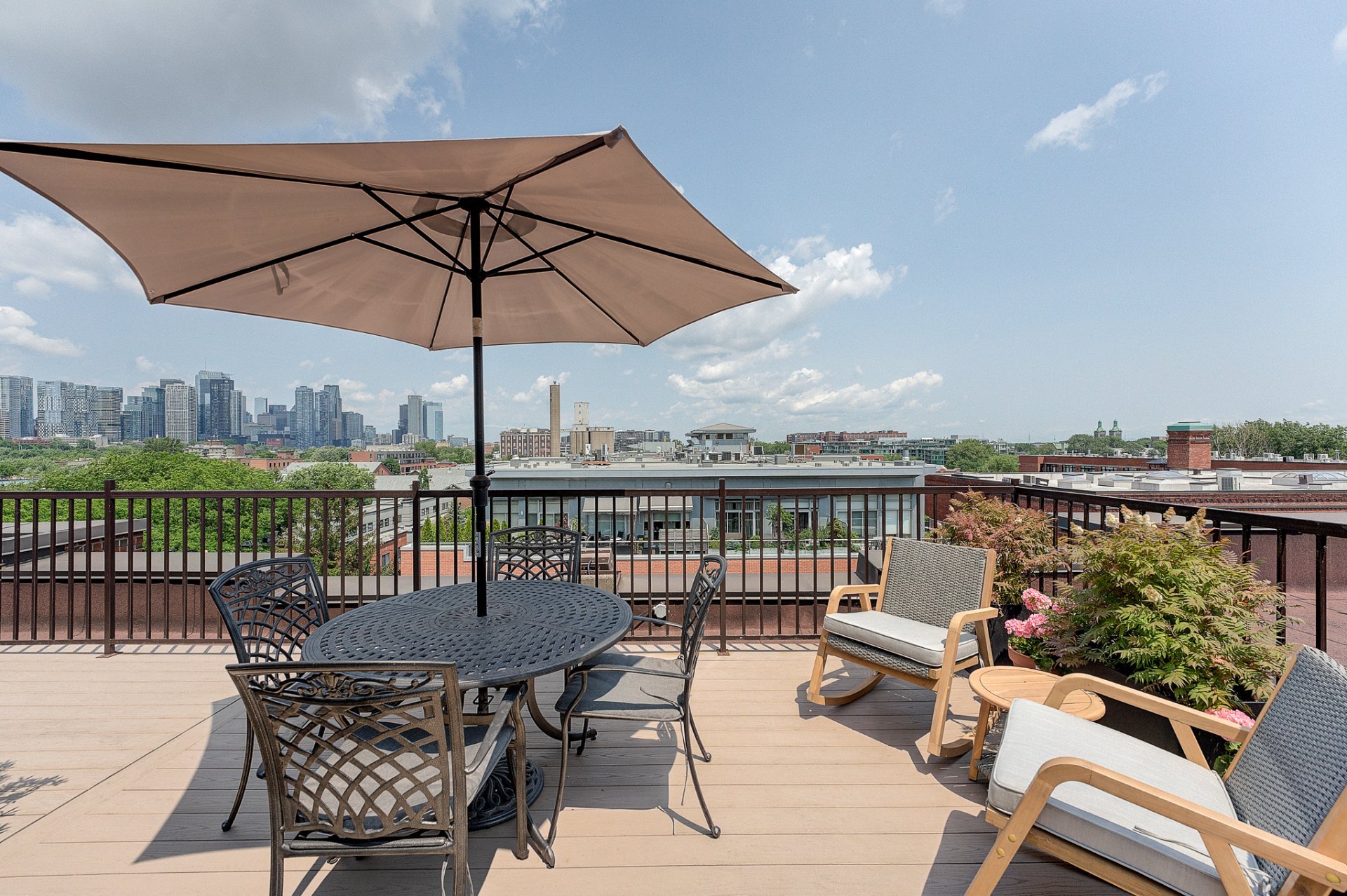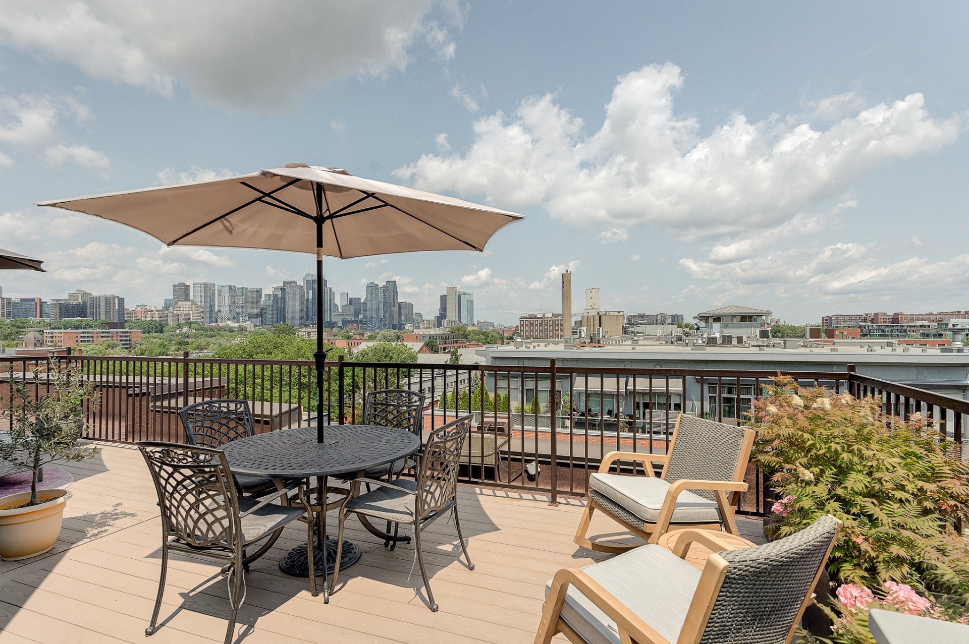 Élément phare de l'unité : une vaste terrasse privée sur le toit, baignée de soleil, avec revêtement en composite installé en 2020 -- parfaite pour recevoir, se détendre ou profiter d'un espace extérieur paisible à deux pas de l'eau
