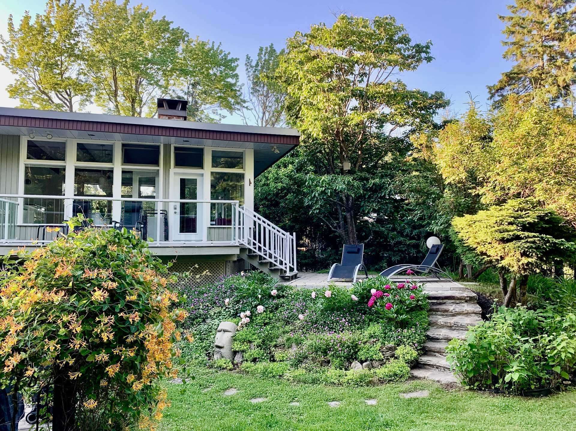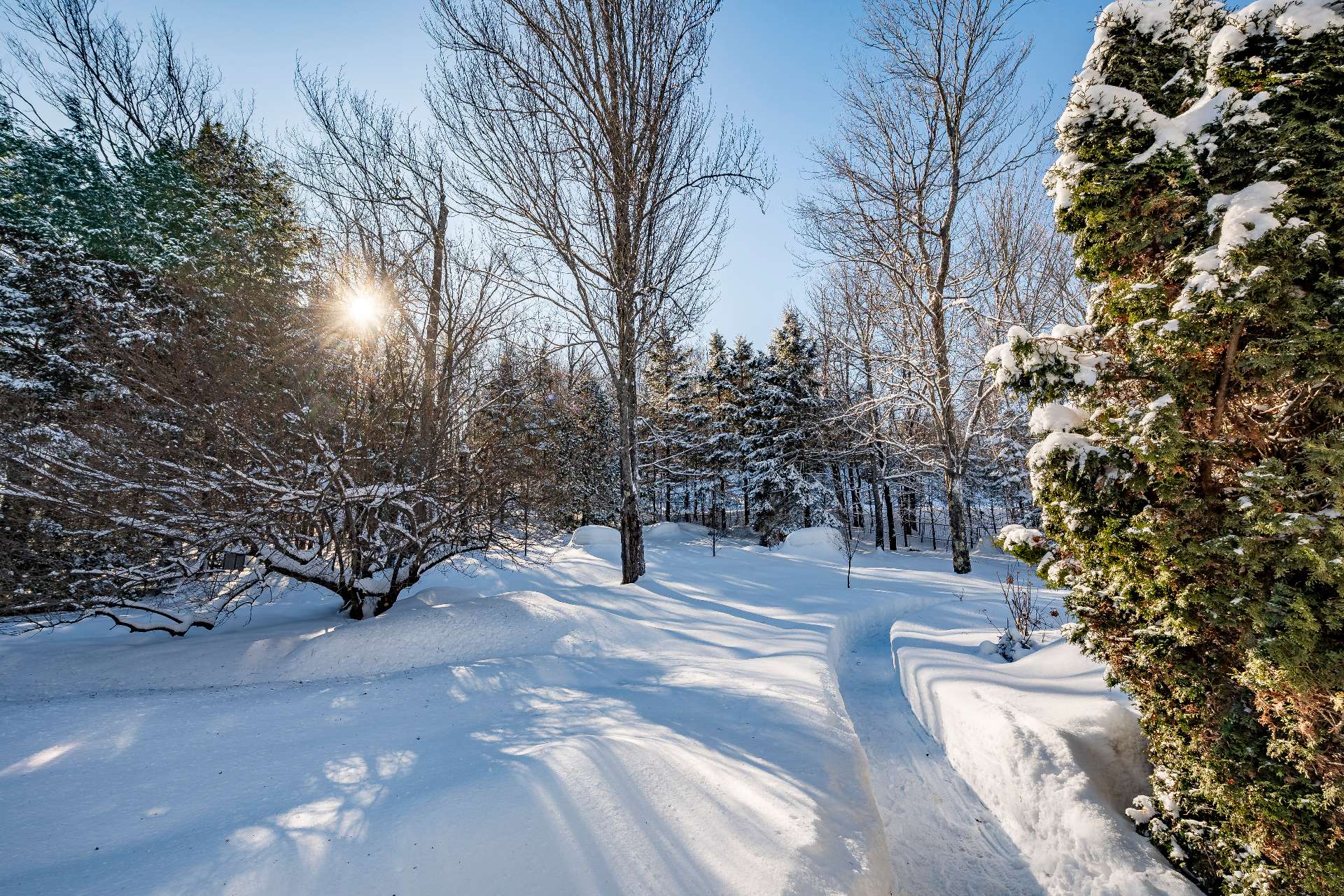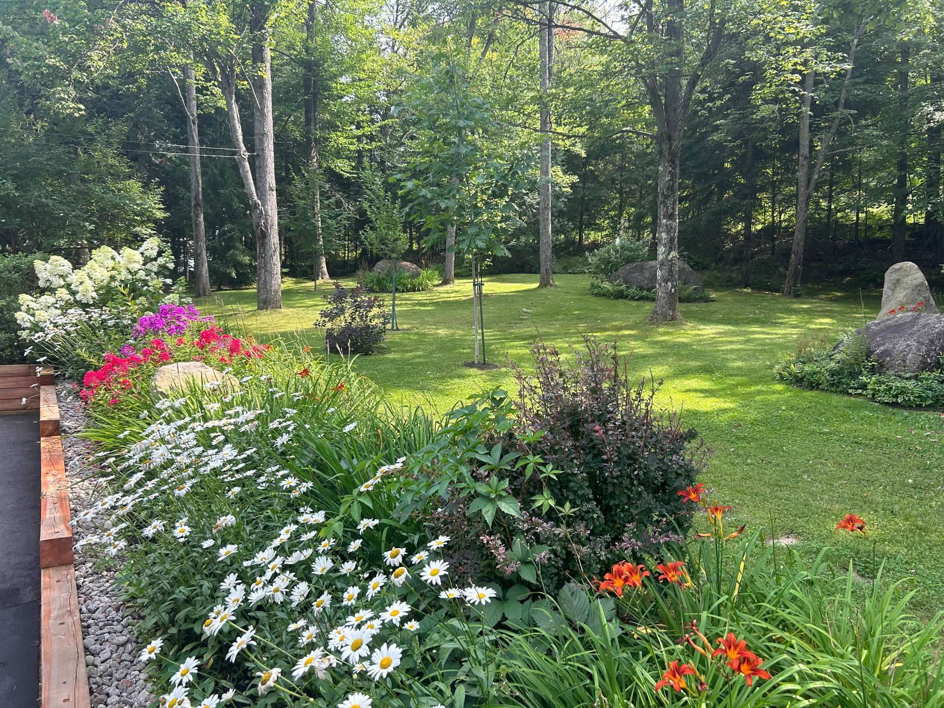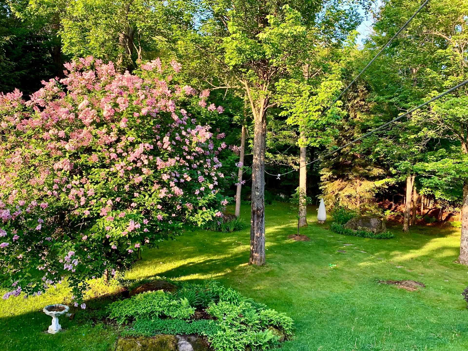 - Vue sur 3 côtés, sur le jardin, le boisé et sur de grands sapins et épinettes de l'autre