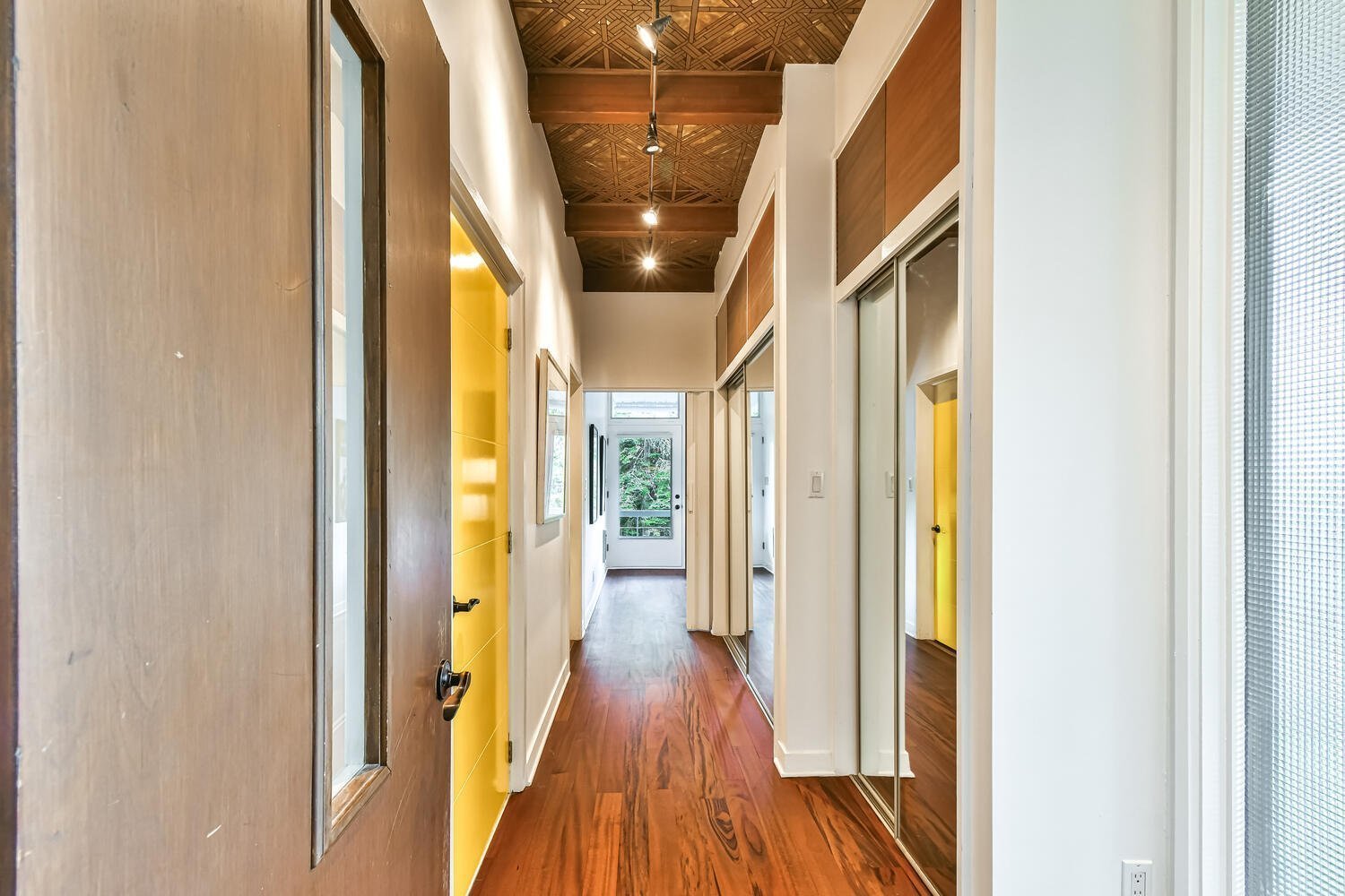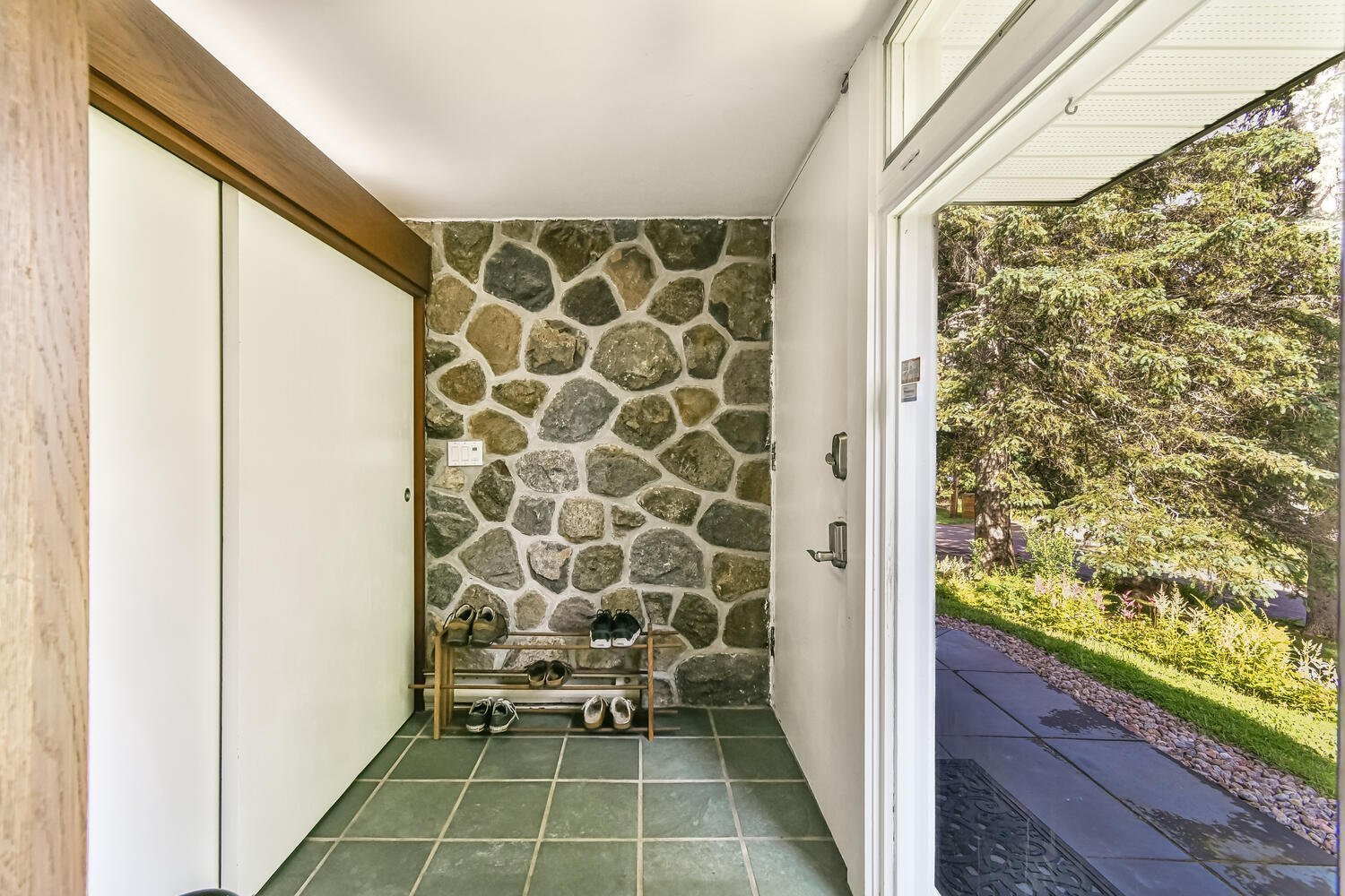- Entrées extérieures avant et arrière et contour en bois de l'entrée de garage