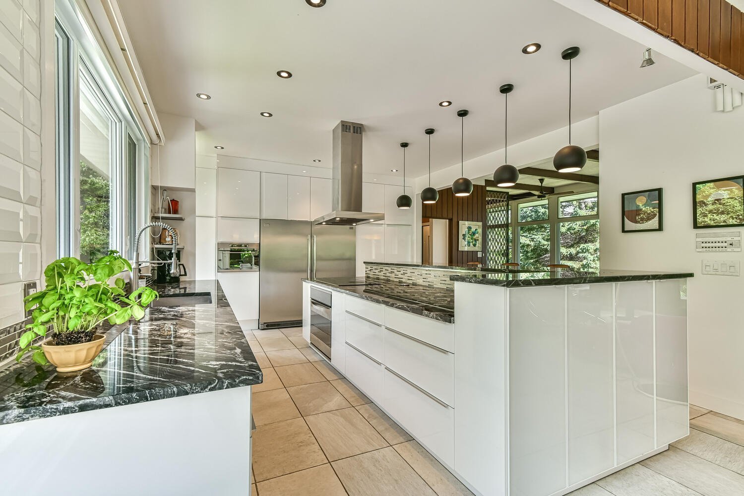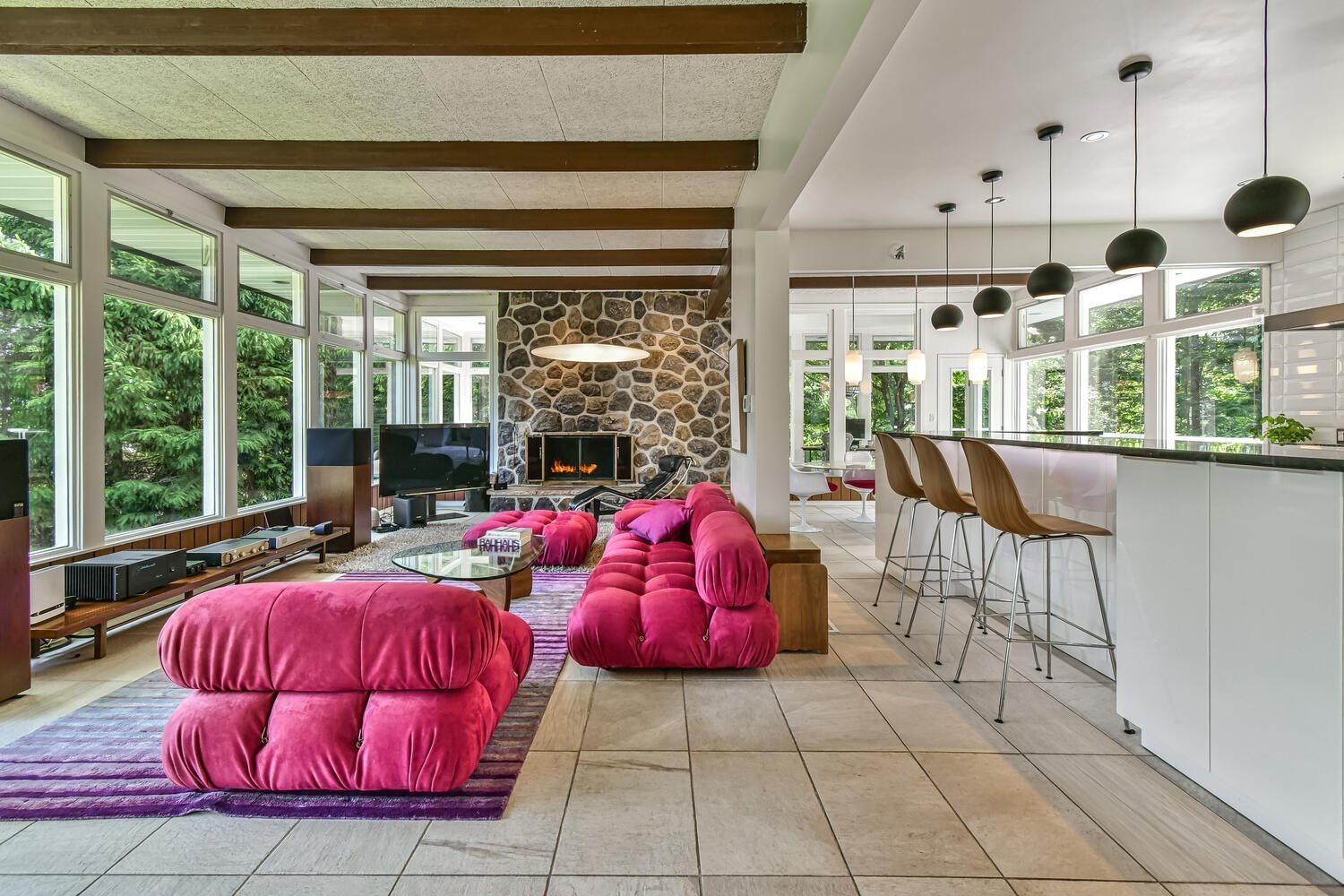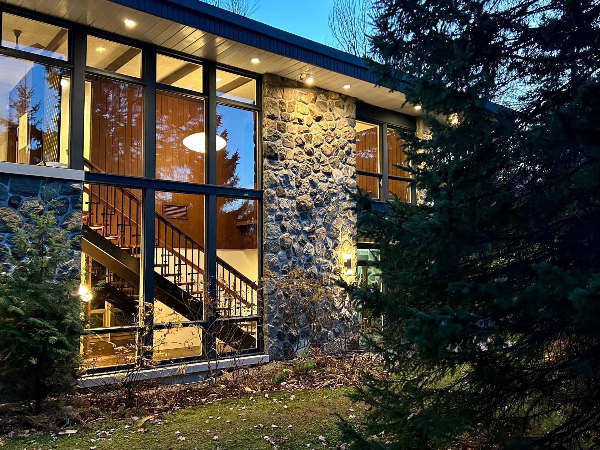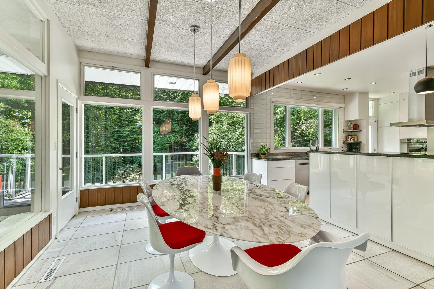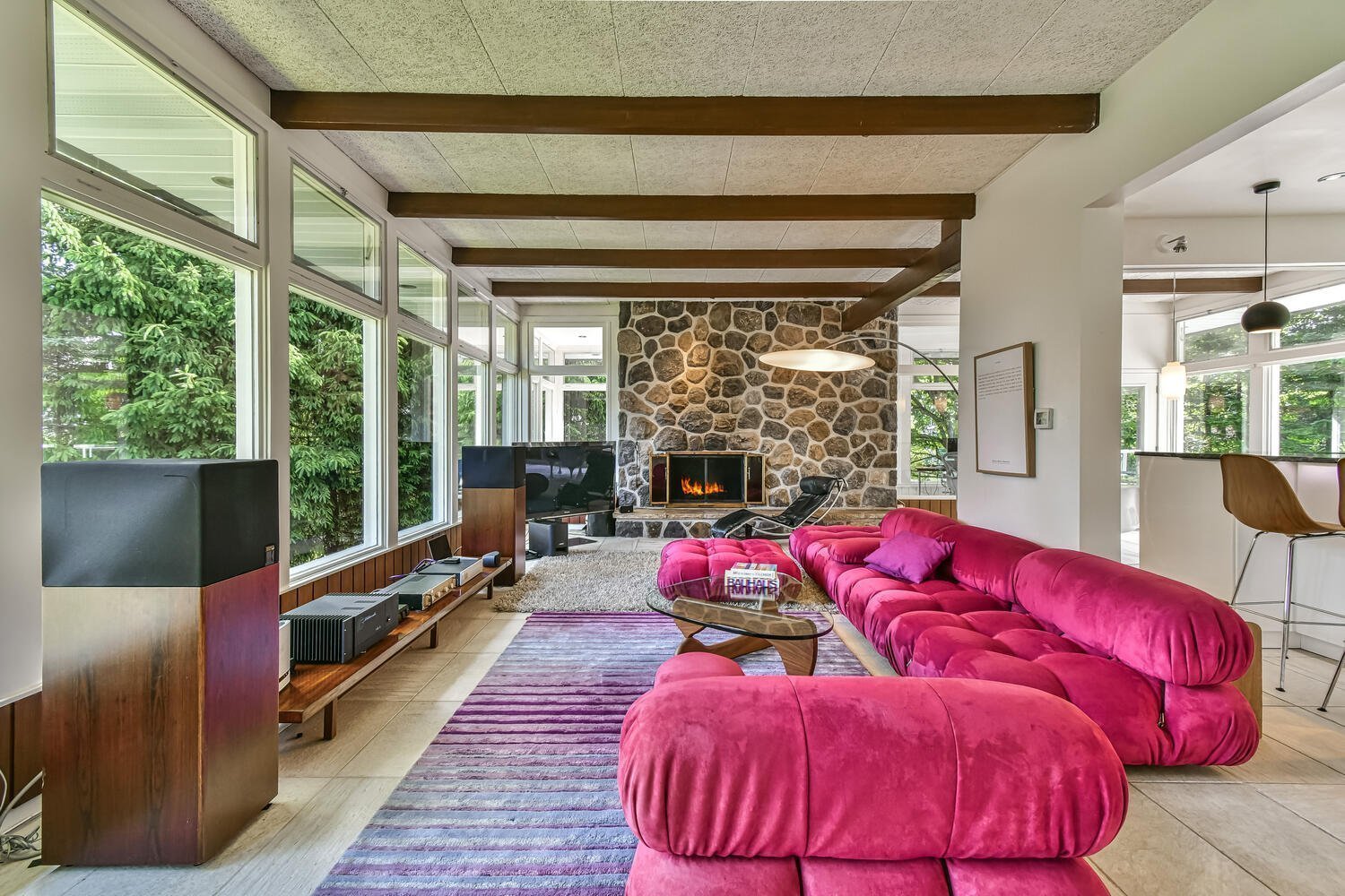 Résidence mid-century-modern rénovée. Construction unique de qualité supérieure, murs en pierres, revêtement extérieur et fenêtres en cèdre, planchers en bois d'ipé et en porcelaine italienne, murs en noyer américain, grand jardin aménagé avec des arbres matures et plantes vivaces. Desservie par l'aqueduc et les égouts municipaux. Offre 5 c.a.c., salon-cuisine-s.a.m. forment une aire ouverte de près de 800 pi2, plafonds de 10 pi., comptoirs en granit. Construite en 1962 par la firme Beauchemin-Beacon-Lapointe - voir addenda.