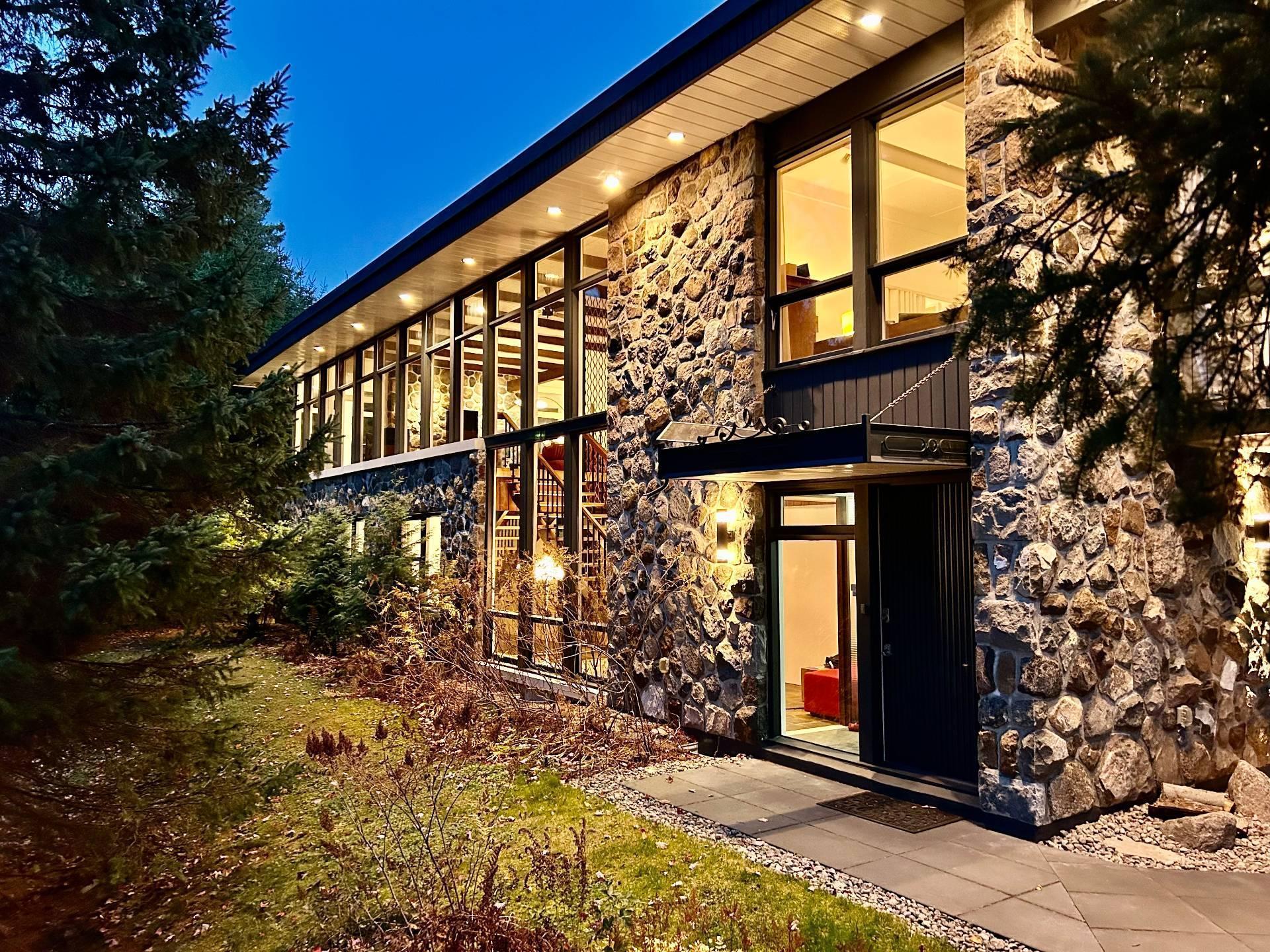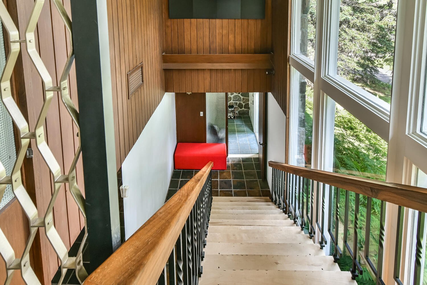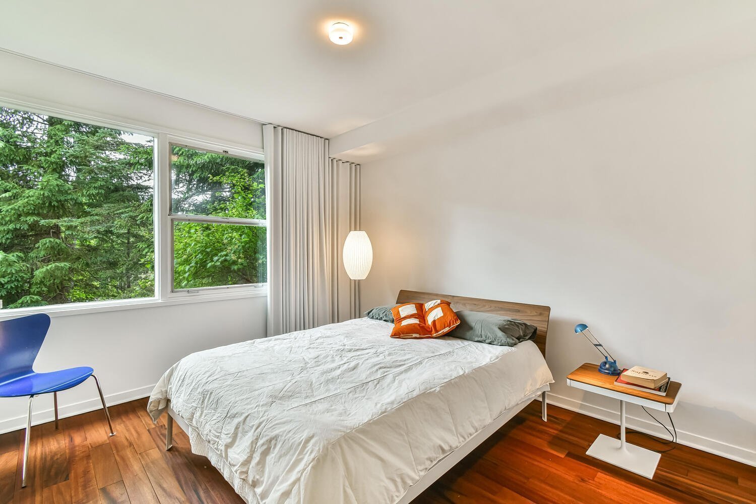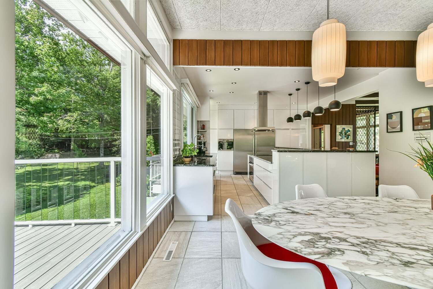 Résidence mid-century-modern rénovée. Construction unique de qualité supérieure, murs en pierres, revêtement extérieur et fenêtres en cèdre, planchers en bois d'ipé et en porcelaine italienne, murs en noyer américain, grand jardin aménagé avec des arbres matures et plantes vivaces. Desservie par l'aqueduc et les égouts municipaux. Offre 5 c.a.c., salon-cuisine-s.a.m. forment une aire ouverte de près de 800 pi2, plafonds de 10 pi., comptoirs en granit. Construite en 1962 par la firme Beauchemin-Beacon-Lapointe - voir addenda.
