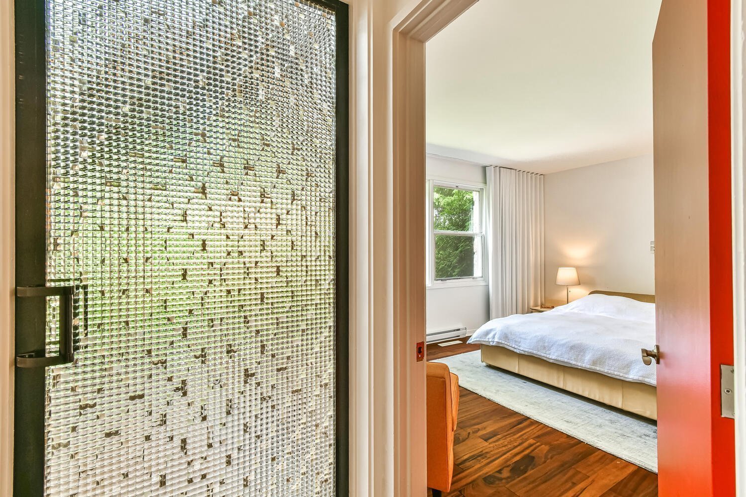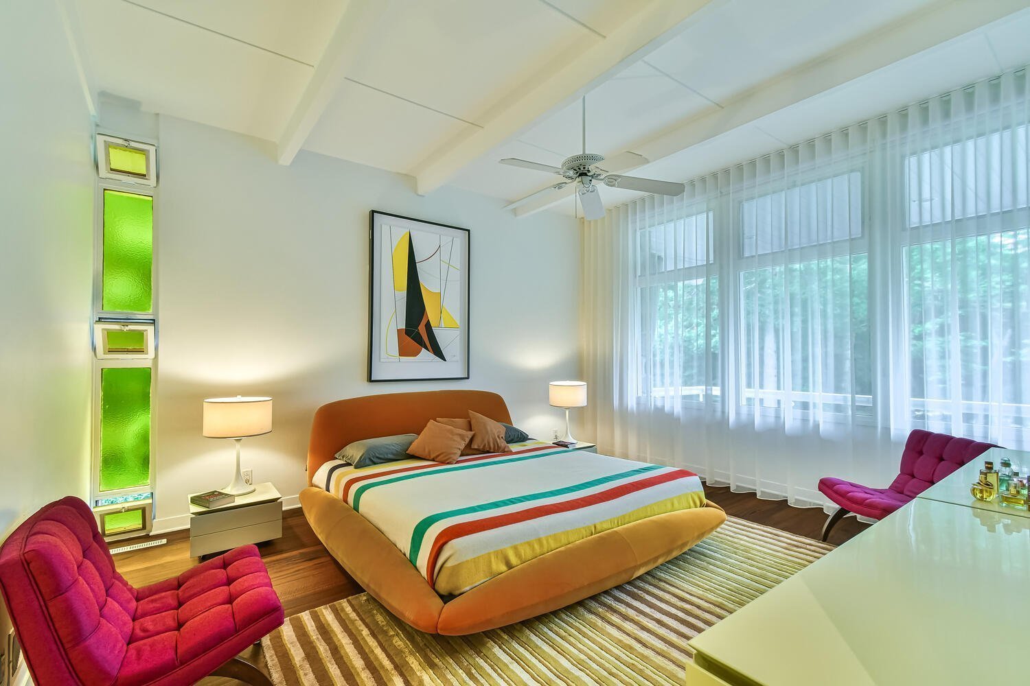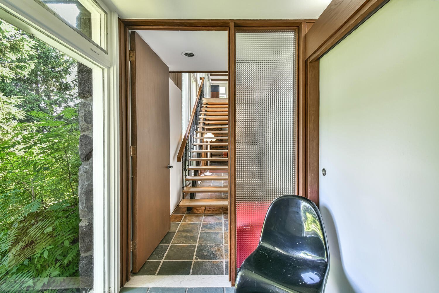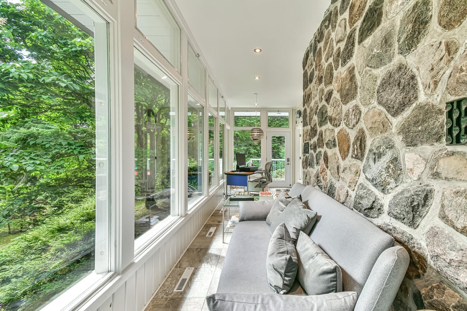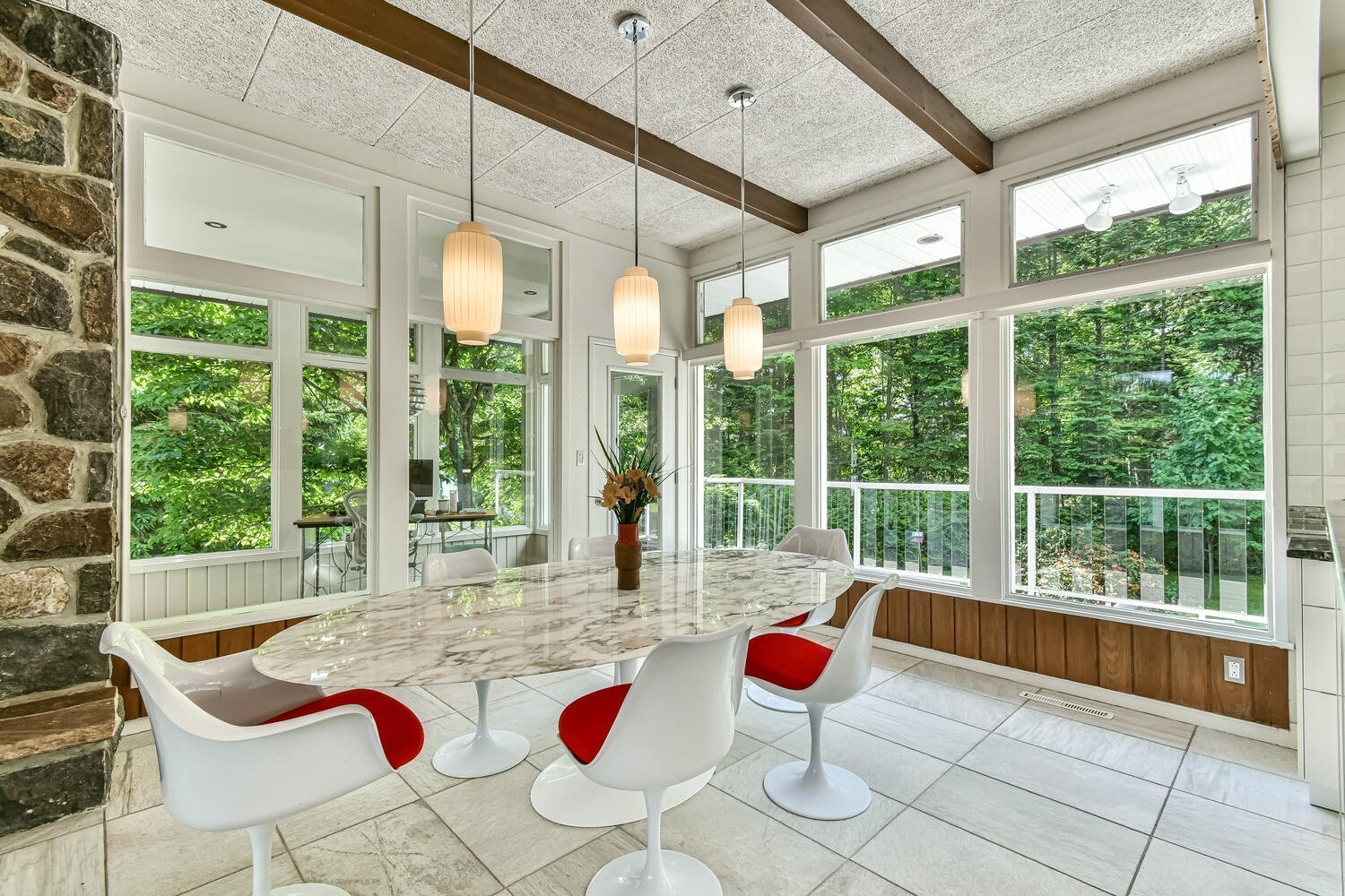 Résidence mid-century-modern rénovée. Construction unique de qualité supérieure, murs en pierres, revêtement extérieur et fenêtres en cèdre, planchers en bois d'ipé et en porcelaine italienne, murs en noyer américain, grand jardin aménagé avec des arbres matures et plantes vivaces. Desservie par l'aqueduc et les égouts municipaux. Offre 5 c.a.c., salon-cuisine-s.a.m. forment une aire ouverte de près de 800 pi2, plafonds de 10 pi., comptoirs en granit. Construite en 1962 par la firme Beauchemin-Beacon-Lapointe - voir addenda.