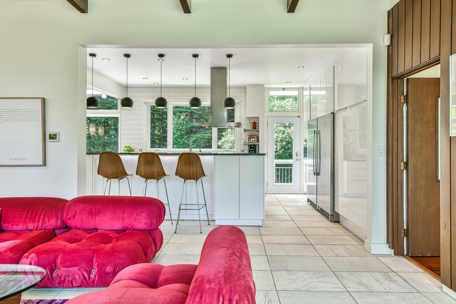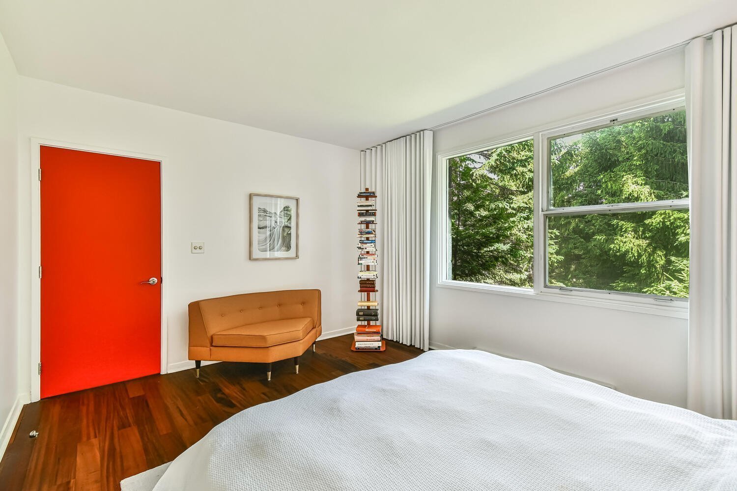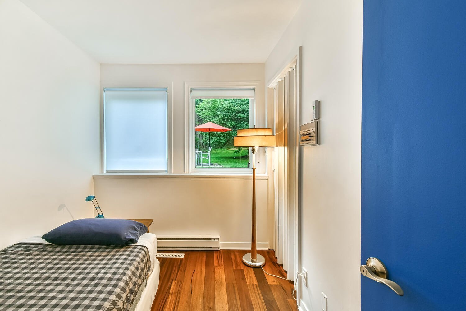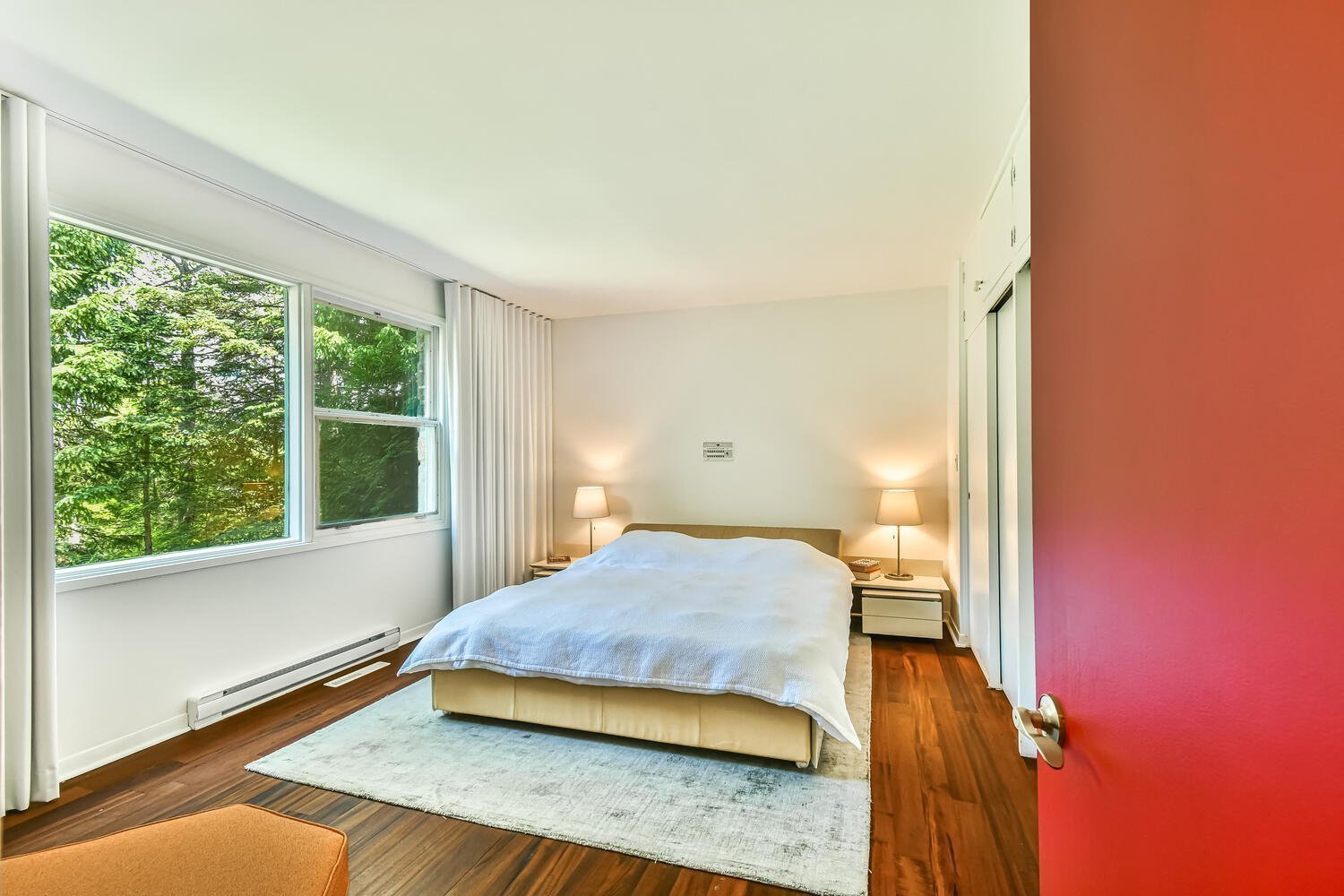Résidence mid-century-modern rénovée. Construction unique de qualité supérieure, murs en pierres, revêtement extérieur et fenêtres en cèdre, planchers en bois d'ipé et en porcelaine italienne, murs en noyer américain, grand jardin aménagé avec des arbres matures et plantes vivaces. Desservie par l'aqueduc et les égouts municipaux. Offre 5 c.a.c., salon-cuisine-s.a.m. forment une aire ouverte de près de 800 pi2, plafonds de 10 pi., comptoirs en granit. Construite en 1962 par la firme Beauchemin-Beacon-Lapointe - voir addenda.