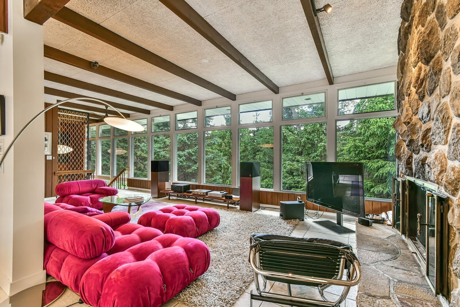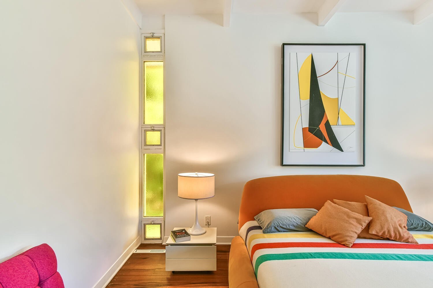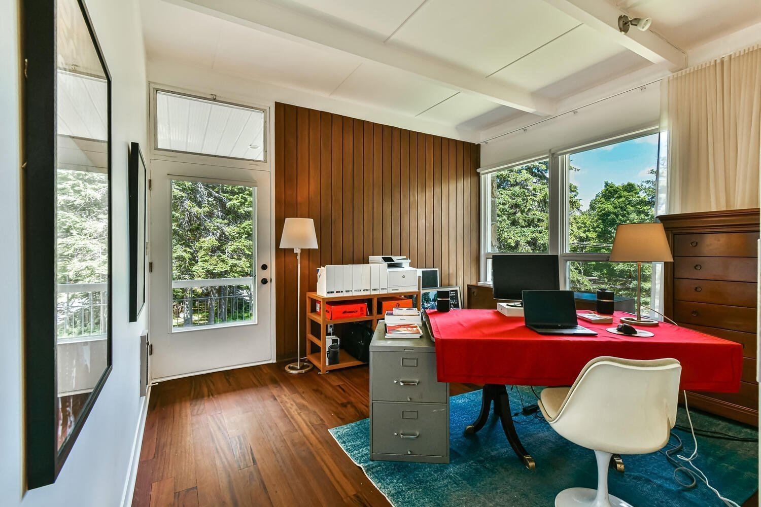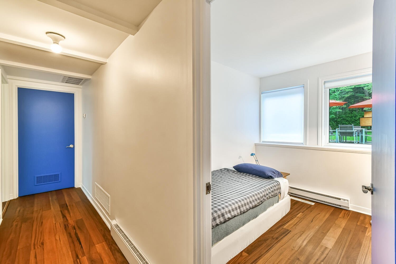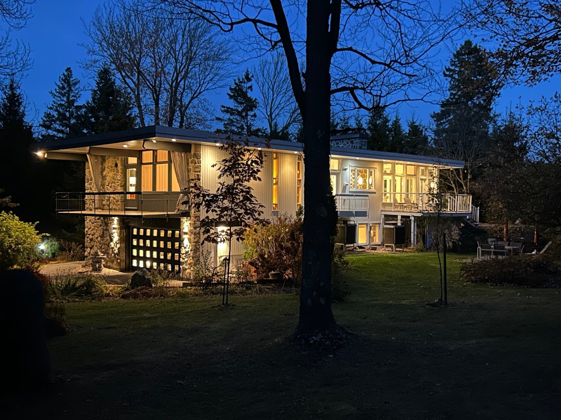 Résidence mid-century-modern rénovée. Construction unique de qualité supérieure, murs en pierres, revêtement extérieur et fenêtres en cèdre, planchers en bois d'ipé et en porcelaine italienne, murs en noyer américain, grand jardin aménagé avec des arbres matures et plantes vivaces. Desservie par l'aqueduc et les égouts municipaux. Offre 5 c.a.c., salon-cuisine-s.a.m. forment une aire ouverte de près de 800 pi2, plafonds de 10 pi., comptoirs en granit. Construite en 1962 par la firme Beauchemin-Beacon-Lapointe - voir addenda.
