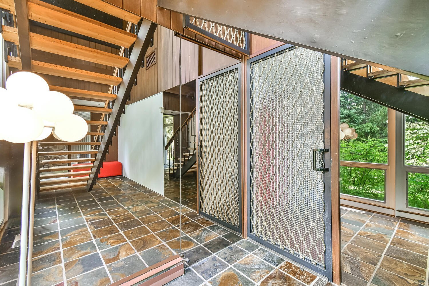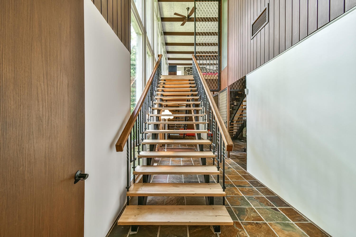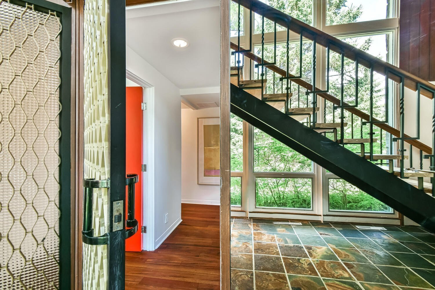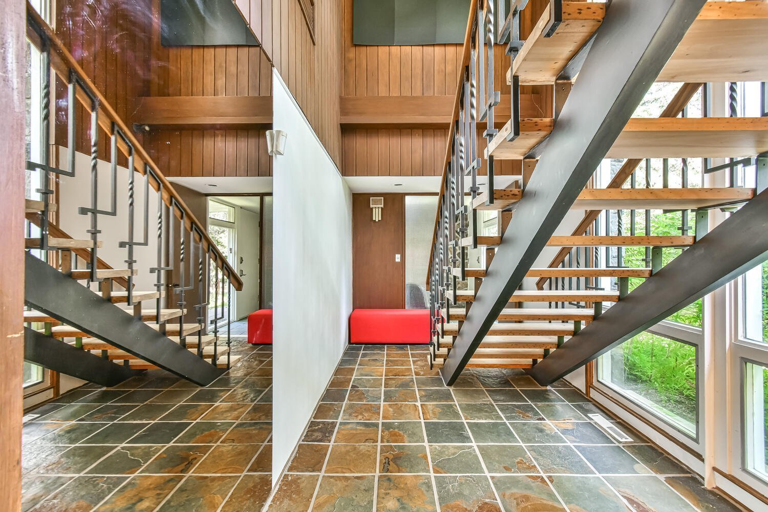 - Hall d'entrée monumental haut de 20 pi avec un escalier en acier, des rampes en fer forgé et une main courante en noyer, les murs sont aussi en noyer et le plancher en ardoise