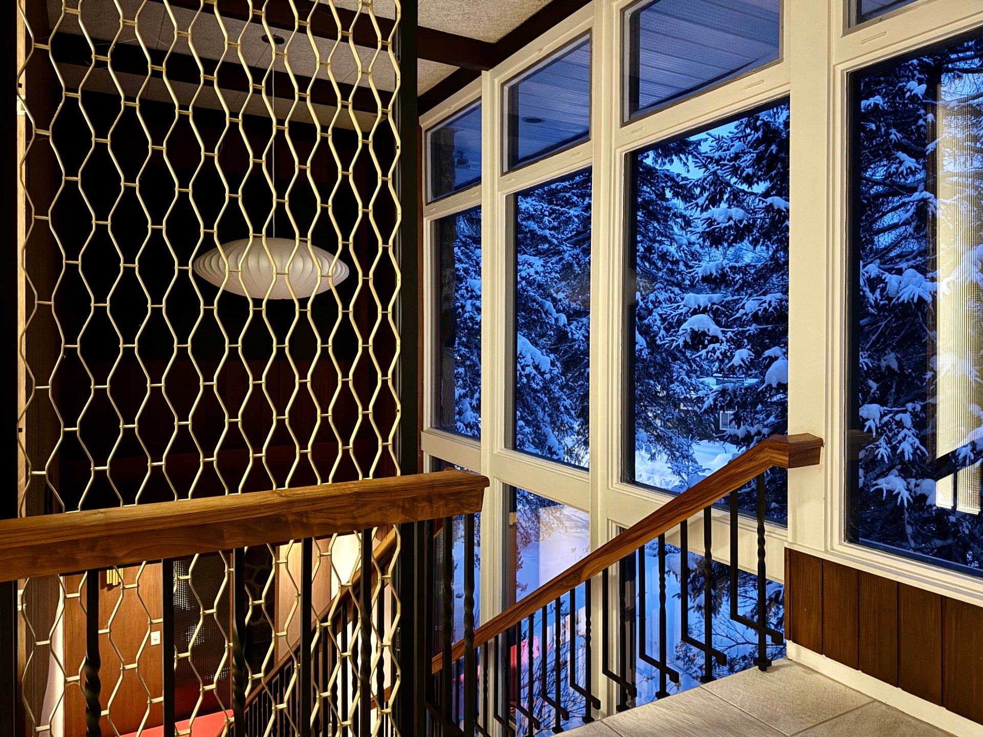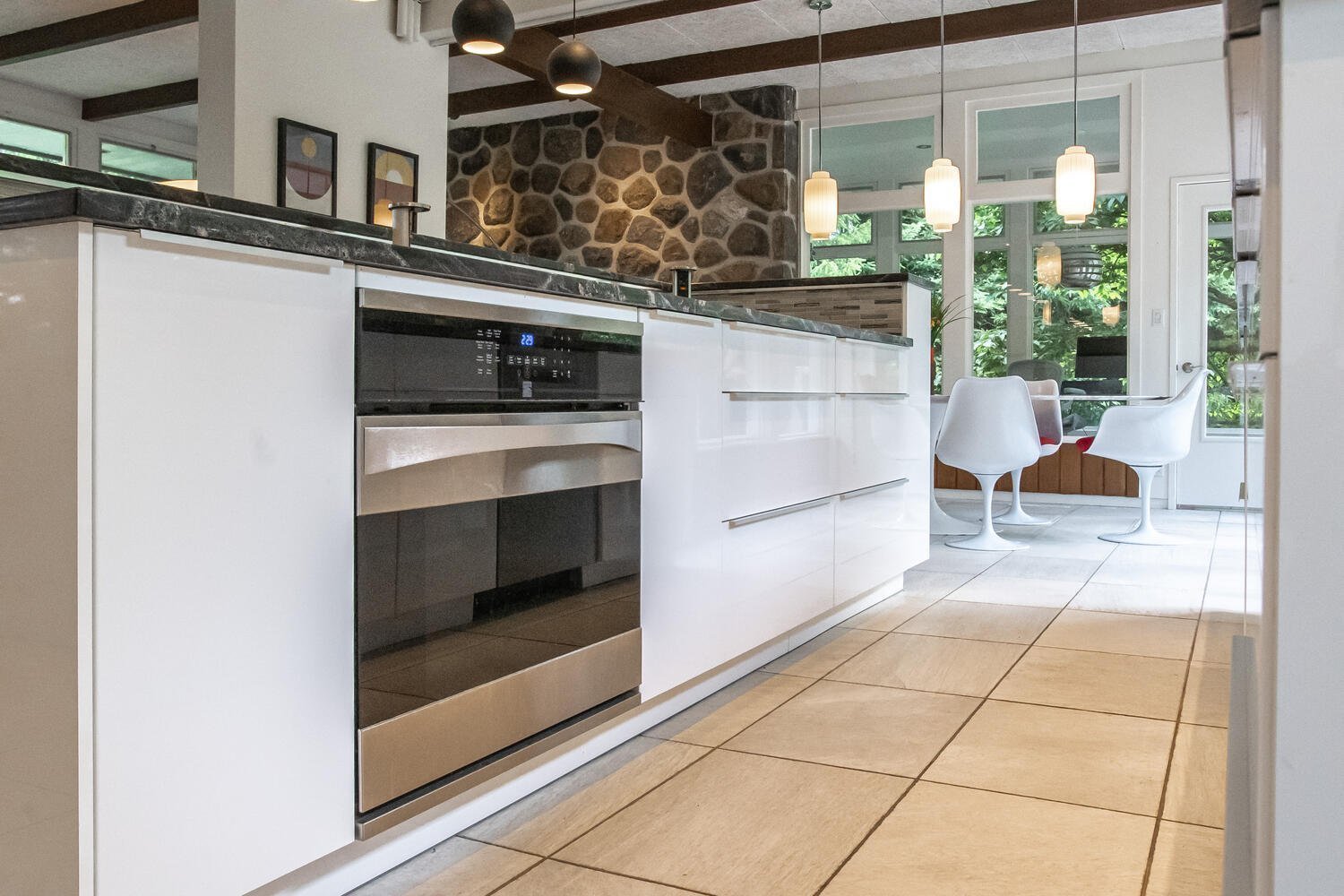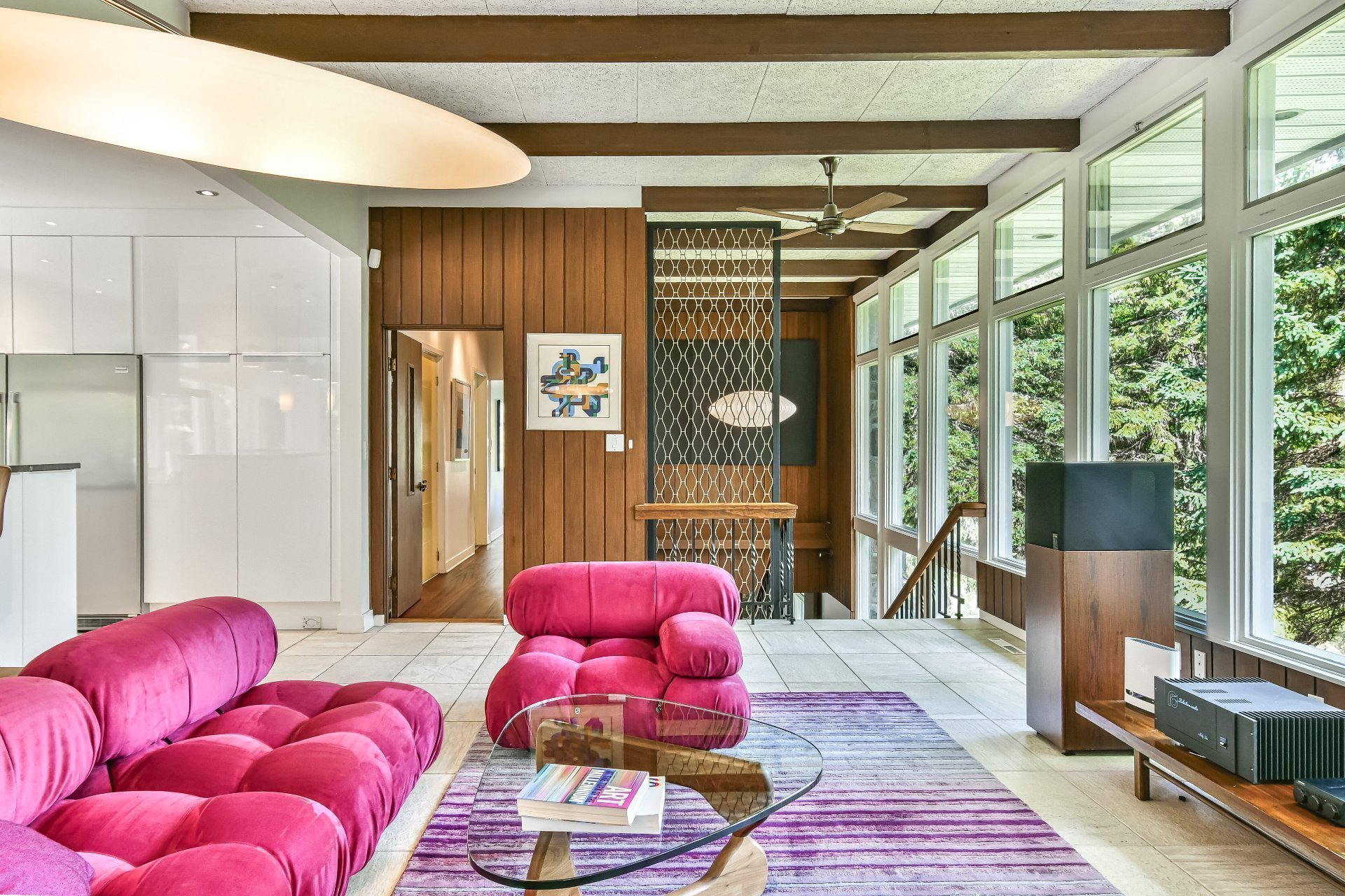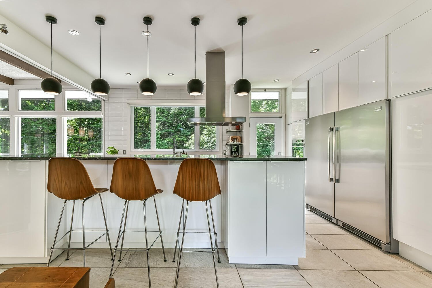 - Lustre "saucer bubble" de George Nelson dans l'entrée, 5 lustres TOPAN de Verner Panton au-dessus du comptoir de la cuisine; lustre en acier inox de Carl Thore dans le solarium