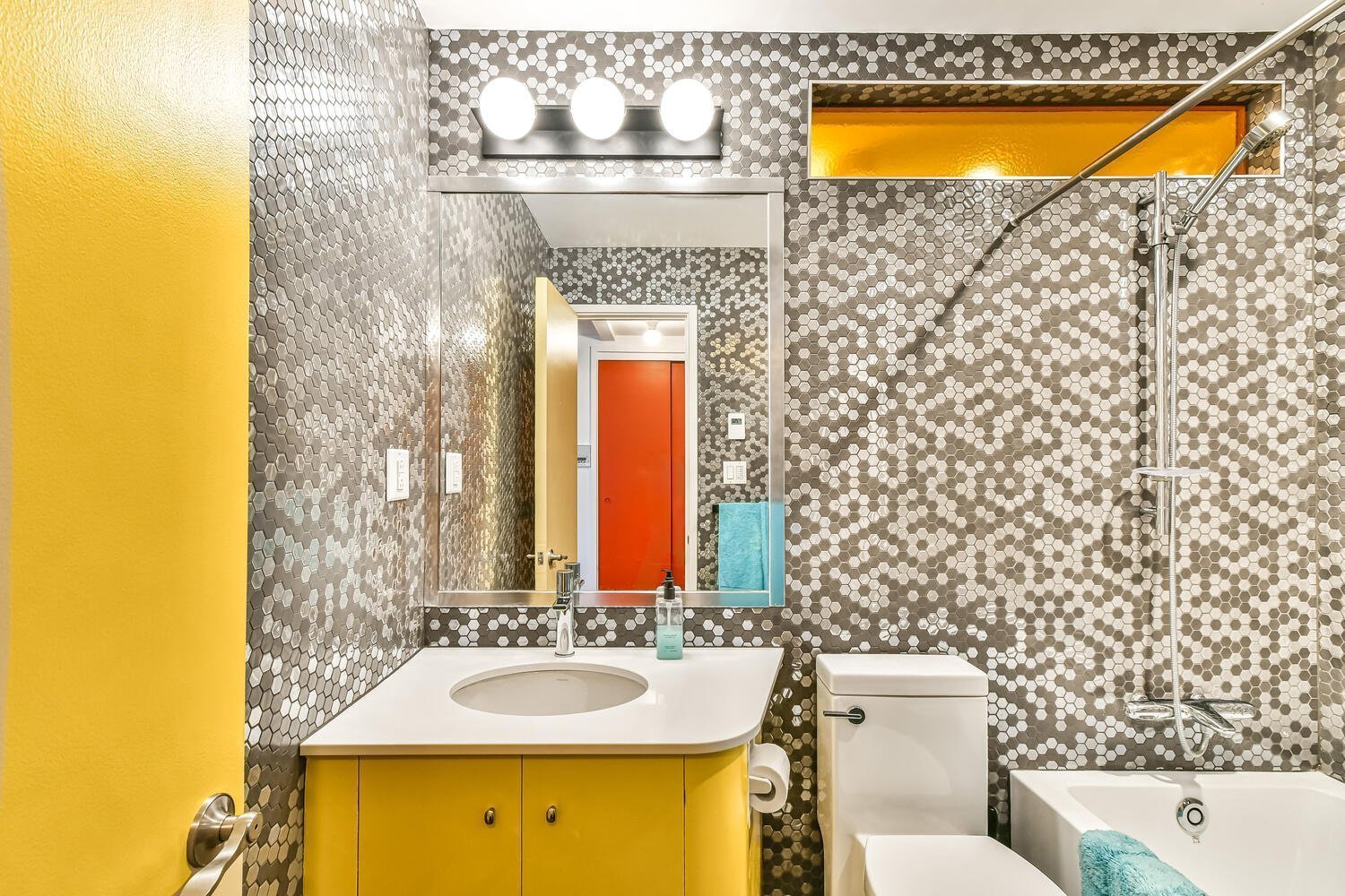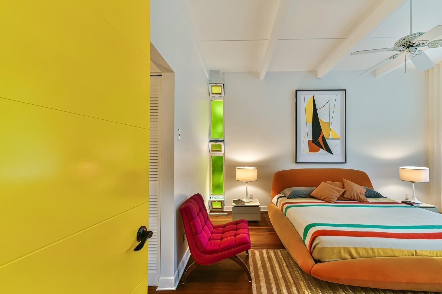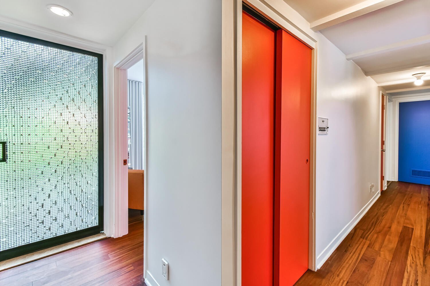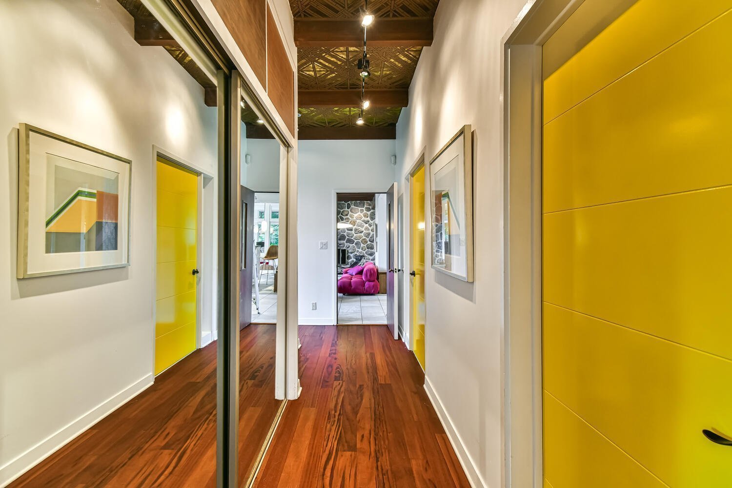 - Lustre "saucer bubble" de George Nelson dans l'entrée, 5 lustres TOPAN de Verner Panton au-dessus du comptoir de la cuisine; lustre en acier inox de Carl Thore dans le solarium