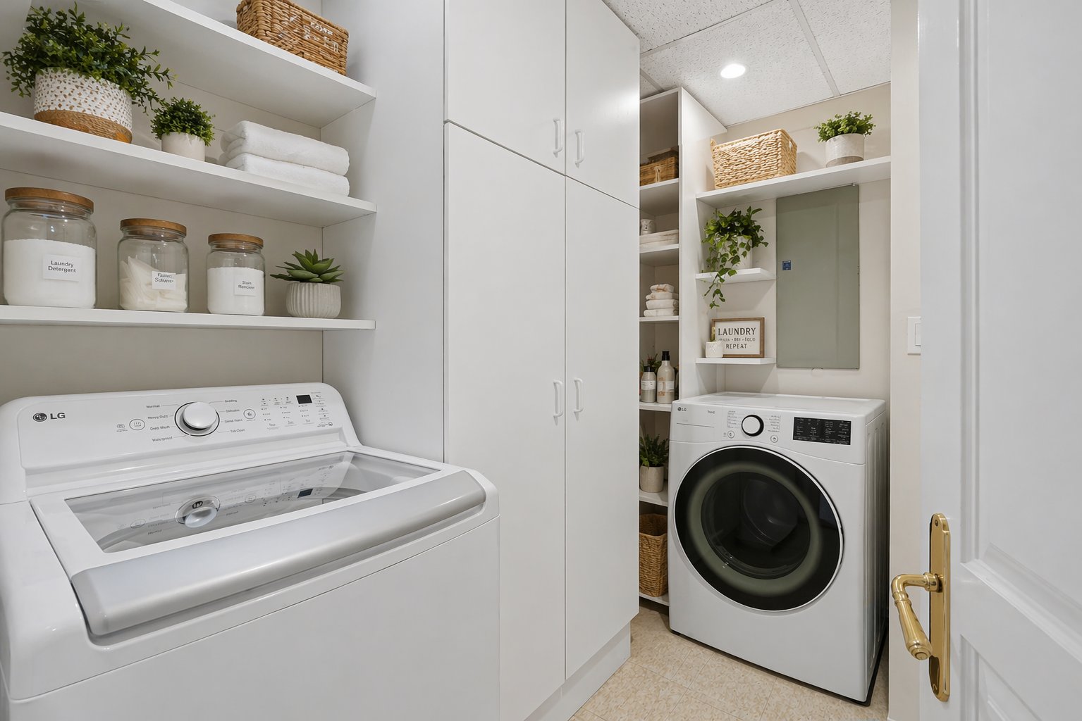 - Réfrigérateur, lave-vaisselle, lave-linge, sèche-linge, cuisinière (non fonctionnelle), compacteur à déchets (non fonctionnel), aspirateur central et accessoires, tous les habillages de fenêtres, tous les éléments encastrés là où ils étaient installés. Tous vendus tels quels.