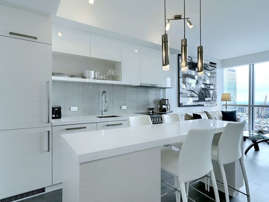 - Luminaires, rideaux, électroménagers (réfrigérateur, cuisinière, lave-vaisselle, hotte, laveuse, sécheuse), table, chaises, divan, lit.