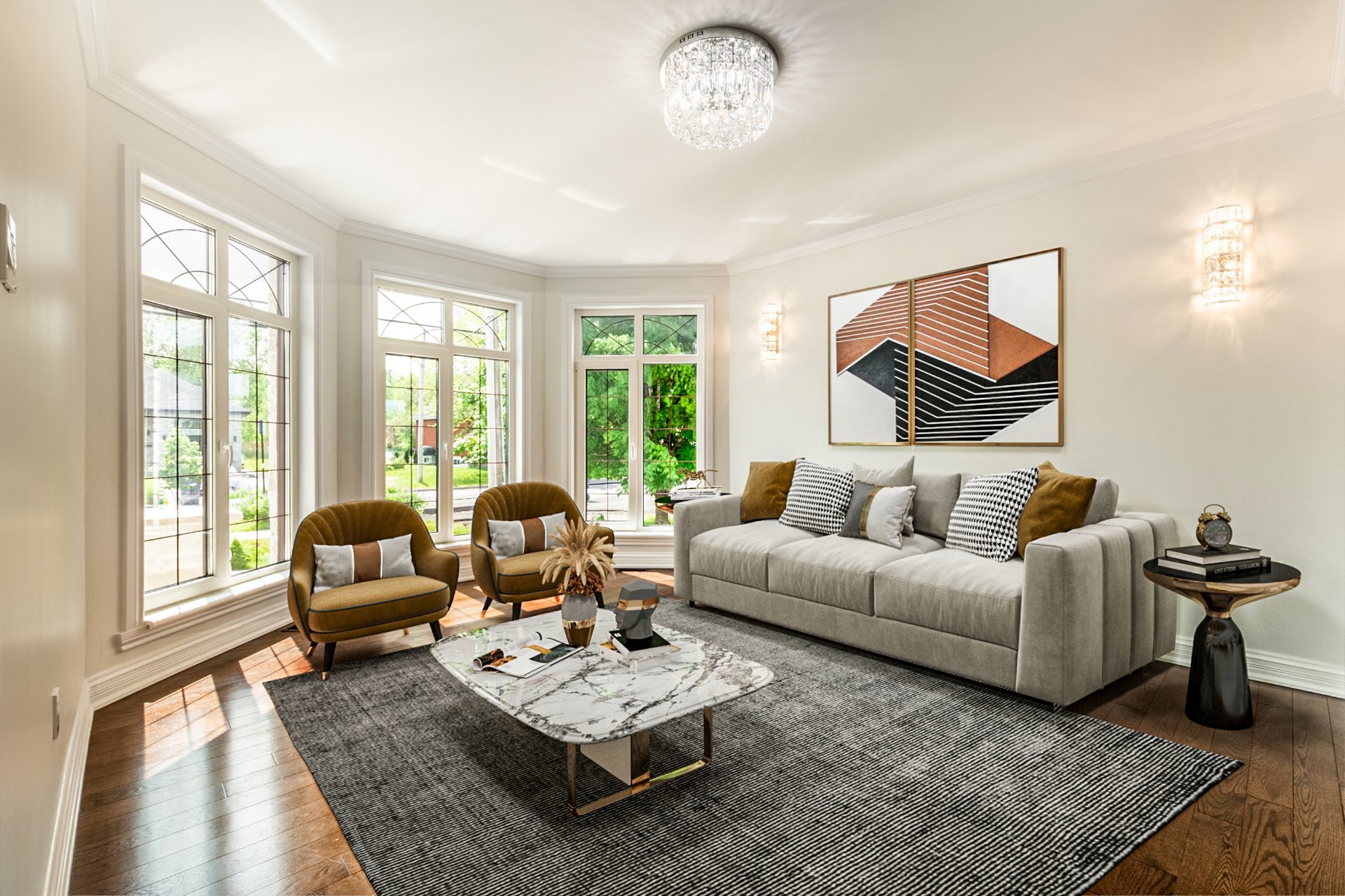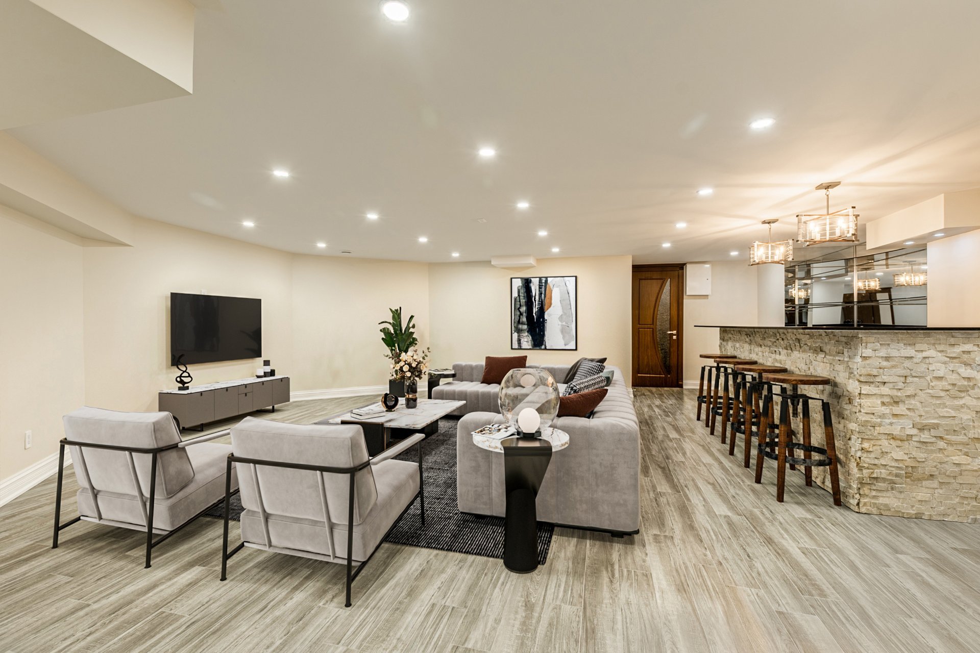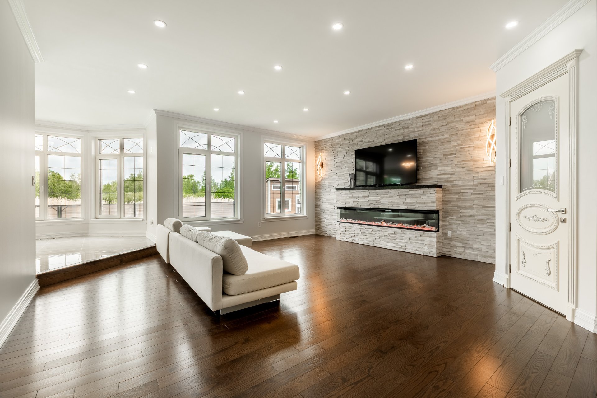 + Salon avec foyer électrique 3D de 100 po (3 faces)