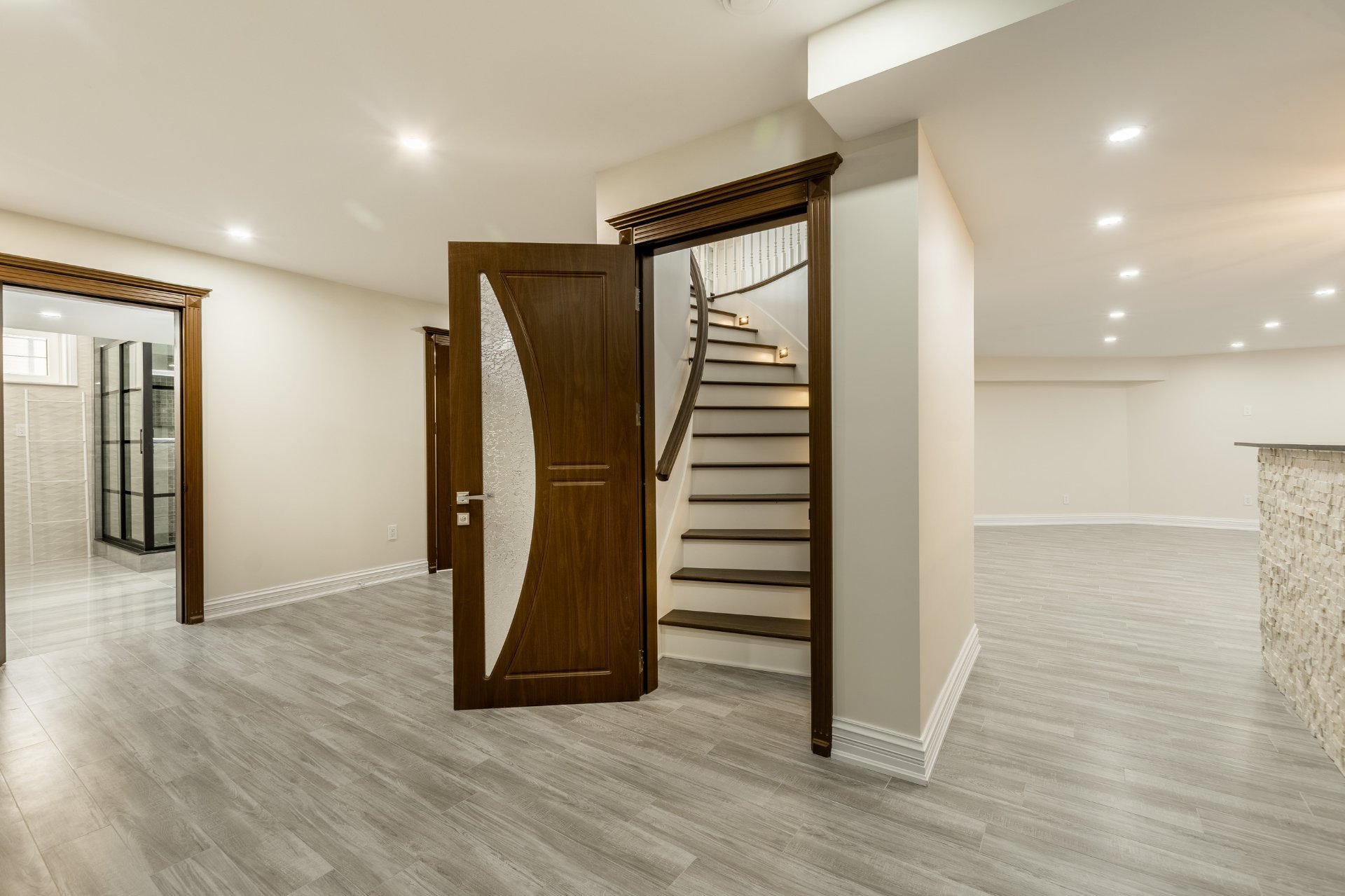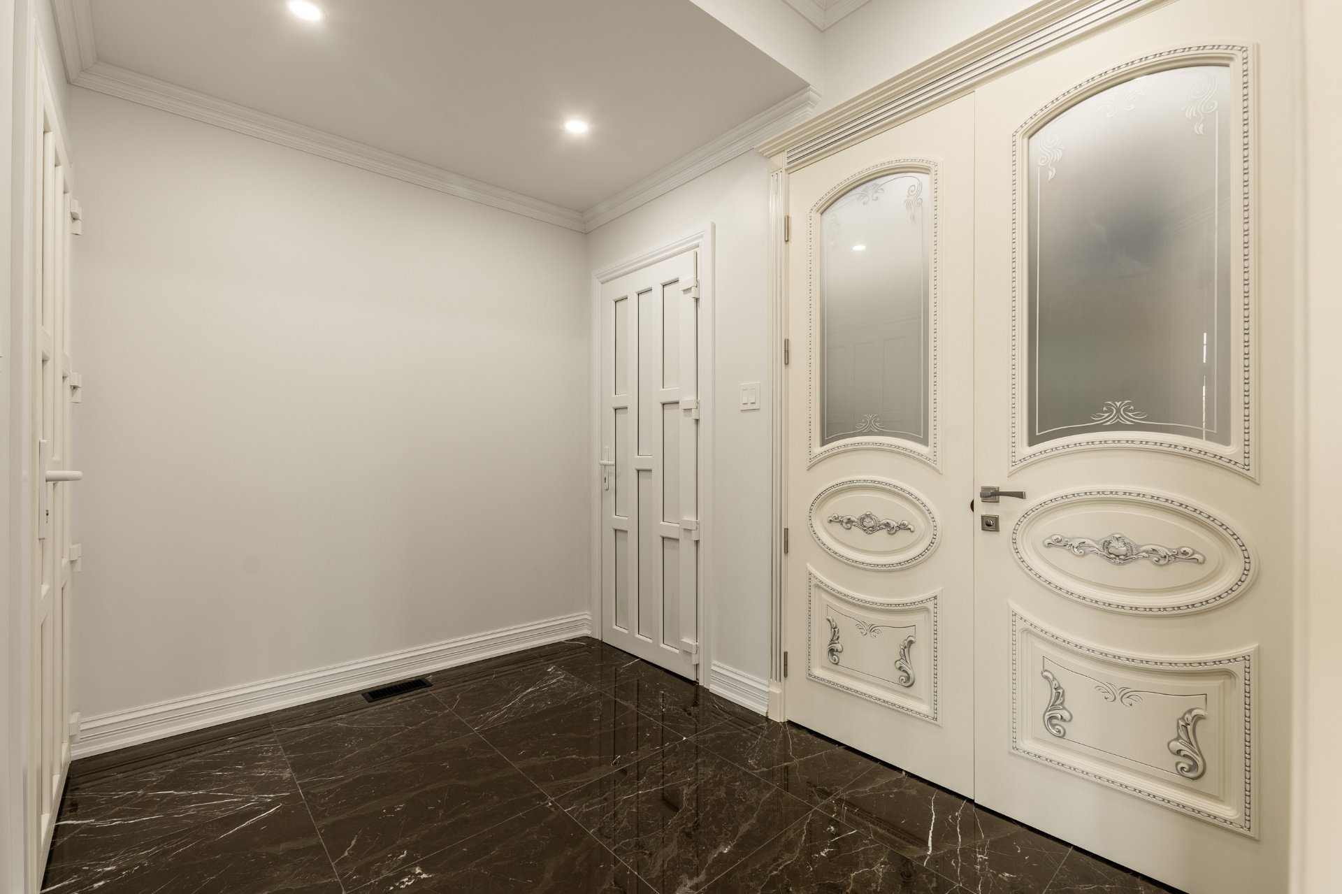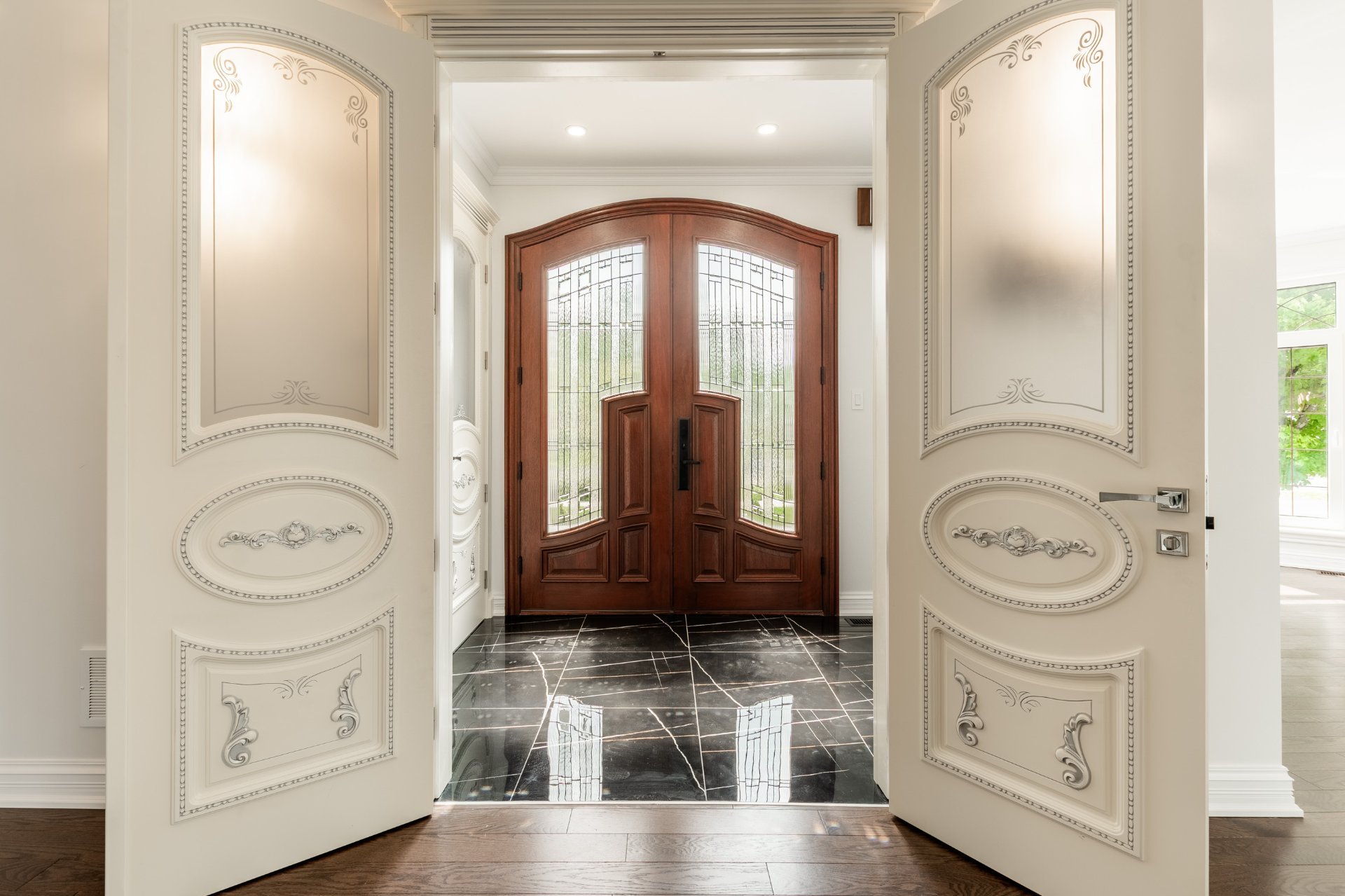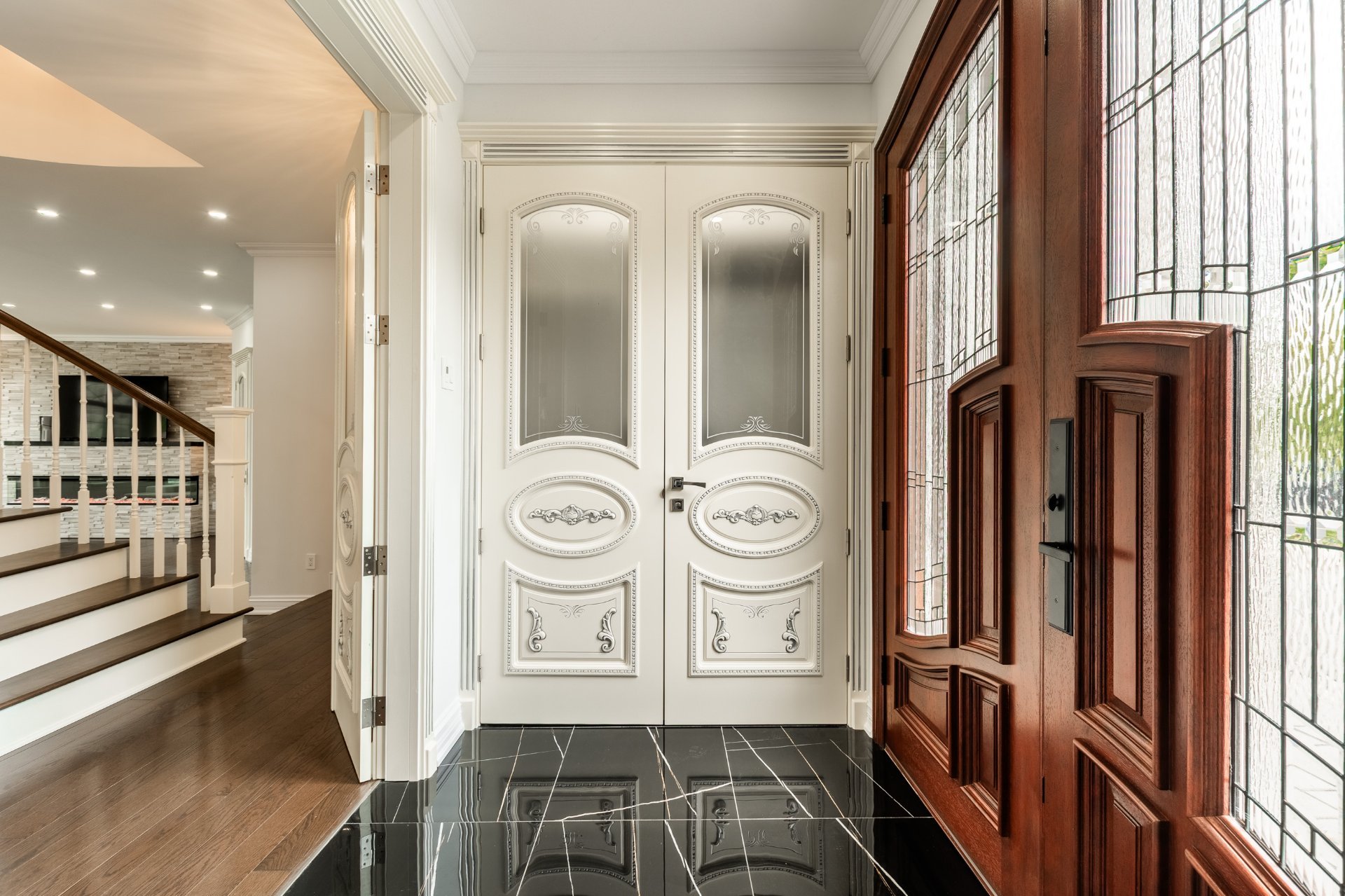 + Hall d'entrée avec plancher chauffant et portes en acajou sur mesure