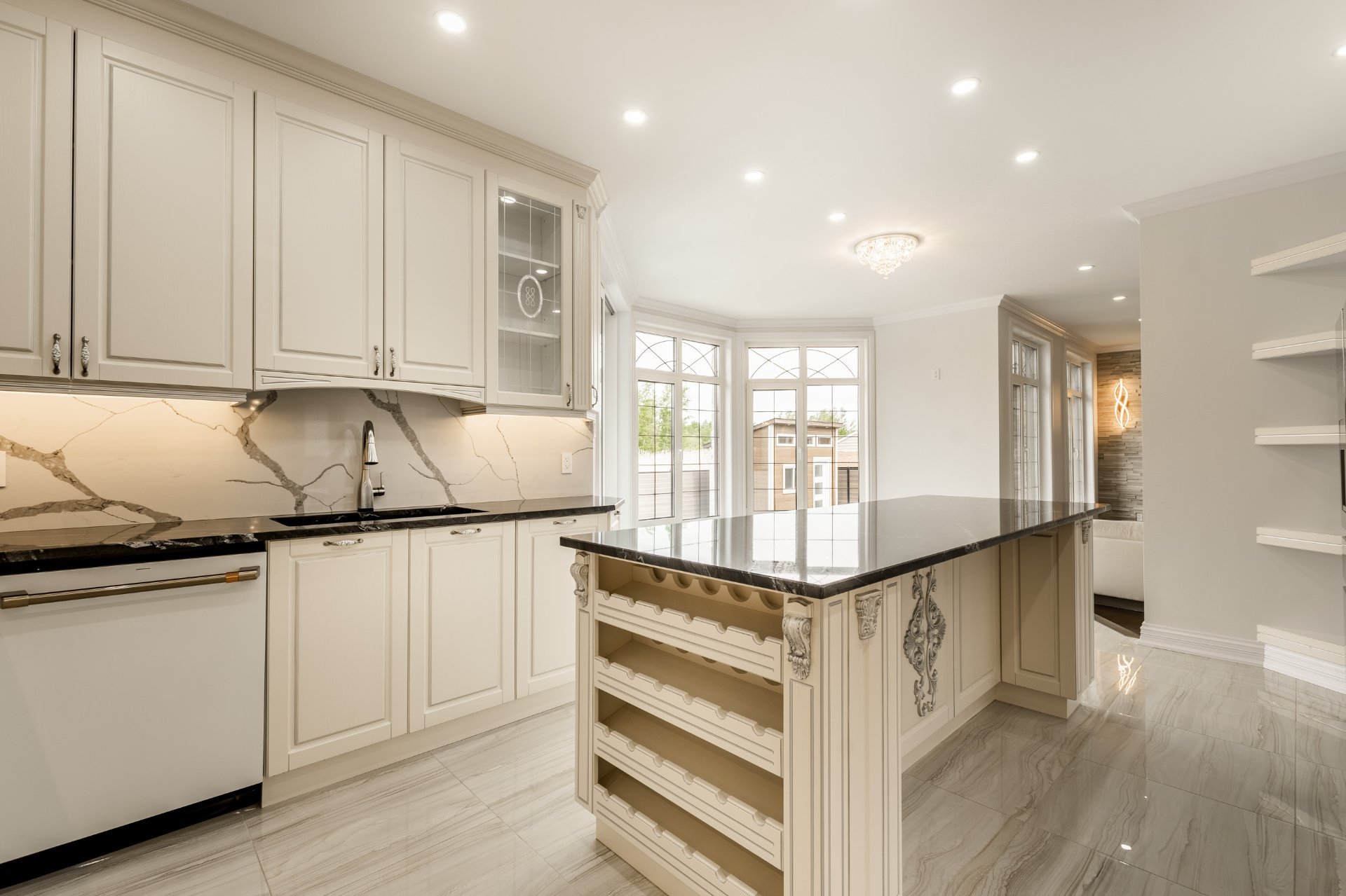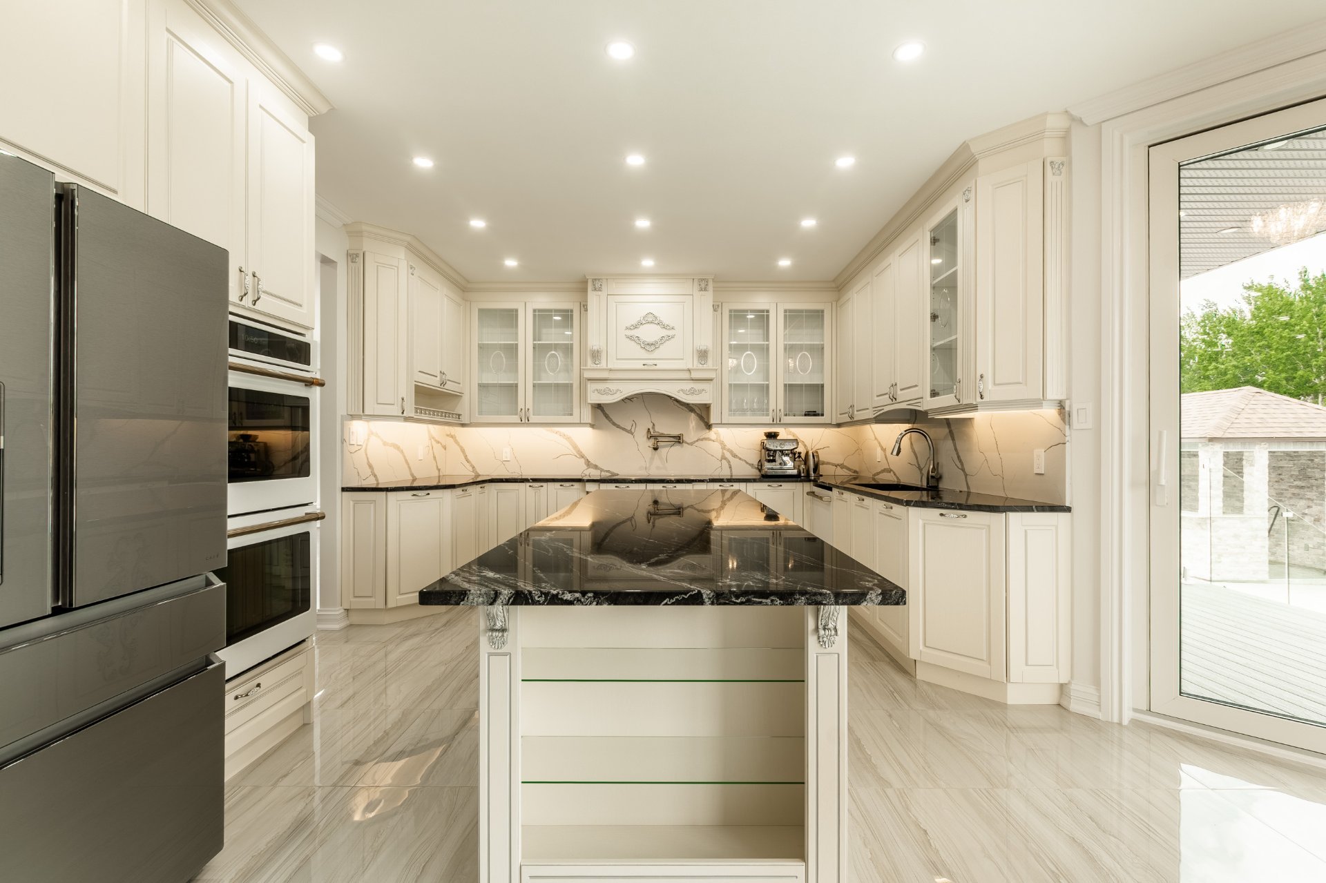 + Cuisine haut de gamme : Comptoirs et dosserets en granite, Électros Café Collection, poêle à induction Frigidaire Gallery, Robinet intelligent, incinérateur intégré, éclairage sous armoires et plus encore