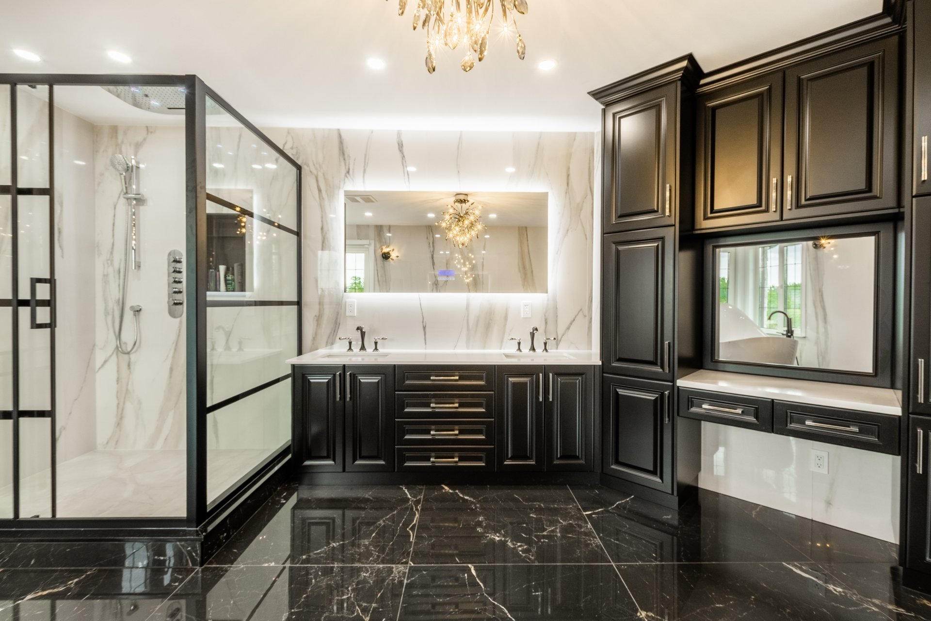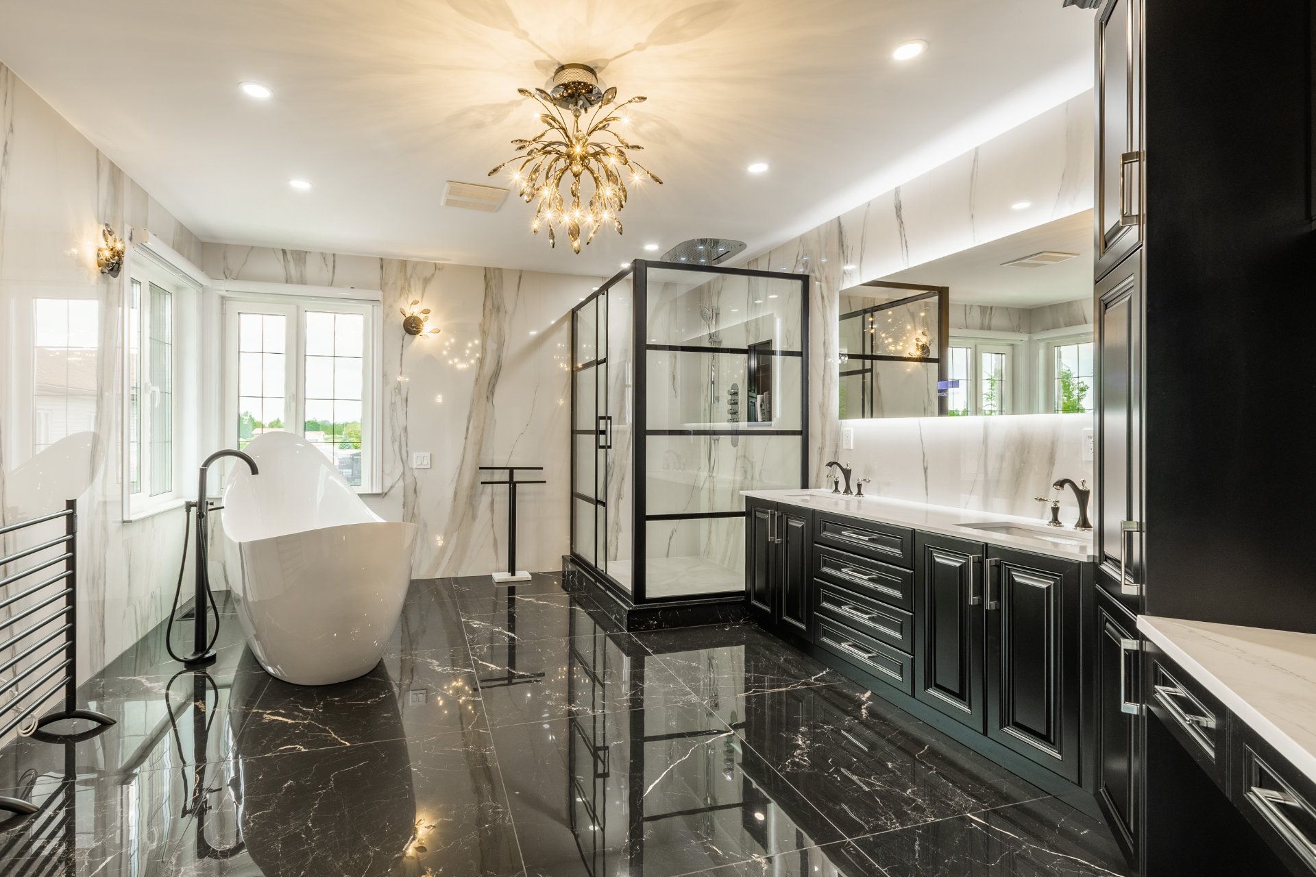 + Salle de bain des maîtres luxueuse : douche vapeur Aquabrass, baignoire Fleurco, murs en céramique pleine hauteur, vanité granite, toilette intelligente, et plus encore
