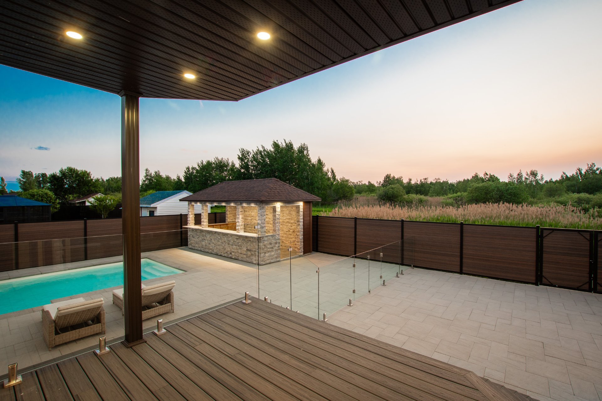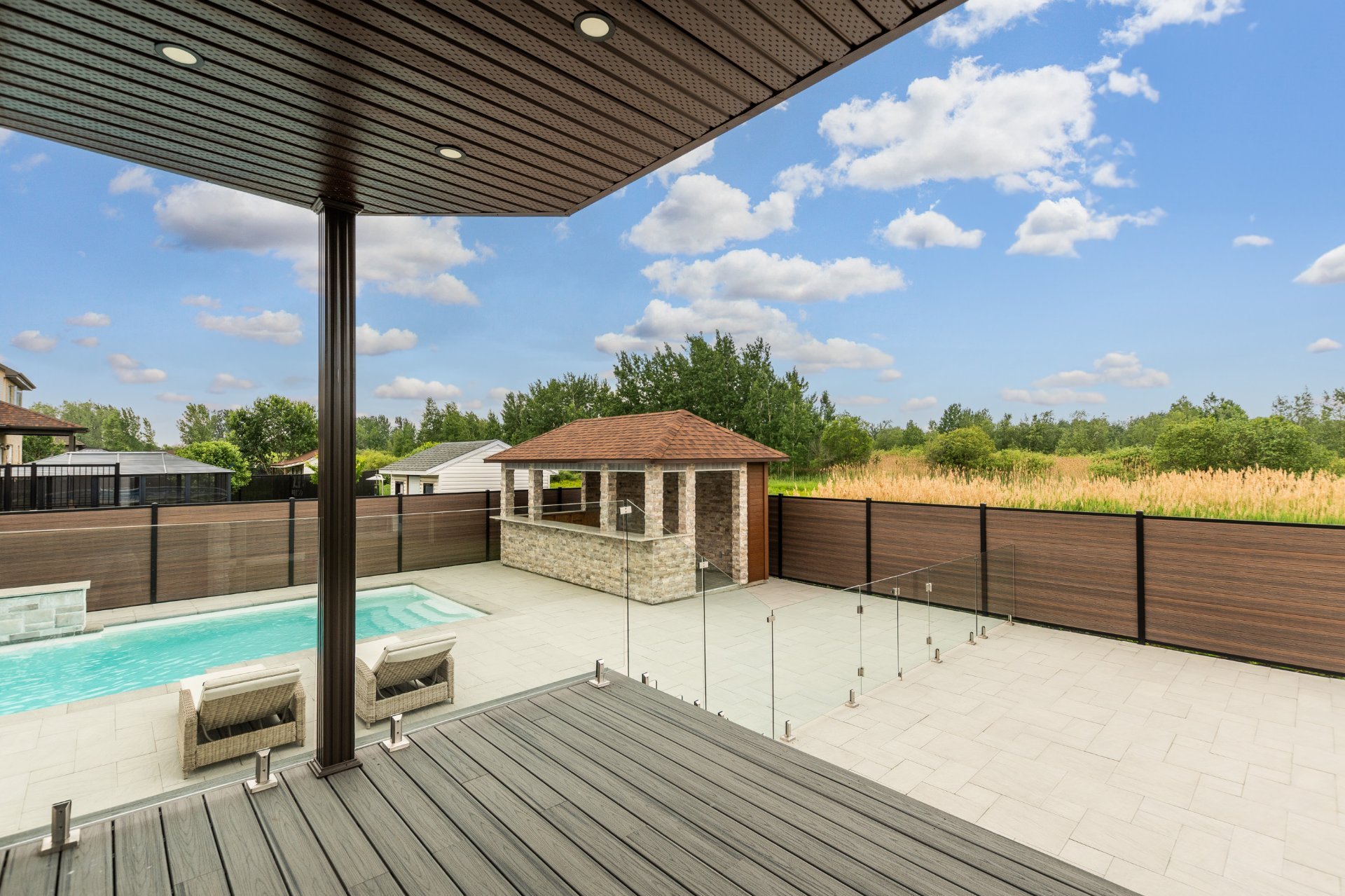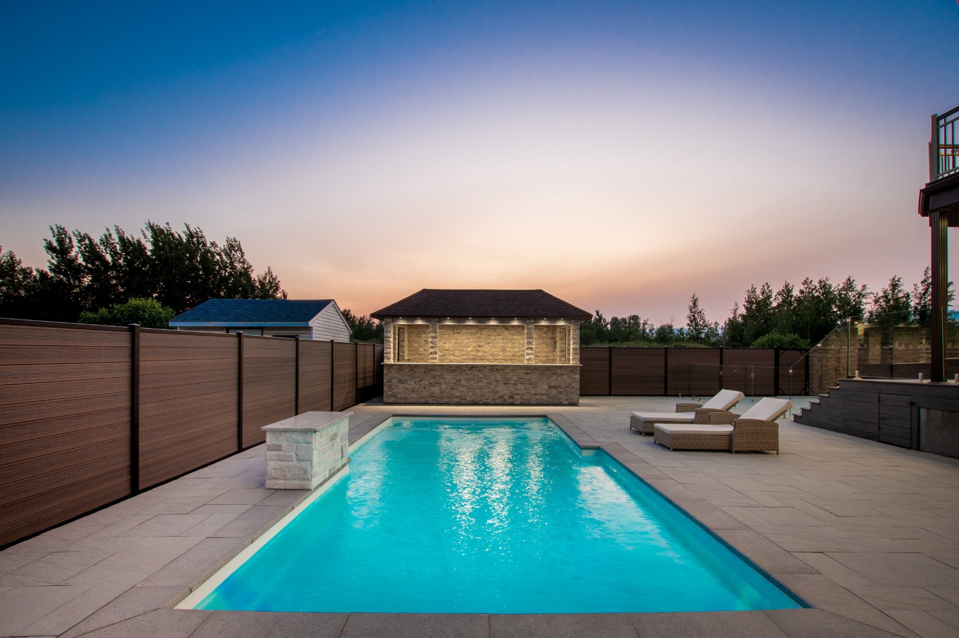 + Bar extérieur sur dalle de béton : Murs en pierre et CanExel, comptoirs en granite, plomberie et électricité complète