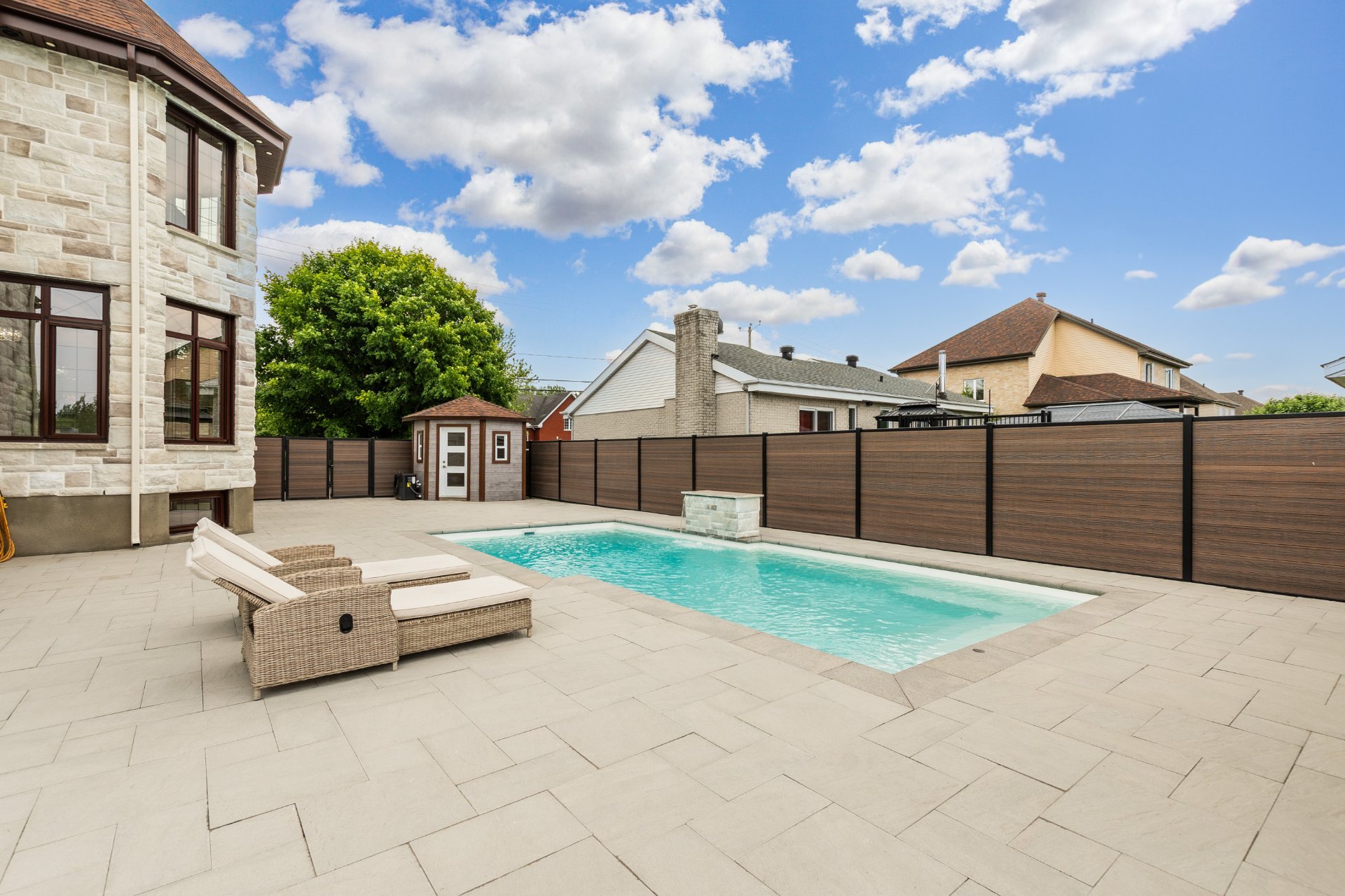 + Piscine creusée en fibre de verre (chauffée, au sel, fontaine en pierre)