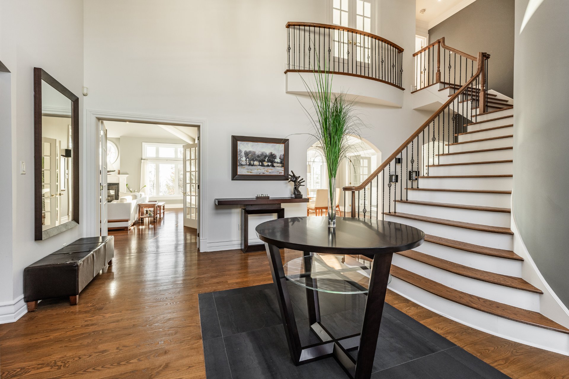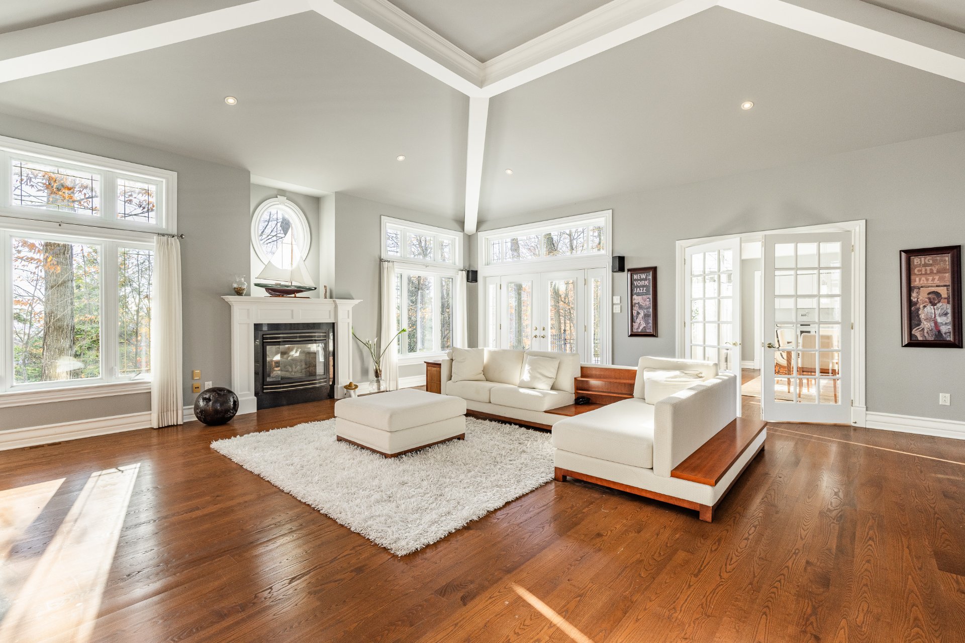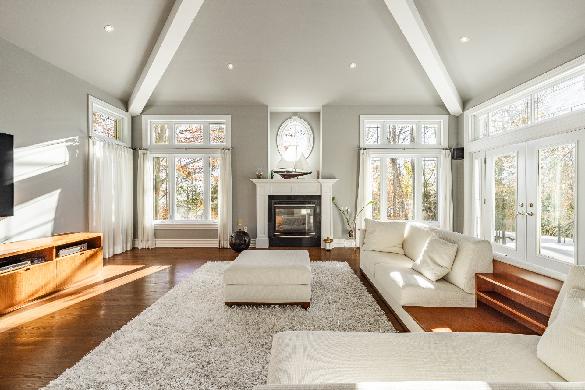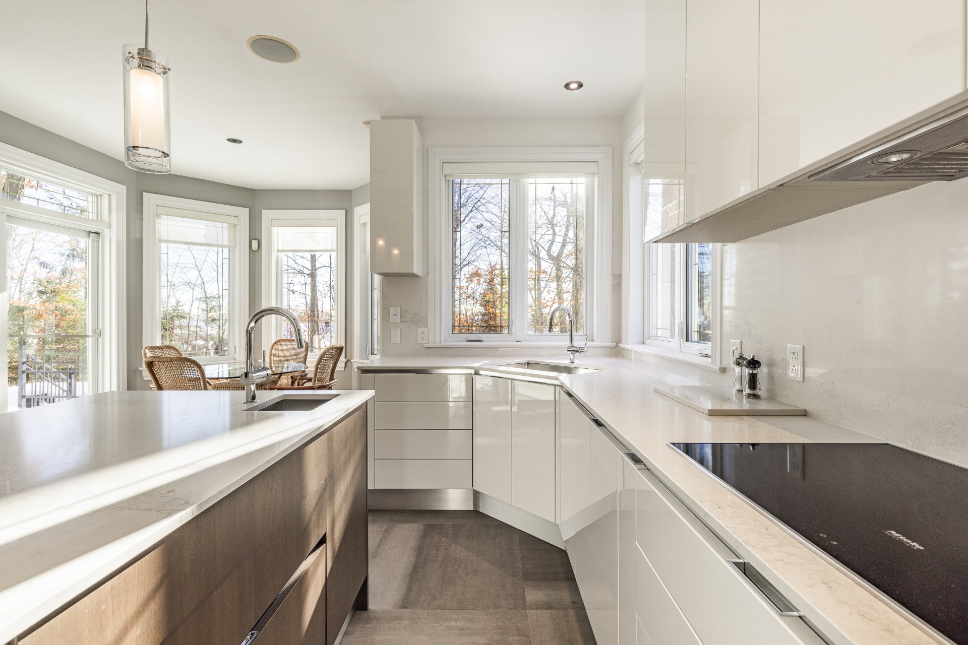 - Au Rez-de-chaussée : une impressionnante entrée ouverte à double hauteur met en valeur un élégant escalier central en bois. Le spacieux salon, doté d'un plafond style "cathédrale", dispose d'une abondante fenestration sur trois côtés et d'un foyer offrant une ambiance chaleureuse. La salle à manger, entourée de fenêtres en arche et offrant une vue sur la nature arrière, communique directement avec la cuisine. La grande cuisine, lumineuse et fonctionnelle, a été entièrement rénovée et comprend de nombreux rangements et un coin repas en baie vitrée. On y retrouve également deux chambres, une salle de bain, une salle d'eau ainsi qu'une buanderie idéalement située.