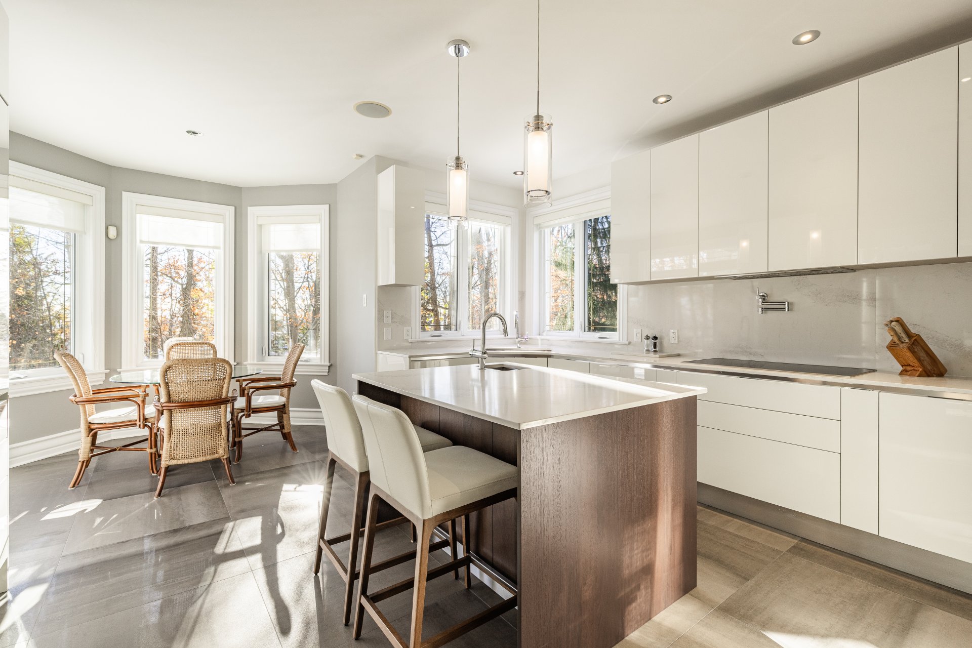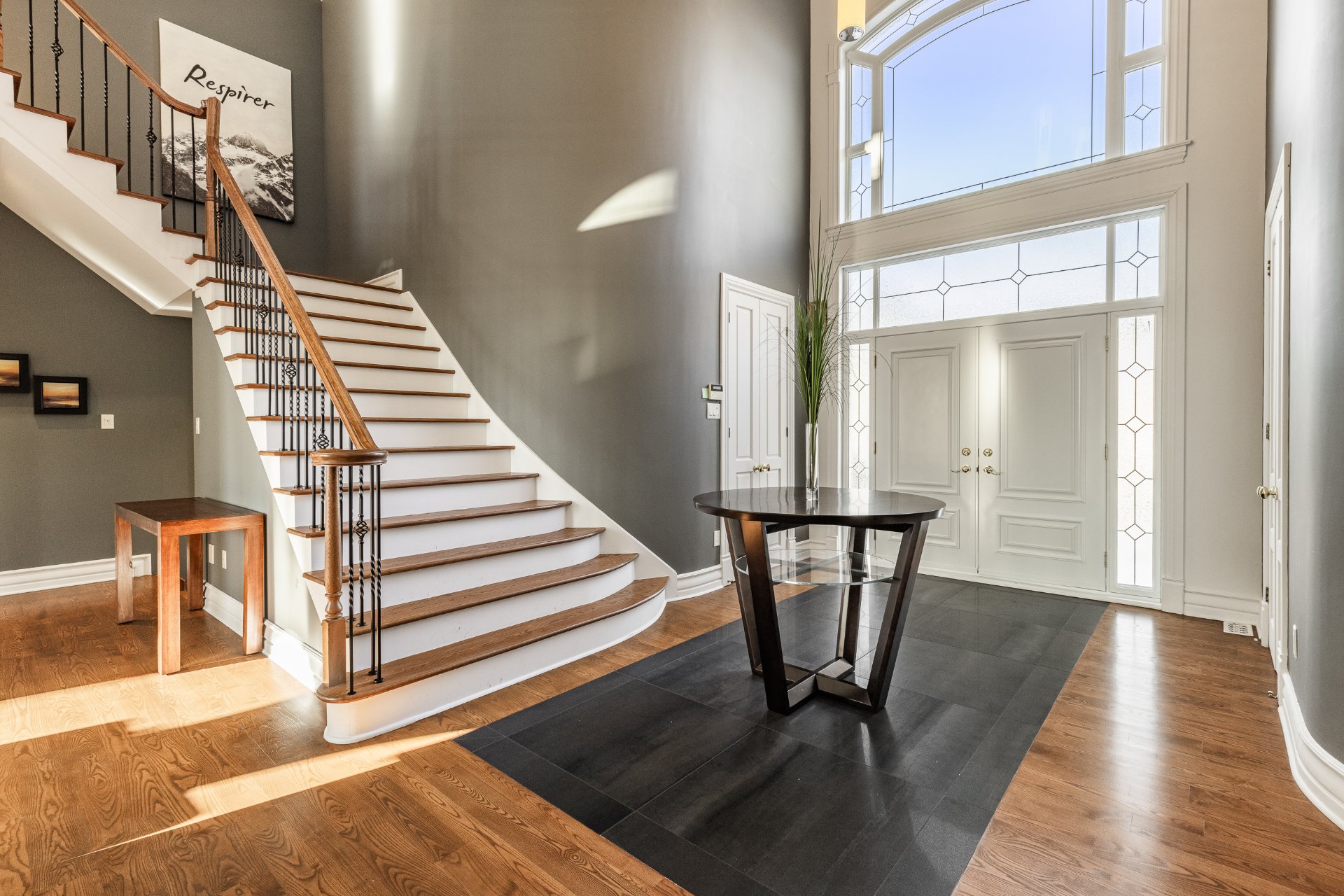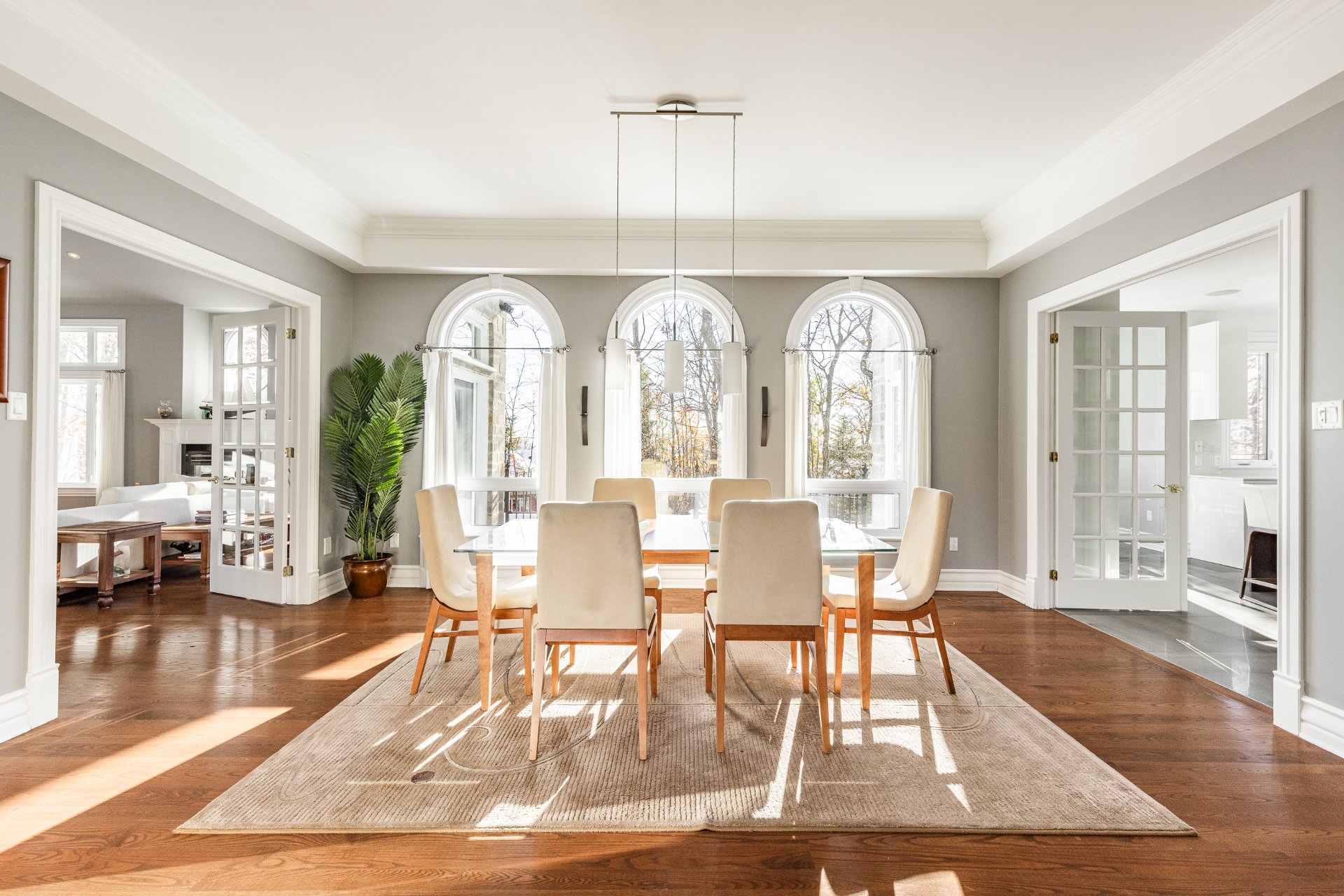 - Au Rez-de-chaussée : une impressionnante entrée ouverte à double hauteur met en valeur un élégant escalier central en bois. Le spacieux salon, doté d'un plafond style "cathédrale", dispose d'une abondante fenestration sur trois côtés et d'un foyer offrant une ambiance chaleureuse. La salle à manger, entourée de fenêtres en arche et offrant une vue sur la nature arrière, communique directement avec la cuisine. La grande cuisine, lumineuse et fonctionnelle, a été entièrement rénovée et comprend de nombreux rangements et un coin repas en baie vitrée. On y retrouve également deux chambres, une salle de bain, une salle d'eau ainsi qu'une buanderie idéalement située.