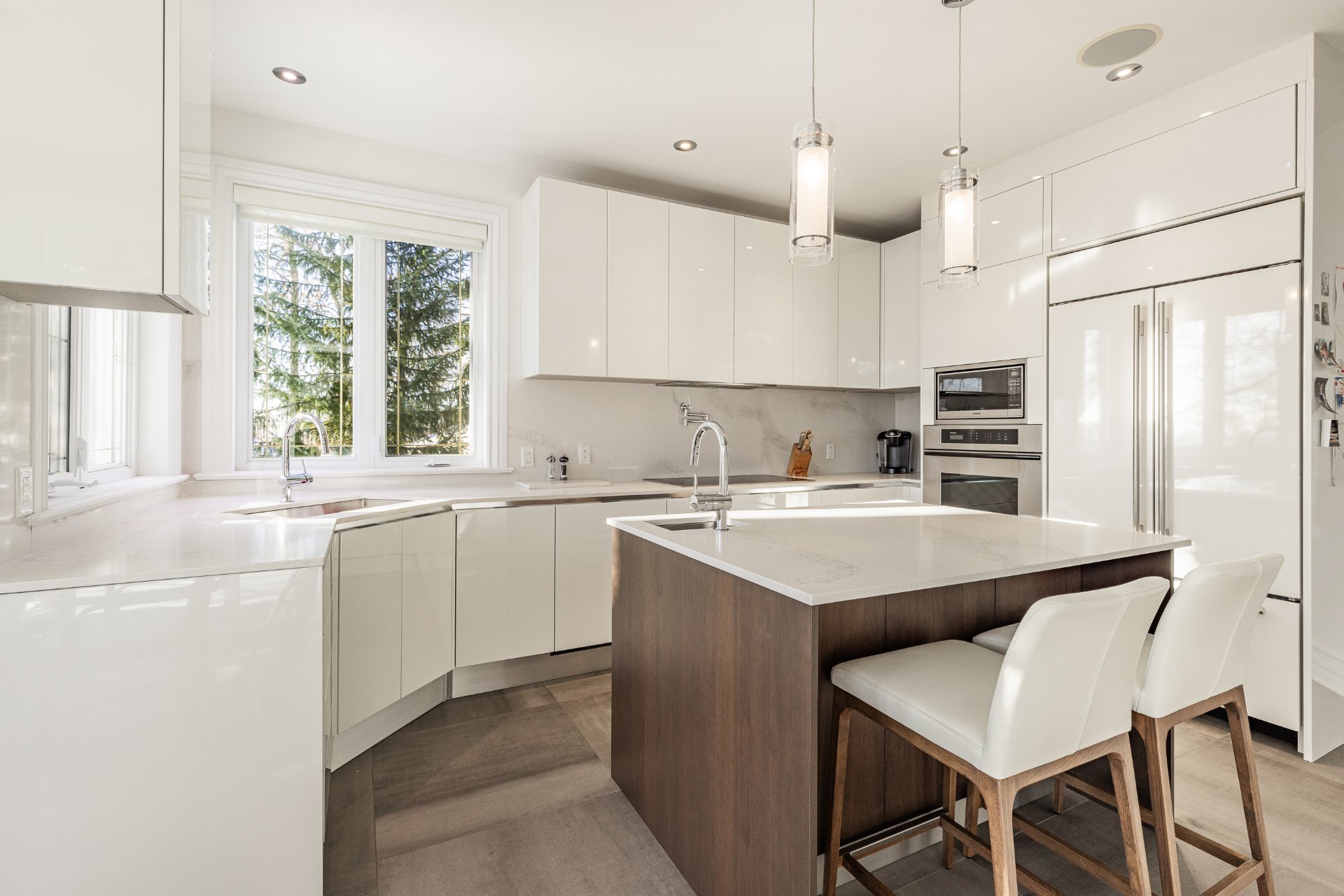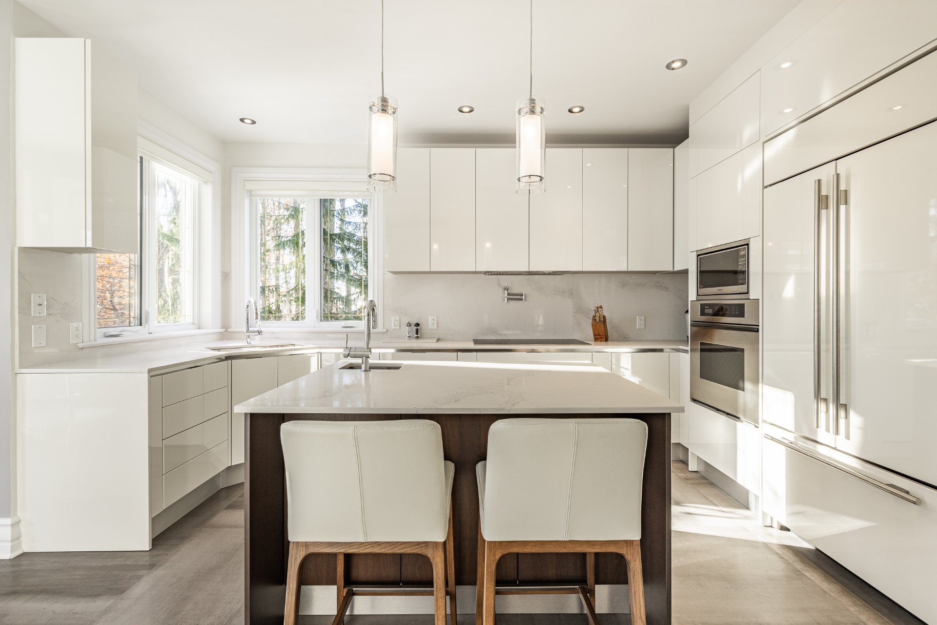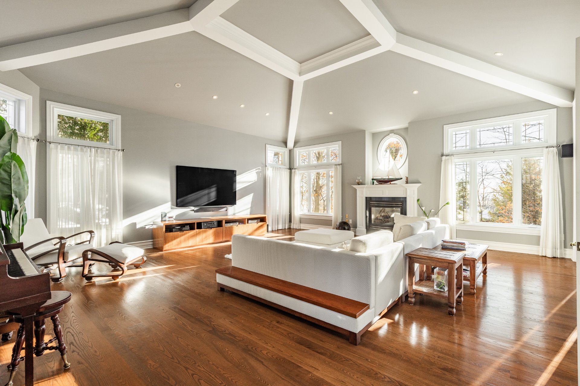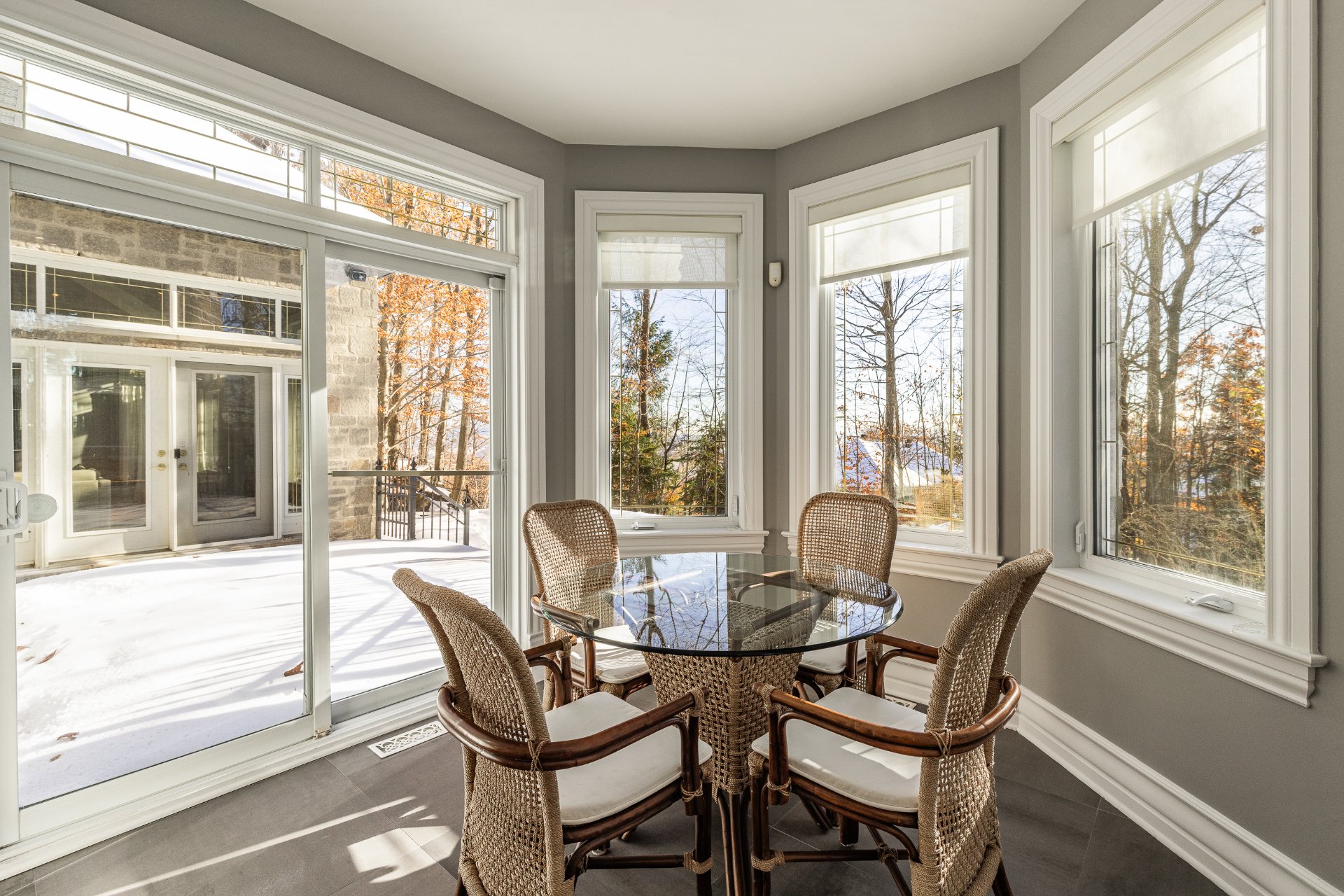 - Au Rez-de-chaussée : une impressionnante entrée ouverte à double hauteur met en valeur un élégant escalier central en bois. Le spacieux salon, doté d'un plafond style "cathédrale", dispose d'une abondante fenestration sur trois côtés et d'un foyer offrant une ambiance chaleureuse. La salle à manger, entourée de fenêtres en arche et offrant une vue sur la nature arrière, communique directement avec la cuisine. La grande cuisine, lumineuse et fonctionnelle, a été entièrement rénovée et comprend de nombreux rangements et un coin repas en baie vitrée. On y retrouve également deux chambres, une salle de bain, une salle d'eau ainsi qu'une buanderie idéalement située.