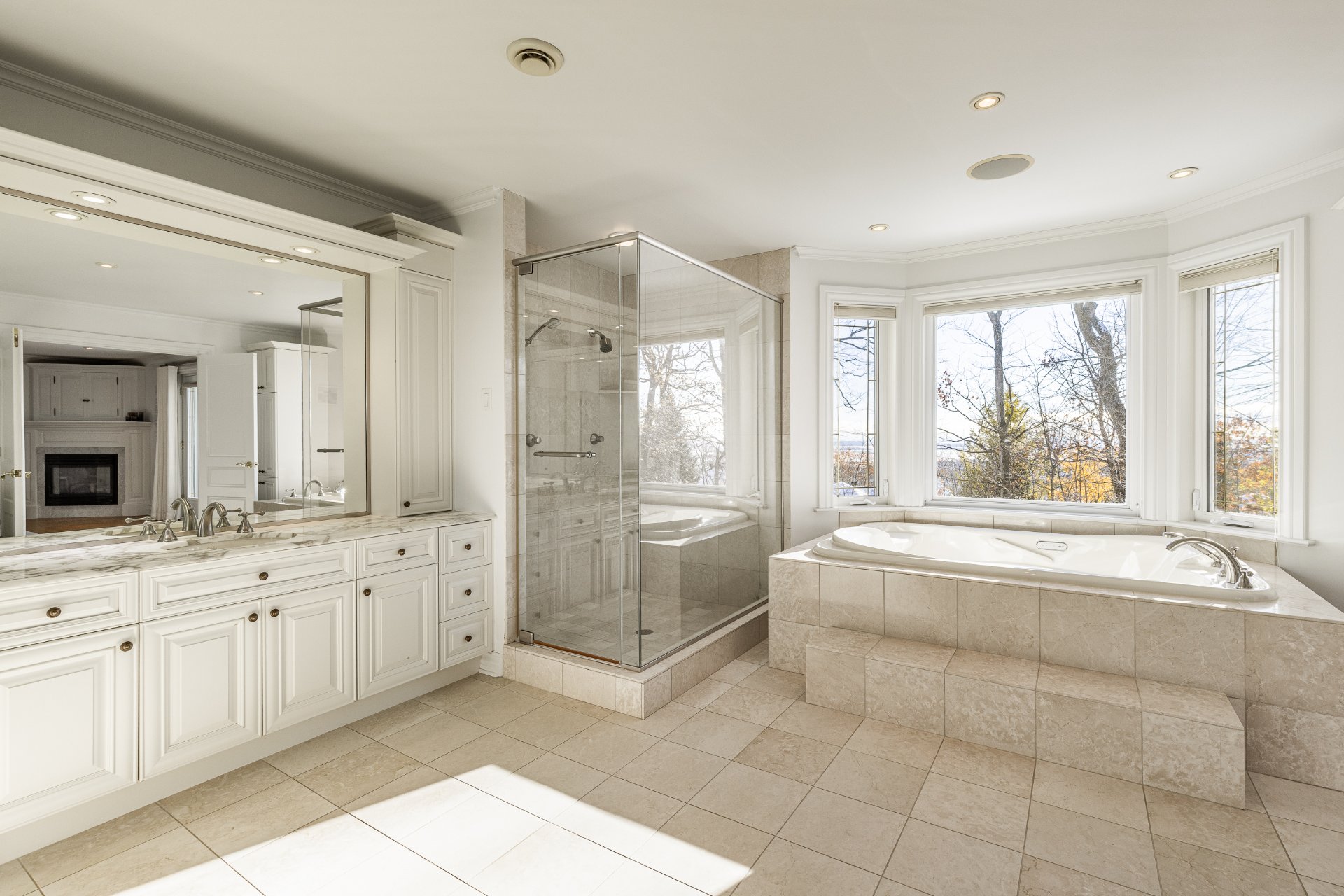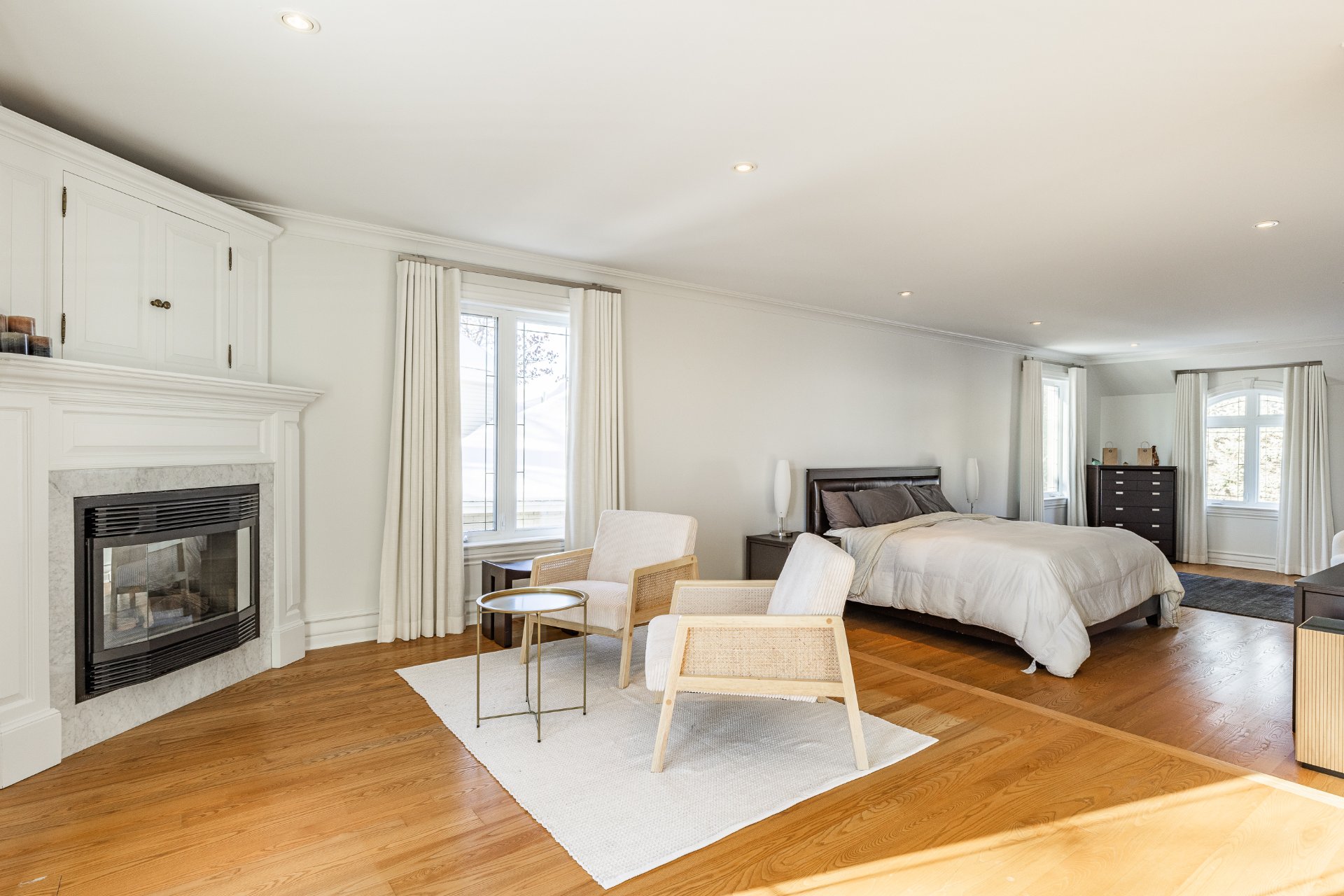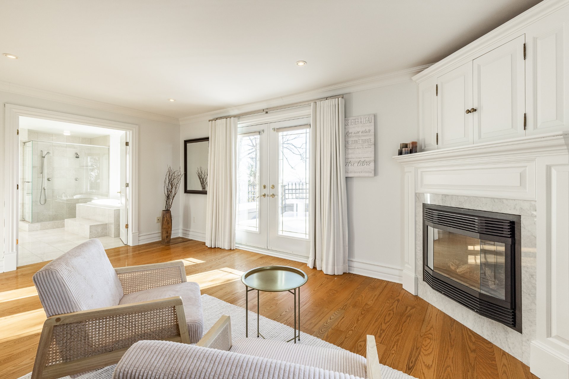- Au 2e étage, la suite principale offre une superficie impressionnante. Elle comprend une chambre principale spacieuse et un grand boudoir avec un foyer. On y retrouve aussi un immense walk-in sur mesure avec des rangements intégrés. La salle de bain attenante est somptueuse, avec une grande douche vitrée, une baignoire encastrée, des planchers chauffants, de nombreuses armoires et un vaste comptoir double.