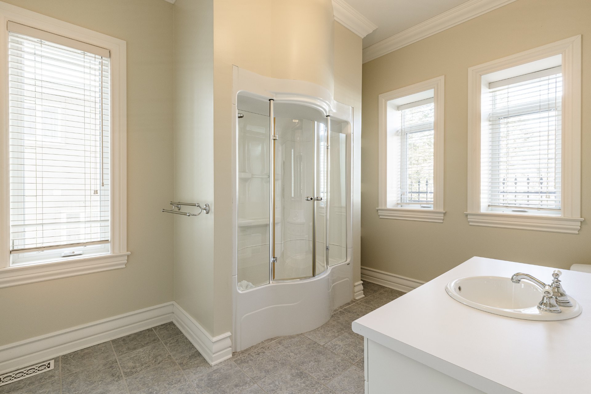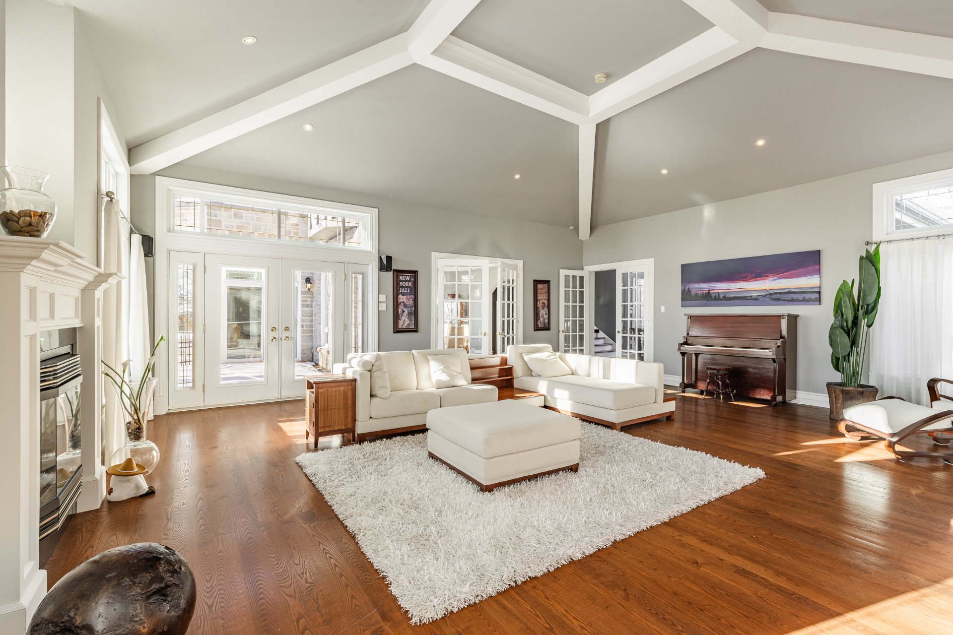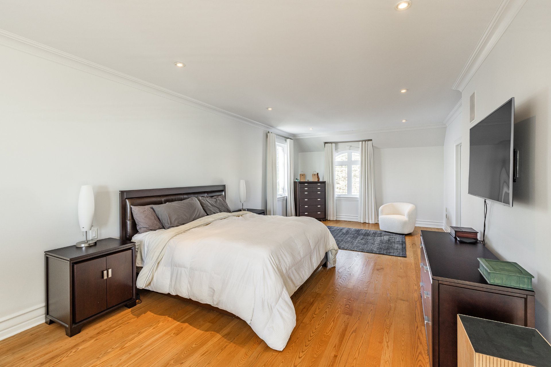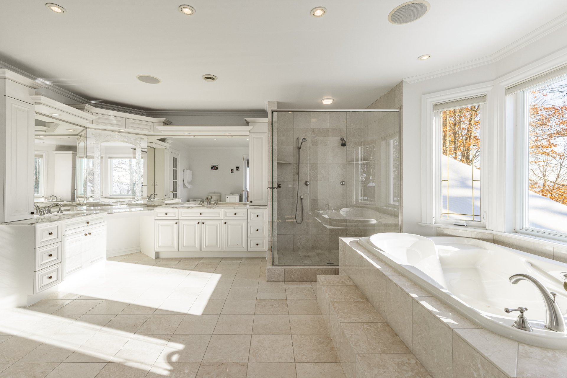 - Au 2e étage, la suite principale offre une superficie impressionnante. Elle comprend une chambre principale spacieuse et un grand boudoir avec un foyer. On y retrouve aussi un immense walk-in sur mesure avec des rangements intégrés. La salle de bain attenante est somptueuse, avec une grande douche vitrée, une baignoire encastrée, des planchers chauffants, de nombreuses armoires et un vaste comptoir double.