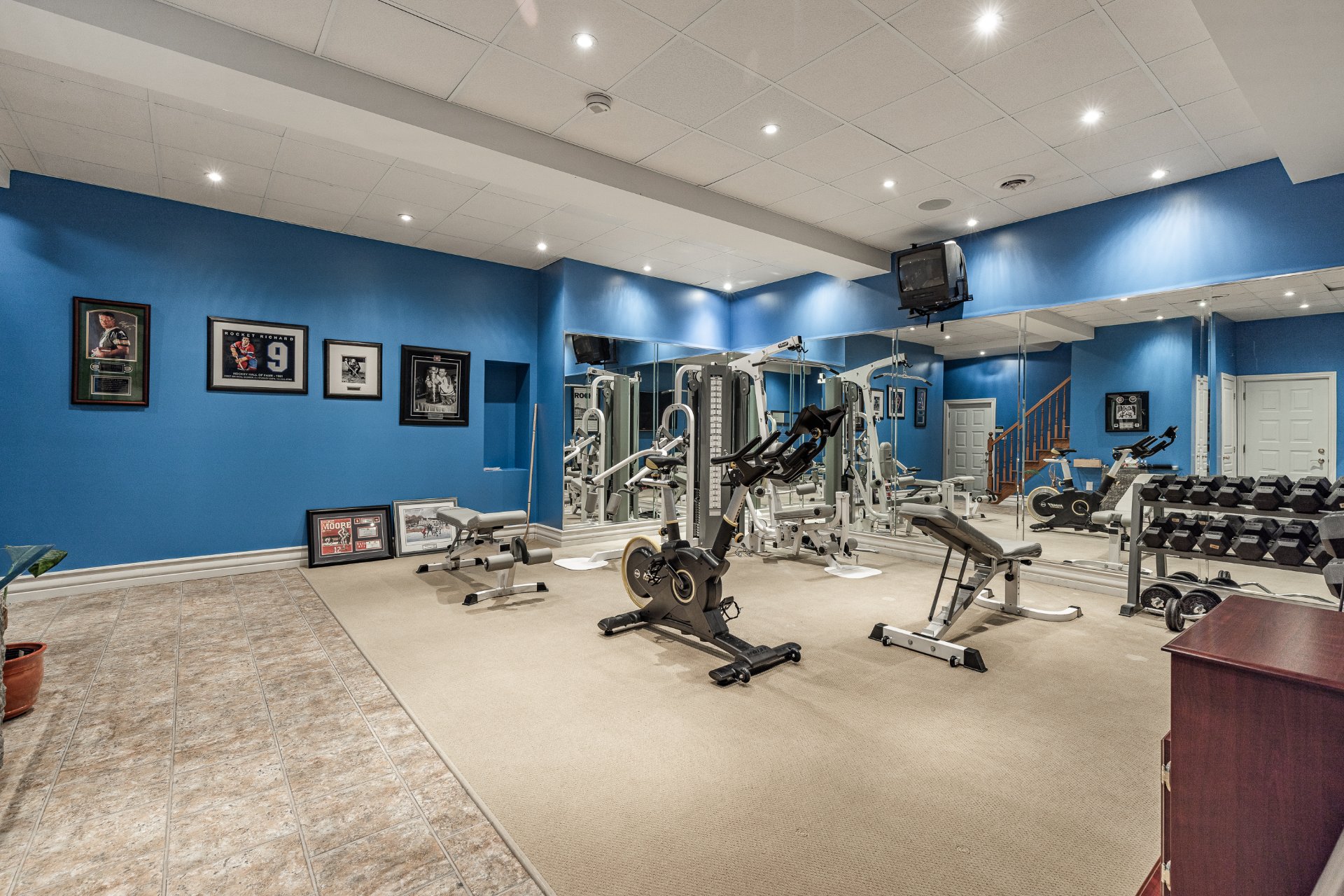 - Au sous-sol, le niveau est entièrement aménagé et offre plusieurs pièces polyvalentes. On y retrouve une grande salle de sport, qui peut aussi servir de salle familiale ou de salle de jeux. Il y a également un salon additionnel et deux chambres supplémentaires. Une salle de bain complète, un atelier, une salle mécanique et un espace de rangement s'ajoutent à l'ensemble. Le garage double est intégré, dispose de rangements et offre un accès direct via le sous-sol et à l'extérieur.