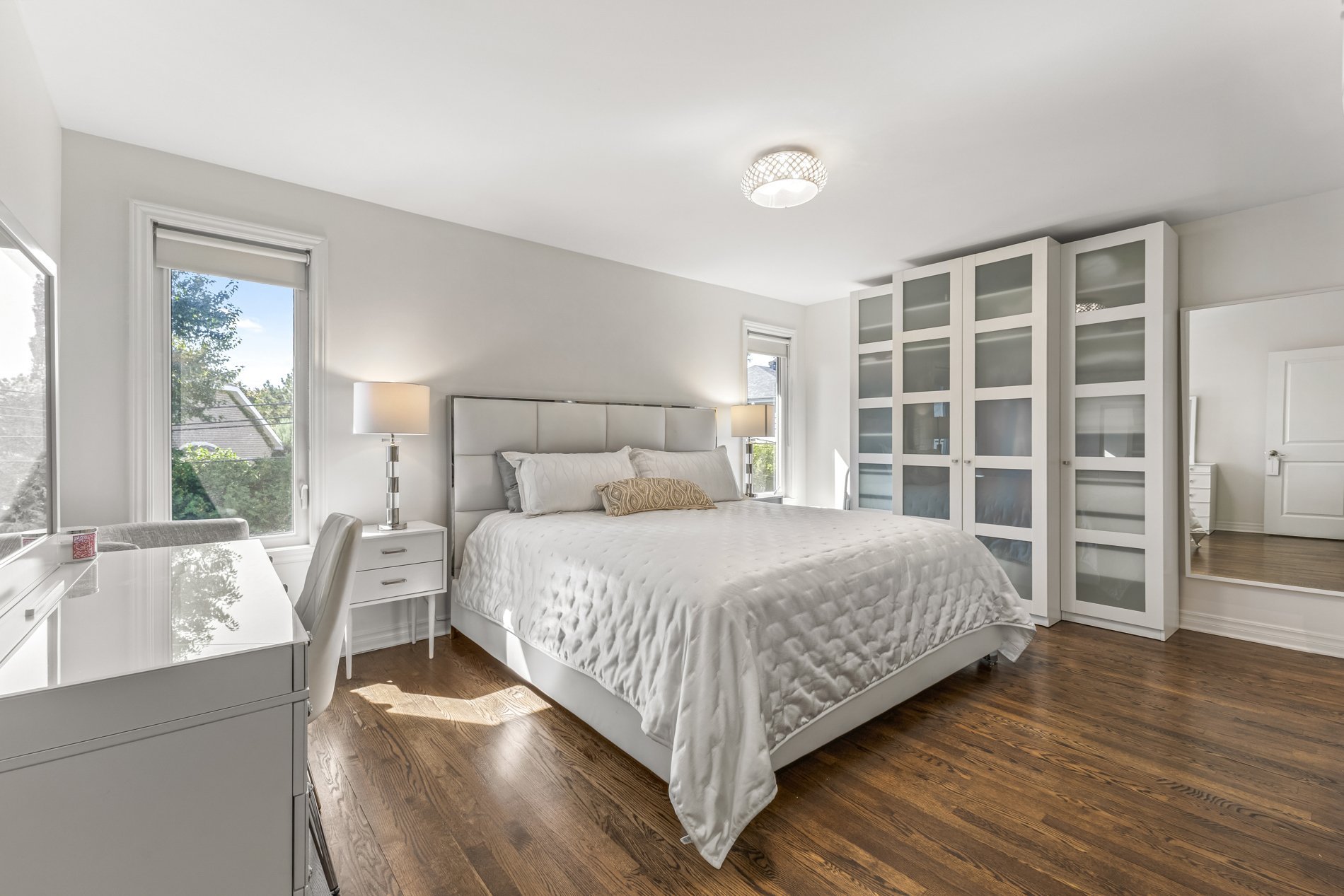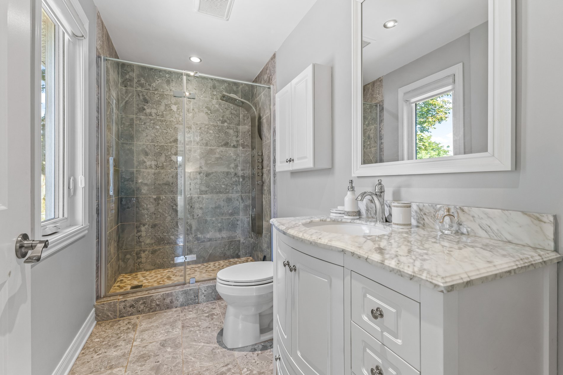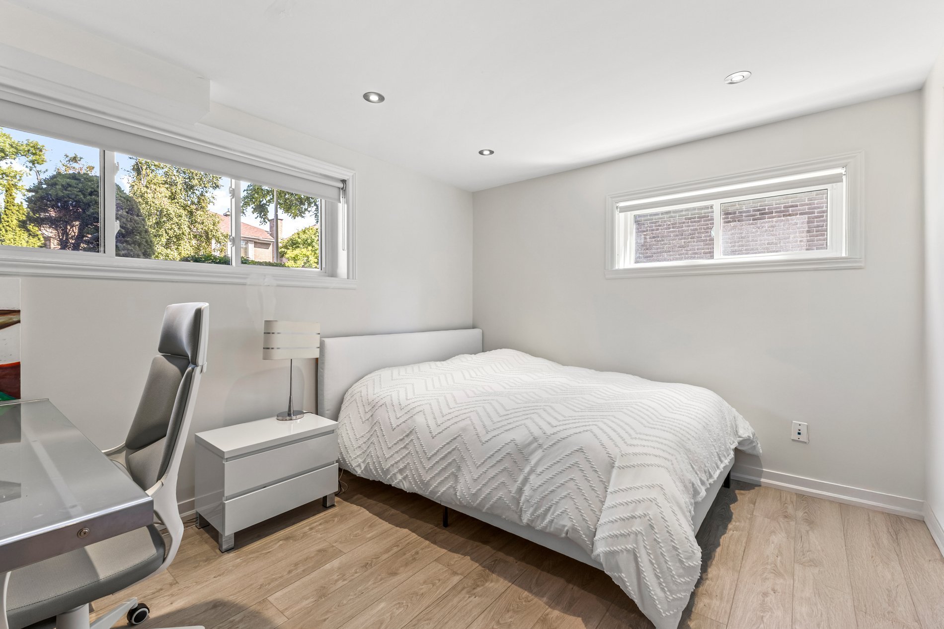 La suite principale serene comprend un walk-in, des rangements intégrés et une salle de bains luxueuse avec douche spacieuse, planchers chauffants et finitions raffinées. Deux autres chambres sont parfaites pour la famille ou un bureau. Une salle de bains familiale entièrement rénovée avec bain complète l'étage.