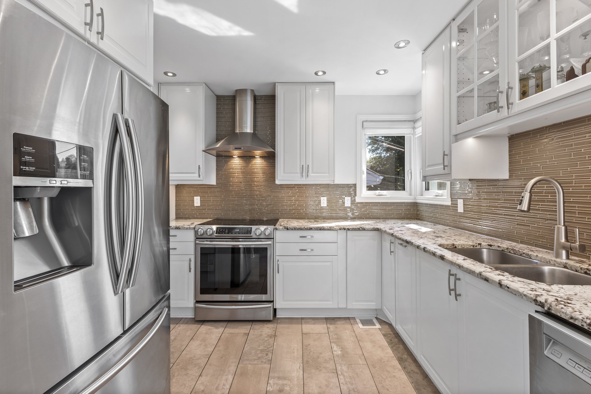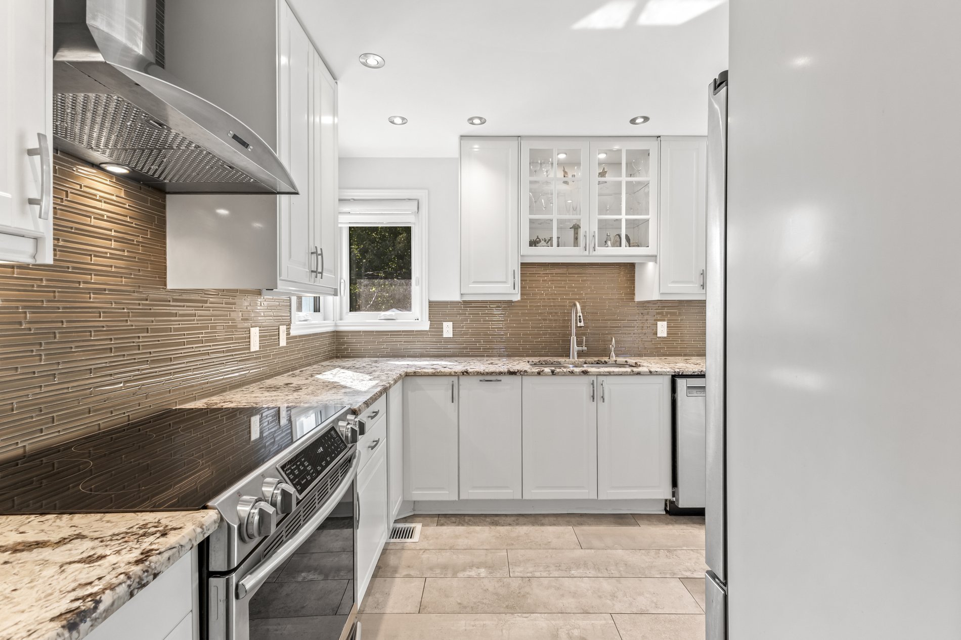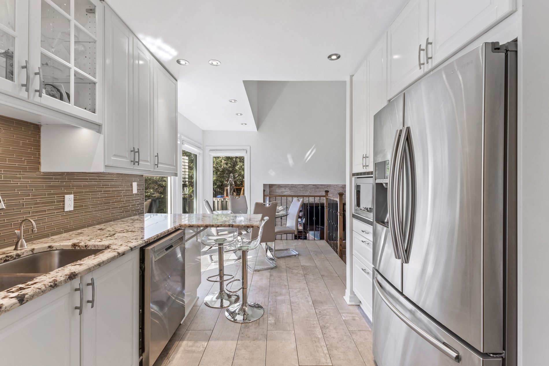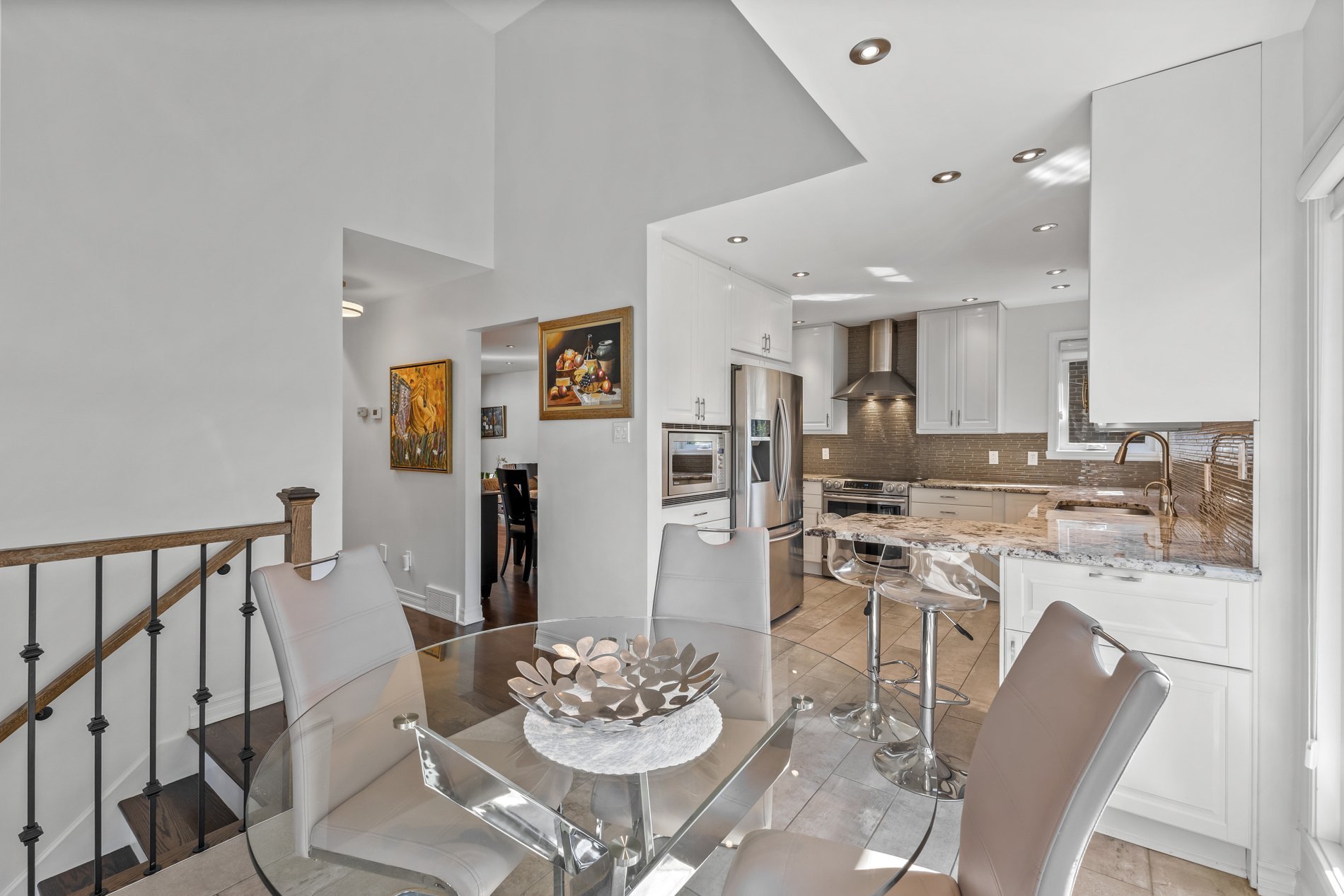 Les salons et salles à manger formels offrent un espace idéal pour recevoir. La cuisine entièrement rénovée comprend des matériaux haut de gamme, un éclairage sous et a l'intérieure des armoires, comptoirs en granit et un îlot péninsule parfait pour les repas décontractés. Électroménagers inclus: réfrigérateur, cuisinière, four, lave-vaisselle, hotte et micro-ondes encastré. Le coin repas lumineux est entouré de grandes fenêtres. Un grand garde-manger et une salle d'eau rénovée avec des finitions en pierre allient fonctionnalité et style.