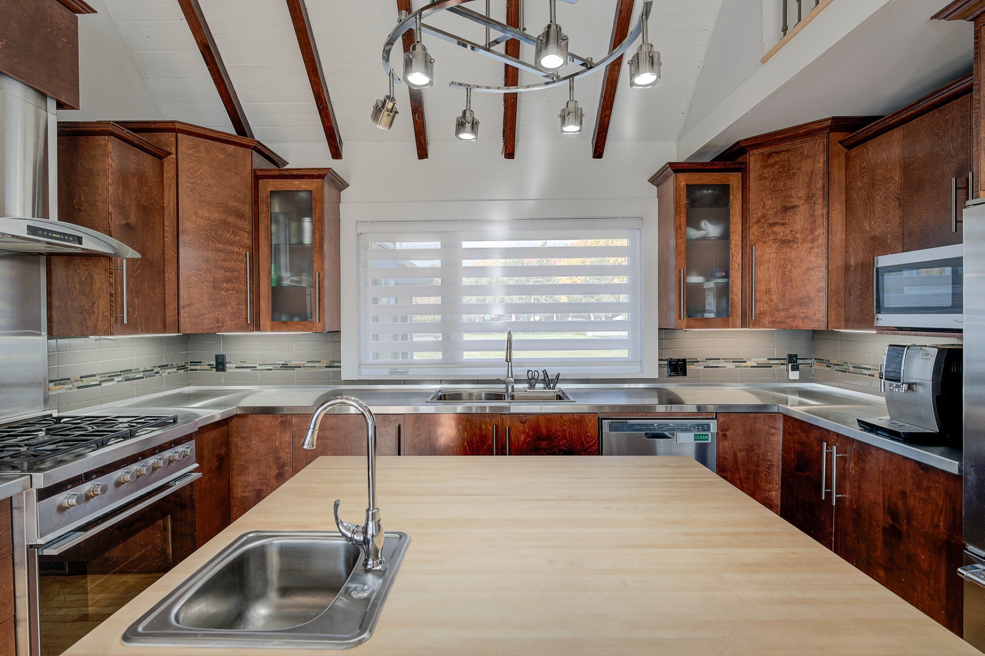 Quatre garages impressionnants : Deux construits en 2016, équipés de portes de 8 pieds, plafonds hauts, un bureau lumineux avec vue sur le fleuve et une salle d'eau. Le garage principal dispose d'une mezzanine de rangement idéale.