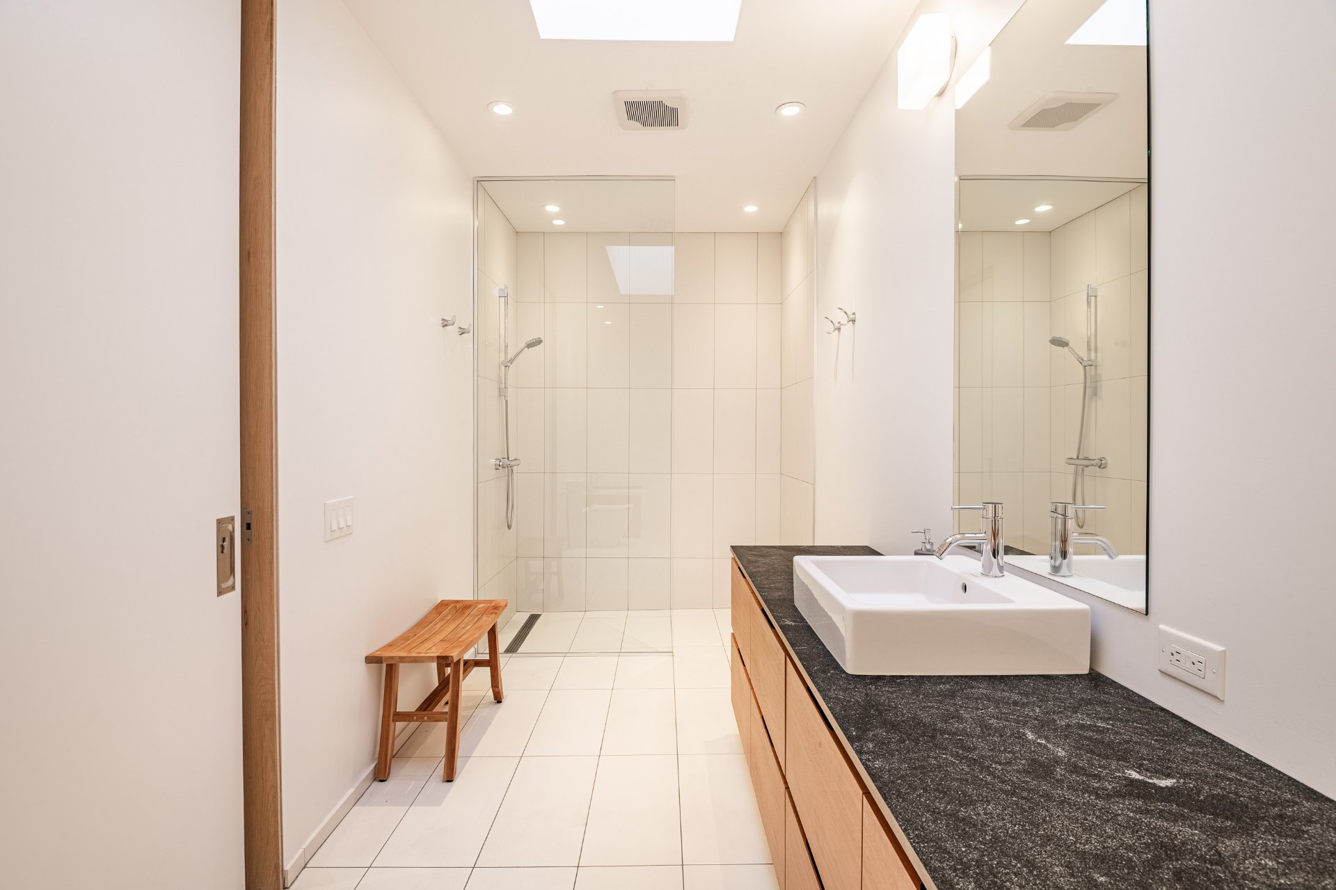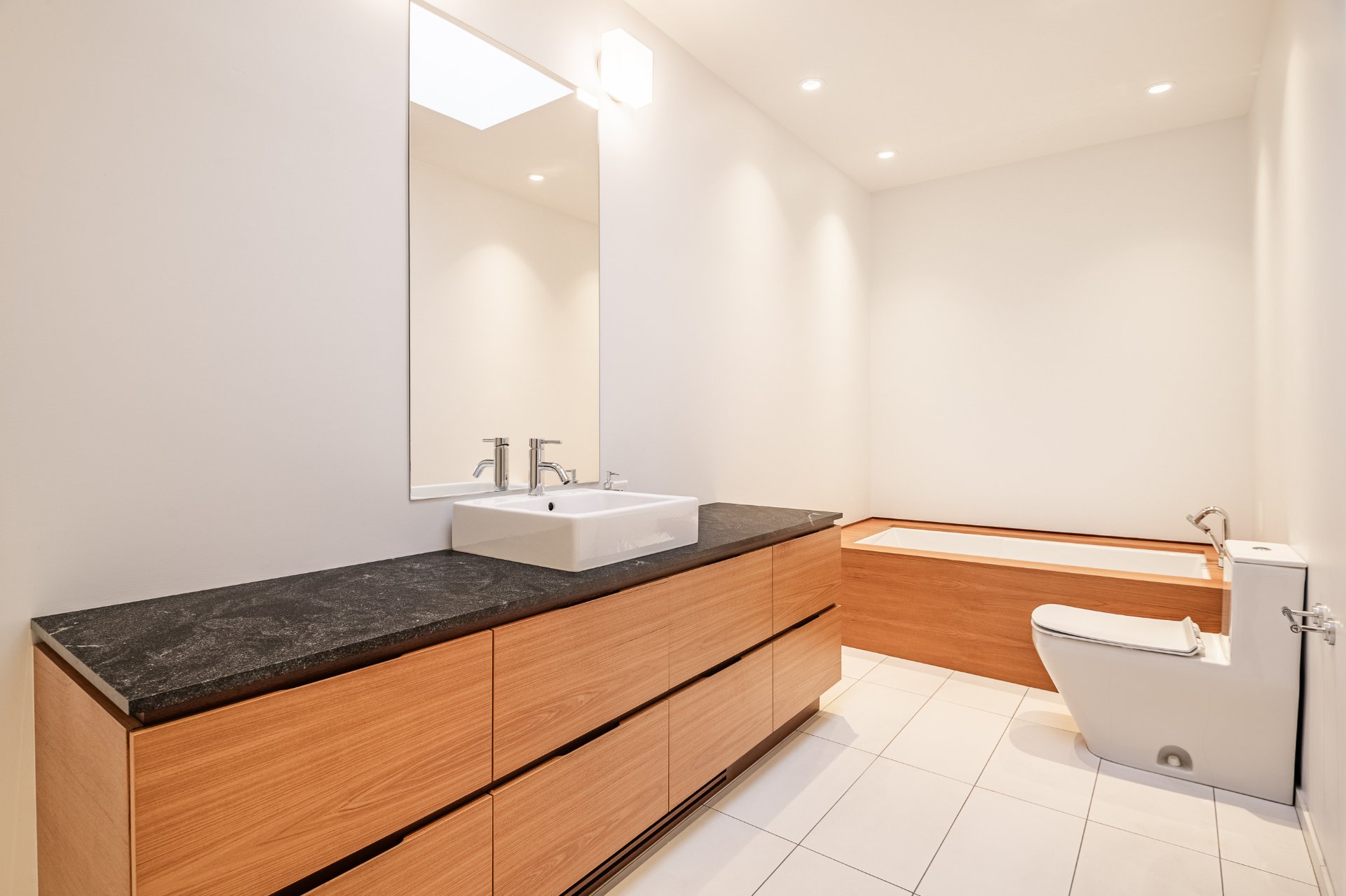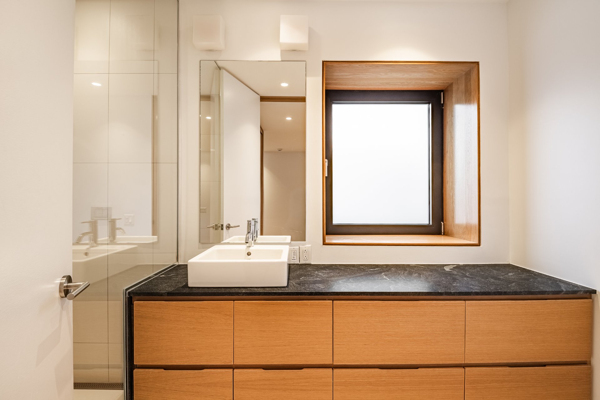 * Salle de bain attenante avec puits de lumière, comptoir de granit et beaucoup de rangement