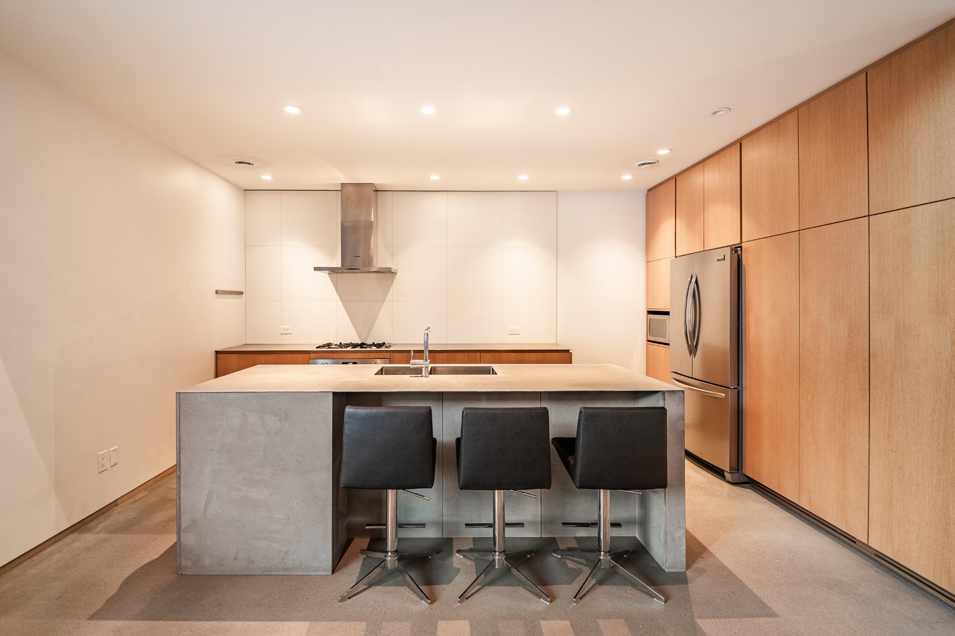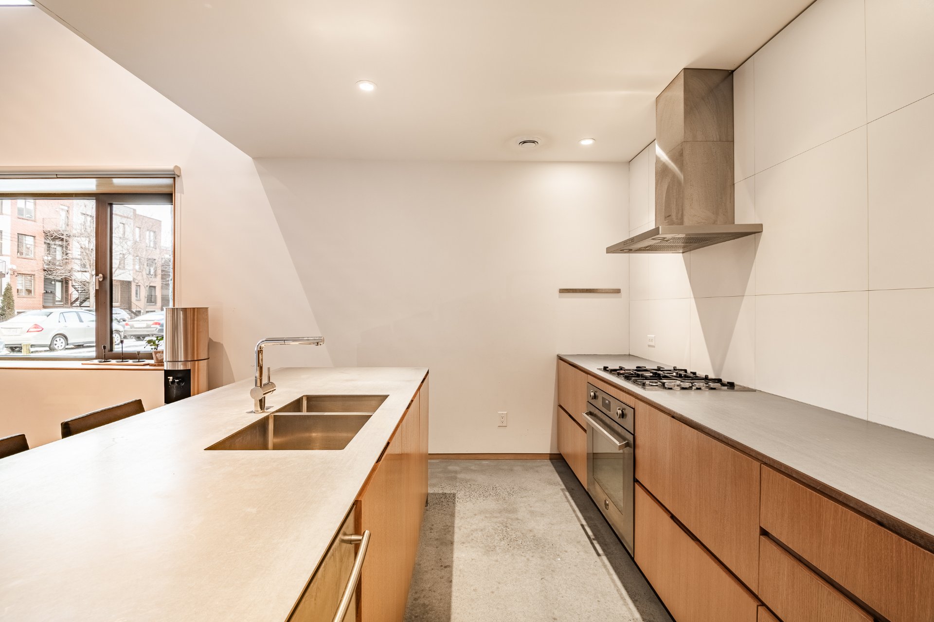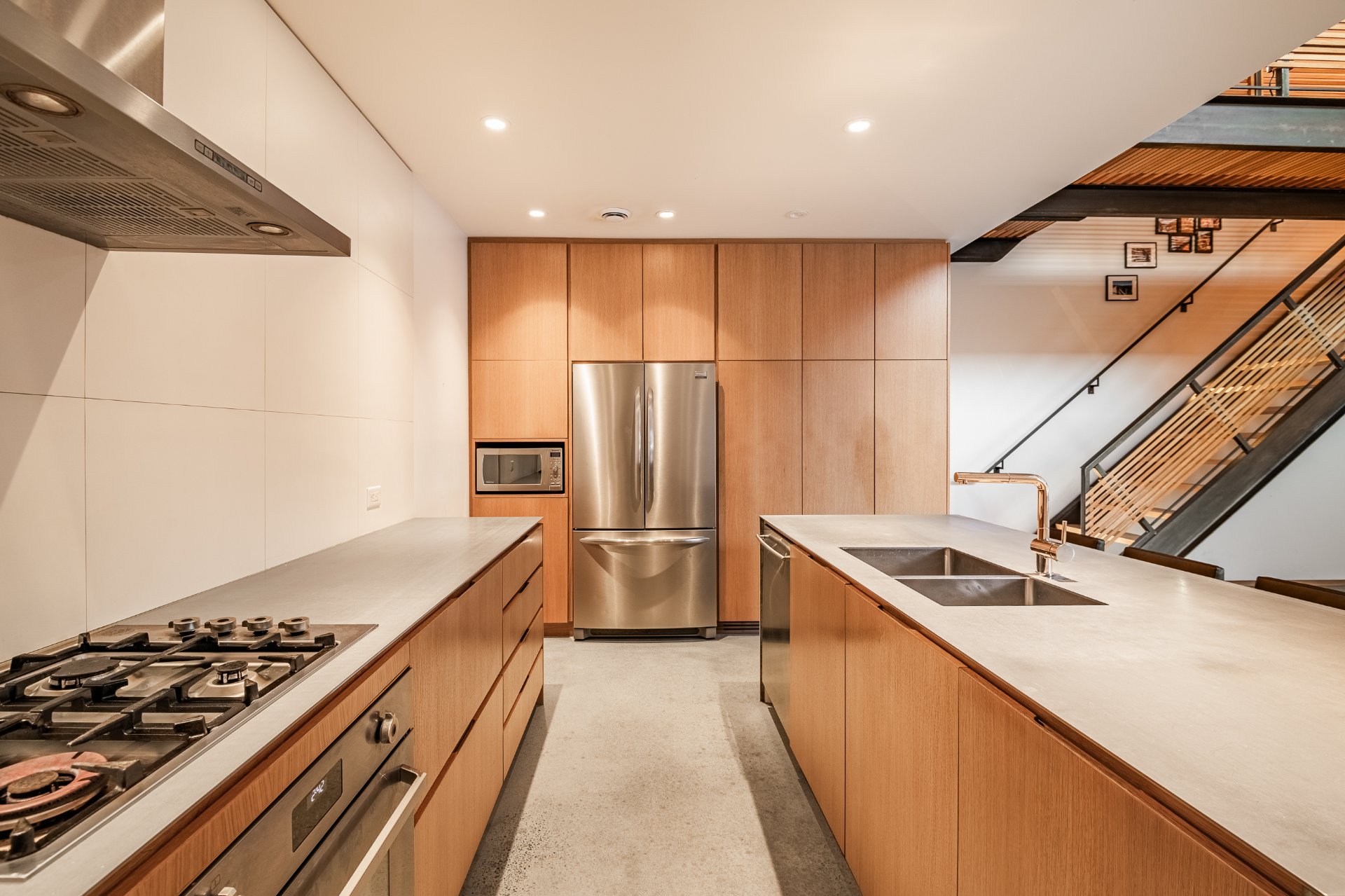 * Cuisine contemporaine 2 tons avec armoire en chêne et comptoir en inox et béton