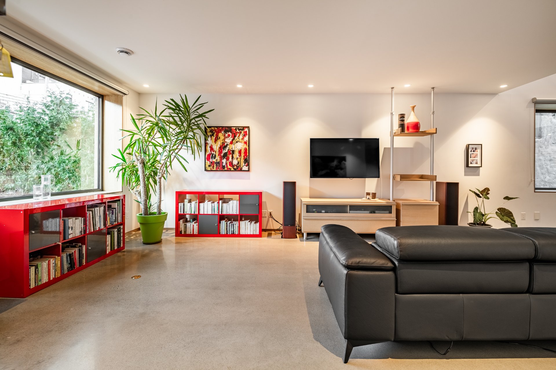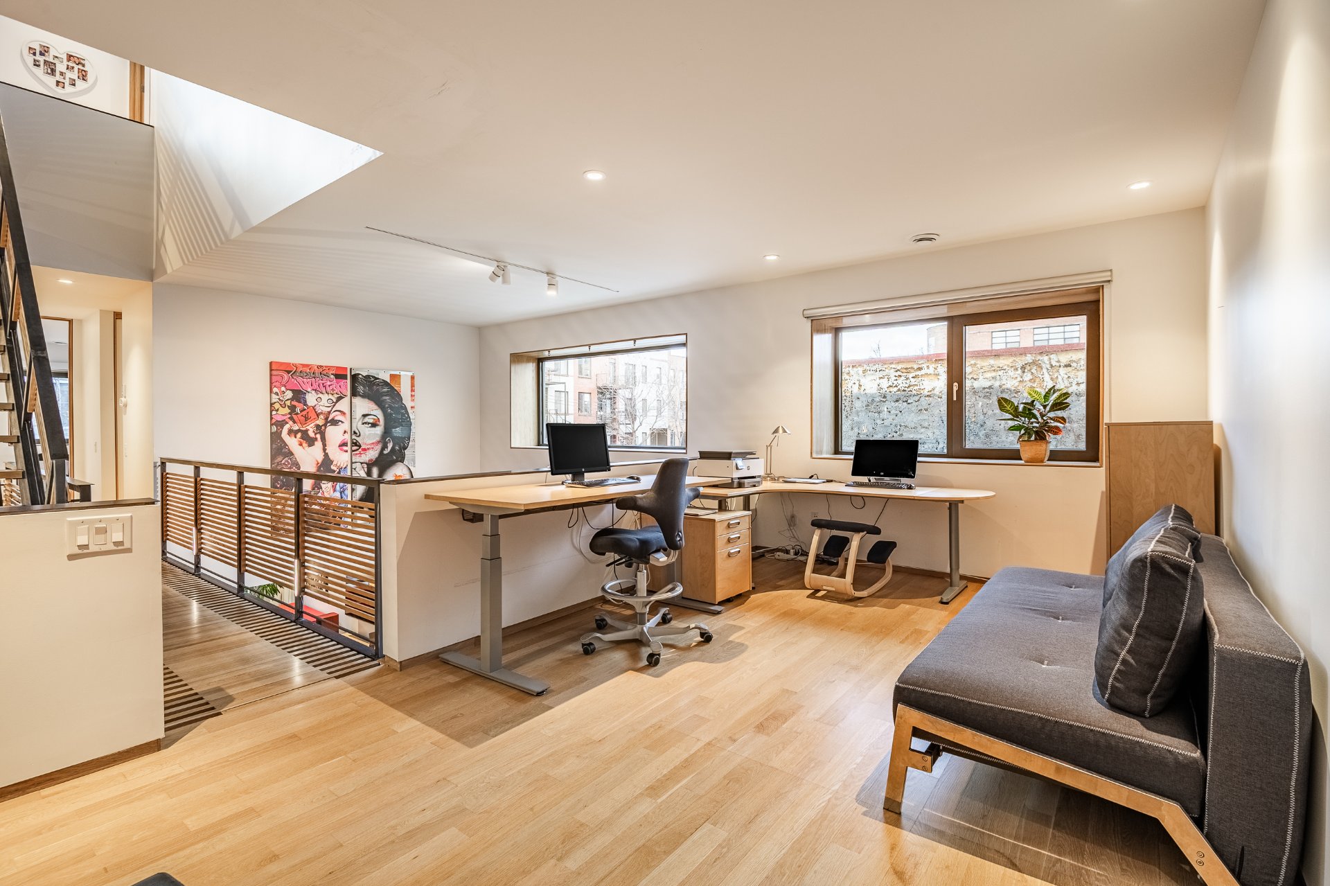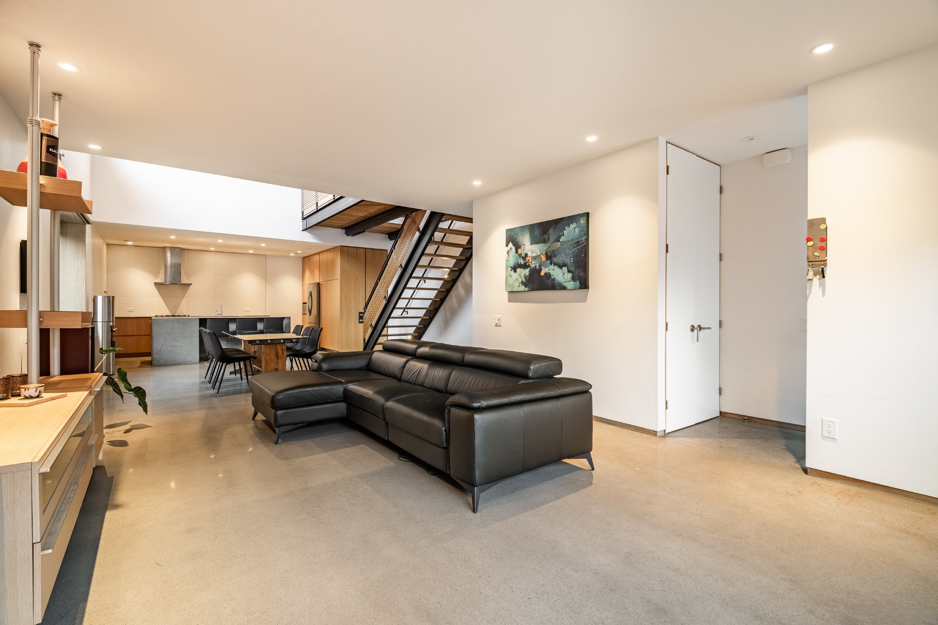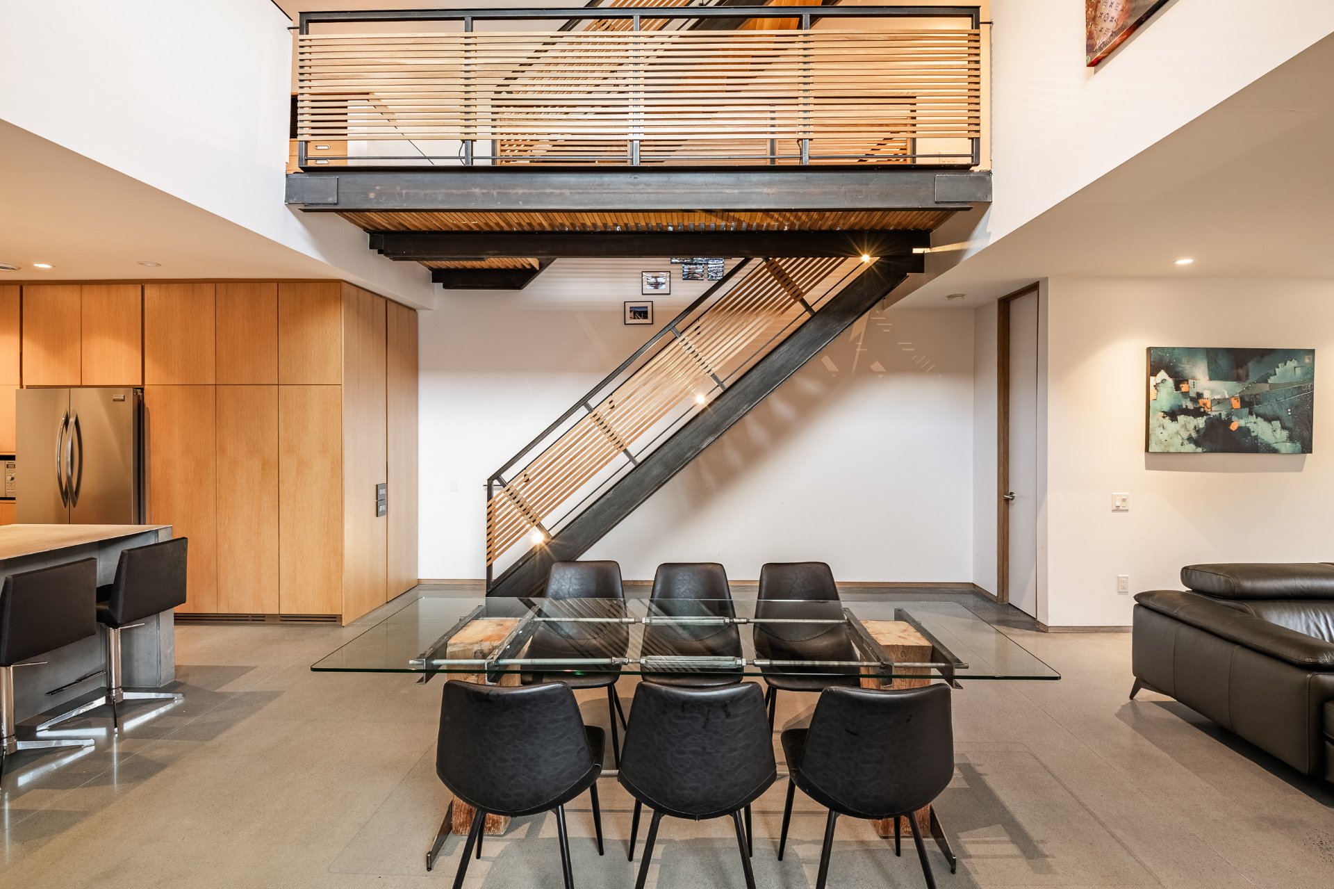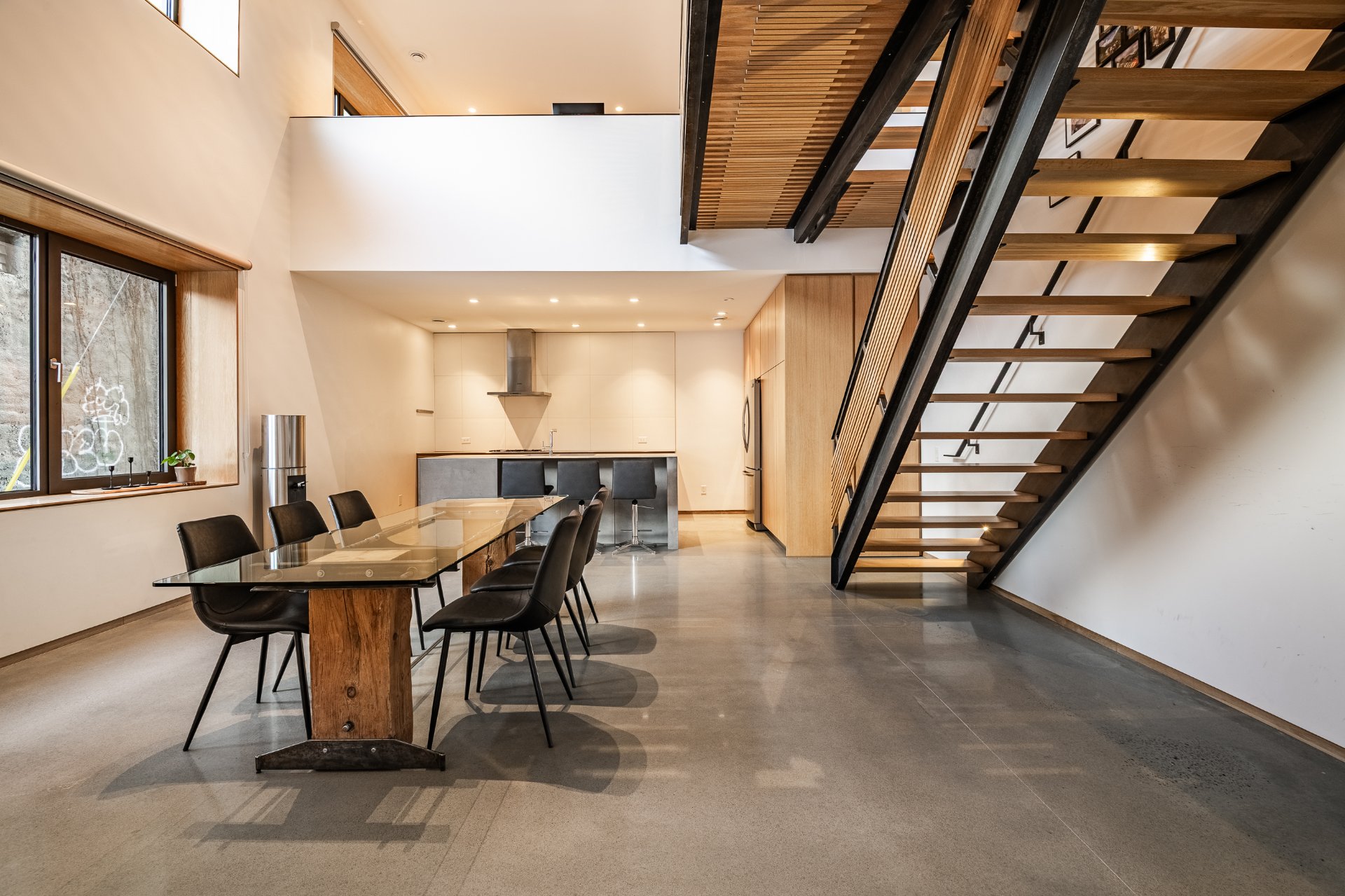 Répartie sur trois niveaux, elle propose deux chambres à coucher, deux salles de bain, une salle d'eau ainsi qu'un vaste bureau en mezzanine surplombant l'aire de vie, accentuant la sensation d'espace et de luminosité. Les hauteurs de plafond dépassant 33 pieds, les puits de lumière, le béton apparent, les passerelles en métal et les détails en chêne blanc définissent une architecture spectaculaire et intemporelle.