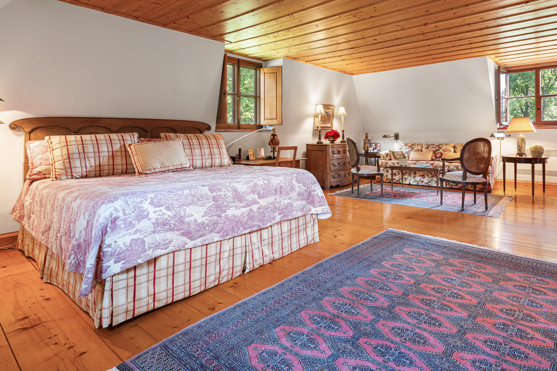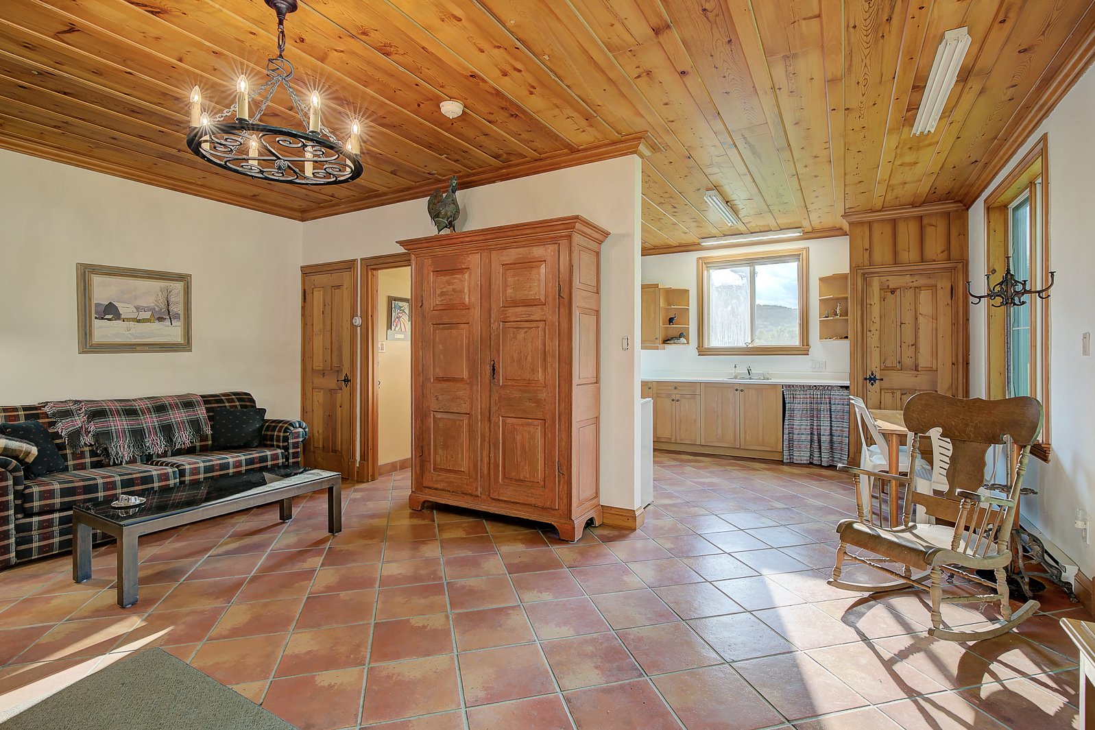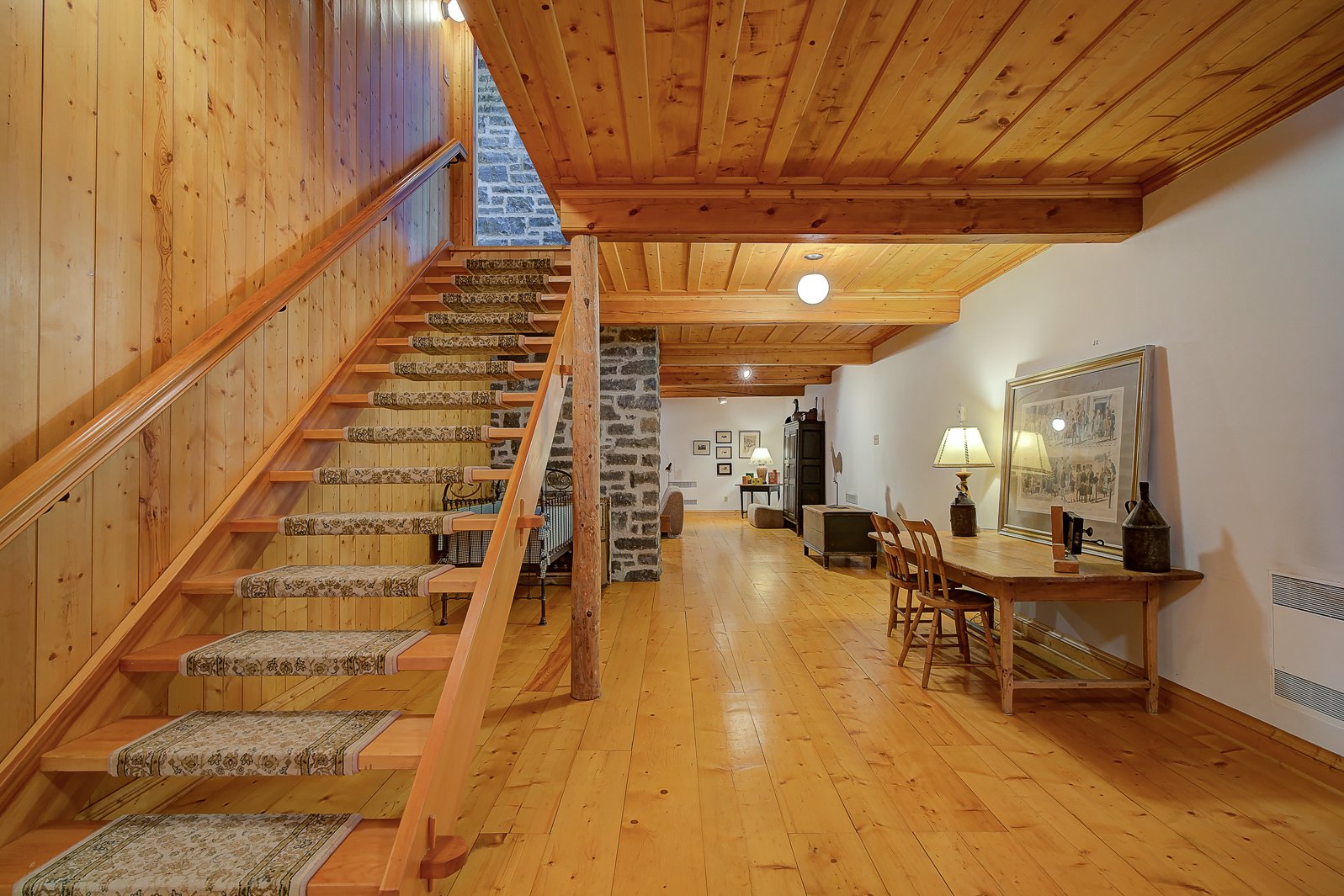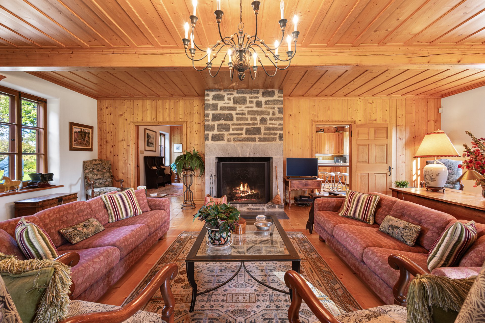 Le salon, pièce maîtresse du rez-de-chaussée, séduit par son volume très généreux, ses poutres en bois au plafond et son superbe foyer au bois, créant une atmosphère à la fois chaleureuse et réconfortante. Idéal pour se détendre en famille ou accueillir des invités, ce salon est un véritable coeur de vie.