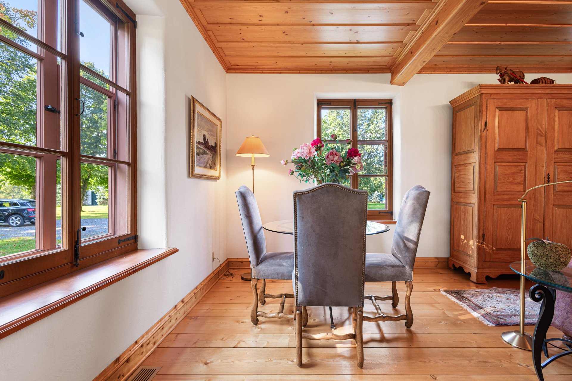 La cuisine, lumineuse et fonctionnelle, incarne un parfait équilibre entre praticité et sophistication. De généreux comptoirs et de nombreuses armoires offrent un espace de travail et de rangement optimal. Un évier sous la fenêtre permet de contempler la nature, et une porte mène directement à la cour extérieure. La cuisine s'ouvre sur une vaste salle à manger baignée de lumière naturelle grâce à une fenestration sur deux versants de murs, parfaite pour des moments conviviaux en toute saison.